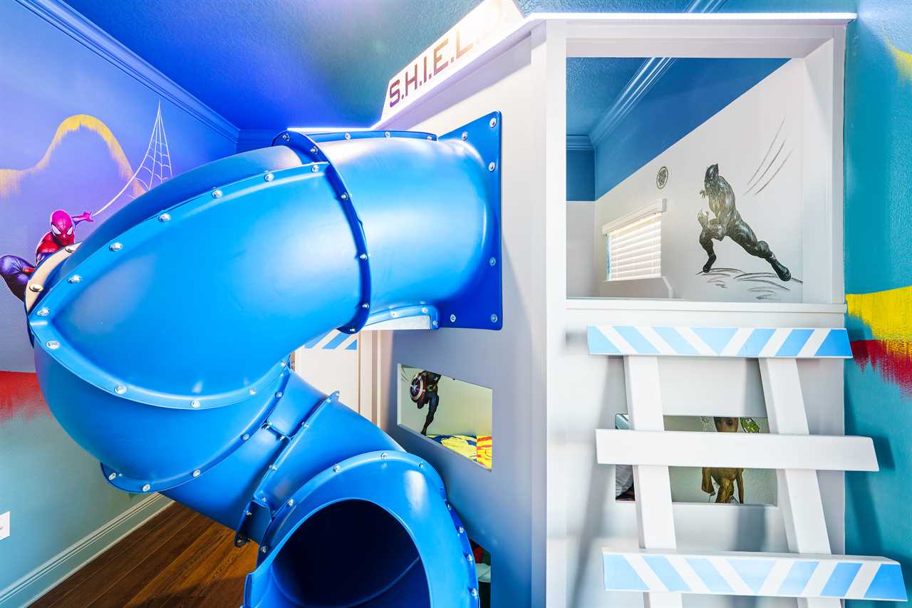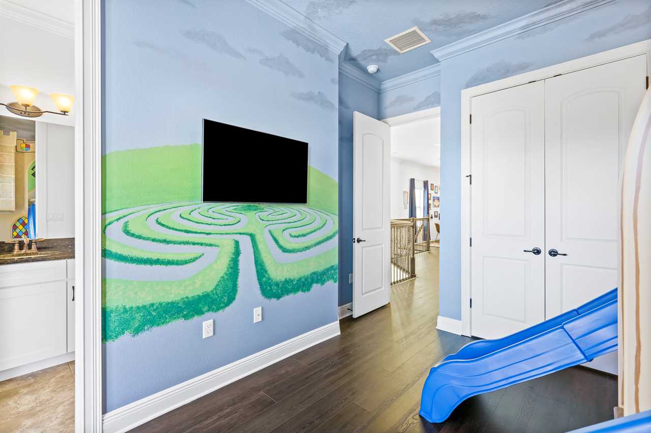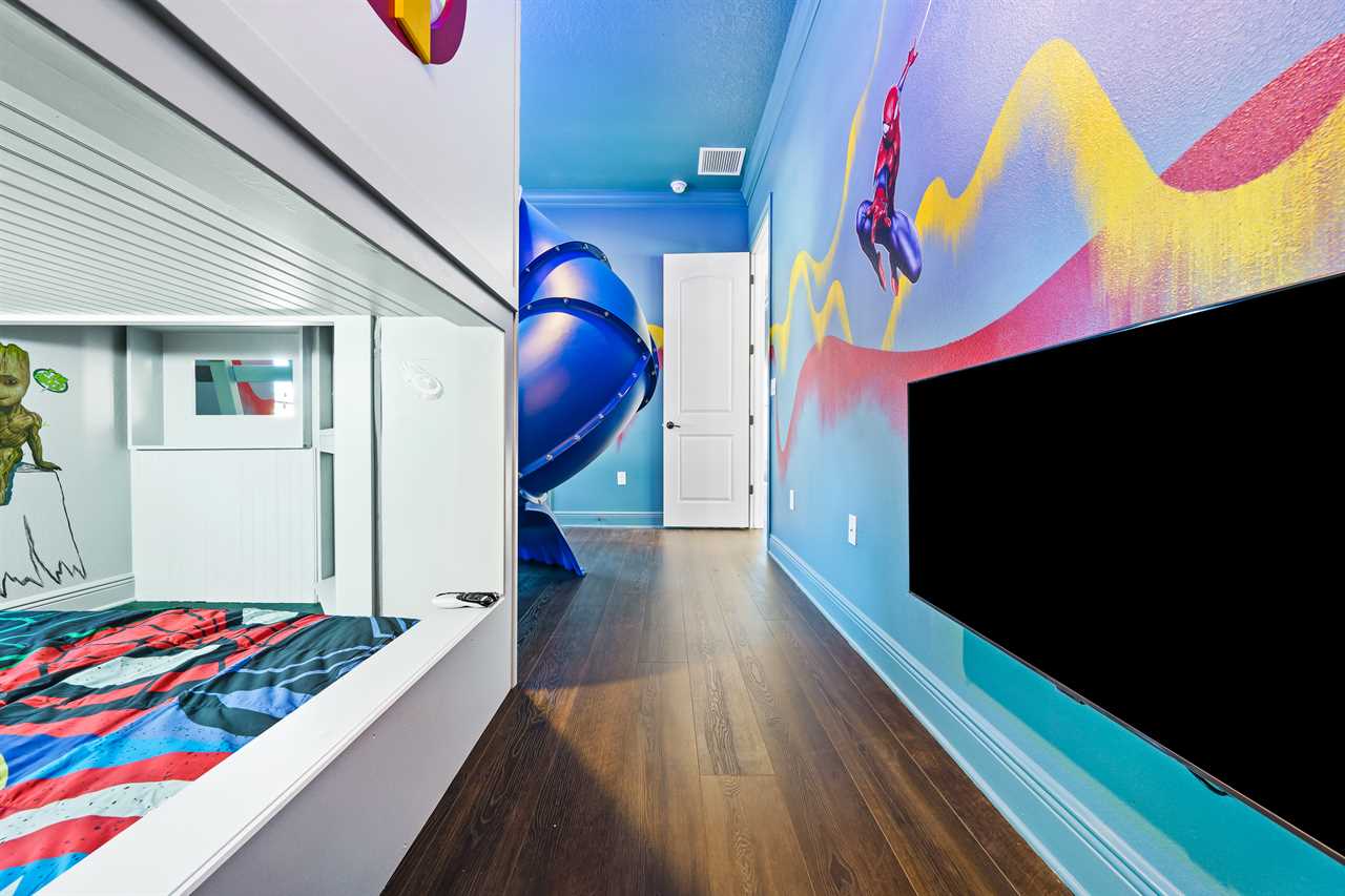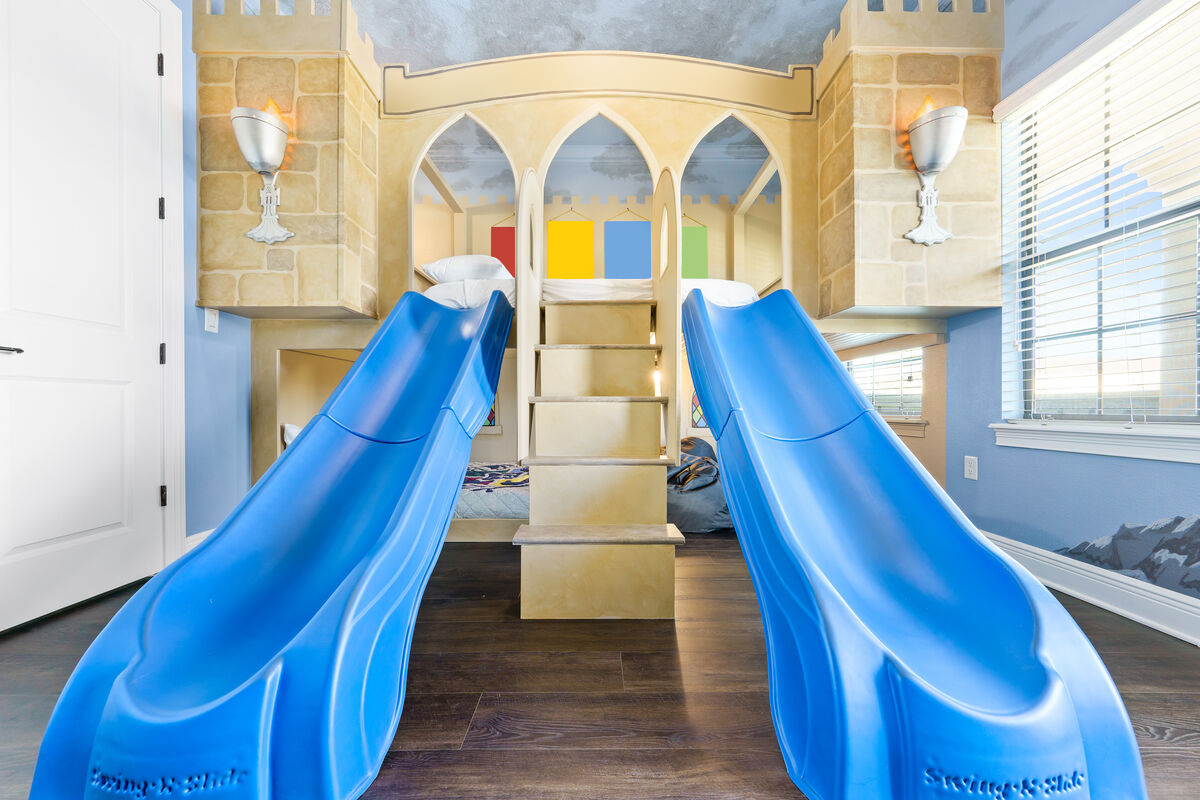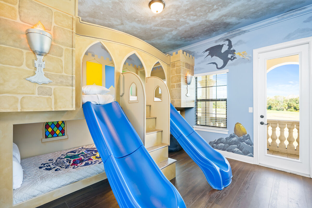 The large Master bedroom includes an oversized soaking tub and overlooks the crystal-clear swimming pool, as well as a nature preserve from its private balcony; the Hollywood-themed room brings comfort, class, and glamour to the most discerning of guests. The edgy character room includes luxury design and contemporary vibes infused with unique pop-art interpretations of the world's most famous mouse; the superhero room includes custom-built bunk beds, a tube slide, mind-blowing wall murals, and an authentic 7-foot tall superhero statue; and the wizard room includes a custom-build castle bunk-bed set-up, double slides out of the top bunks, epic wall murals, custom lighting and more!