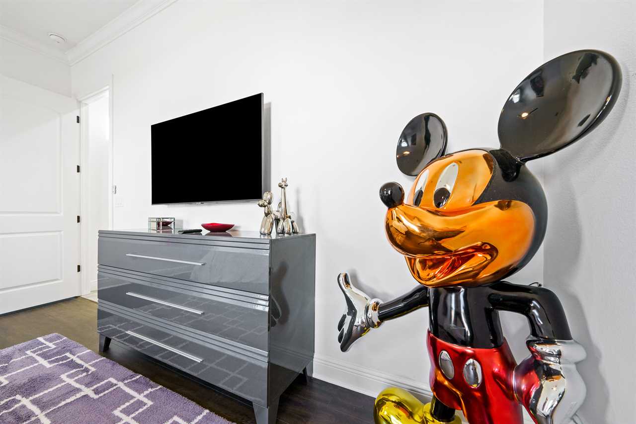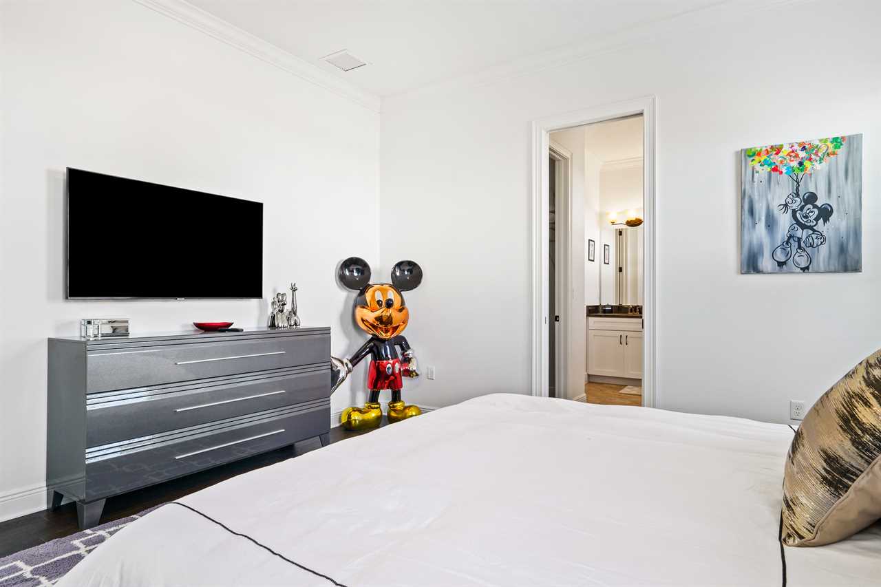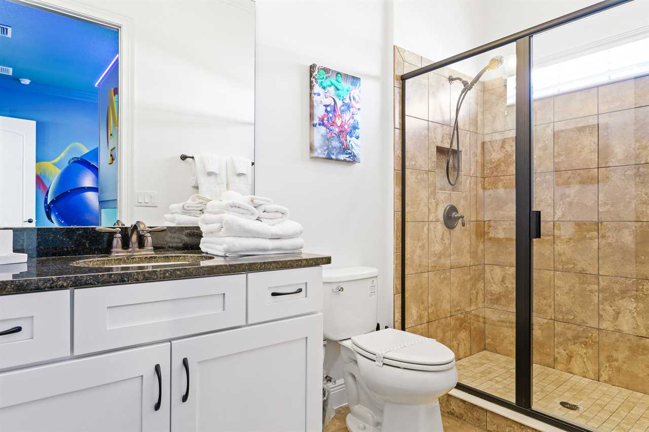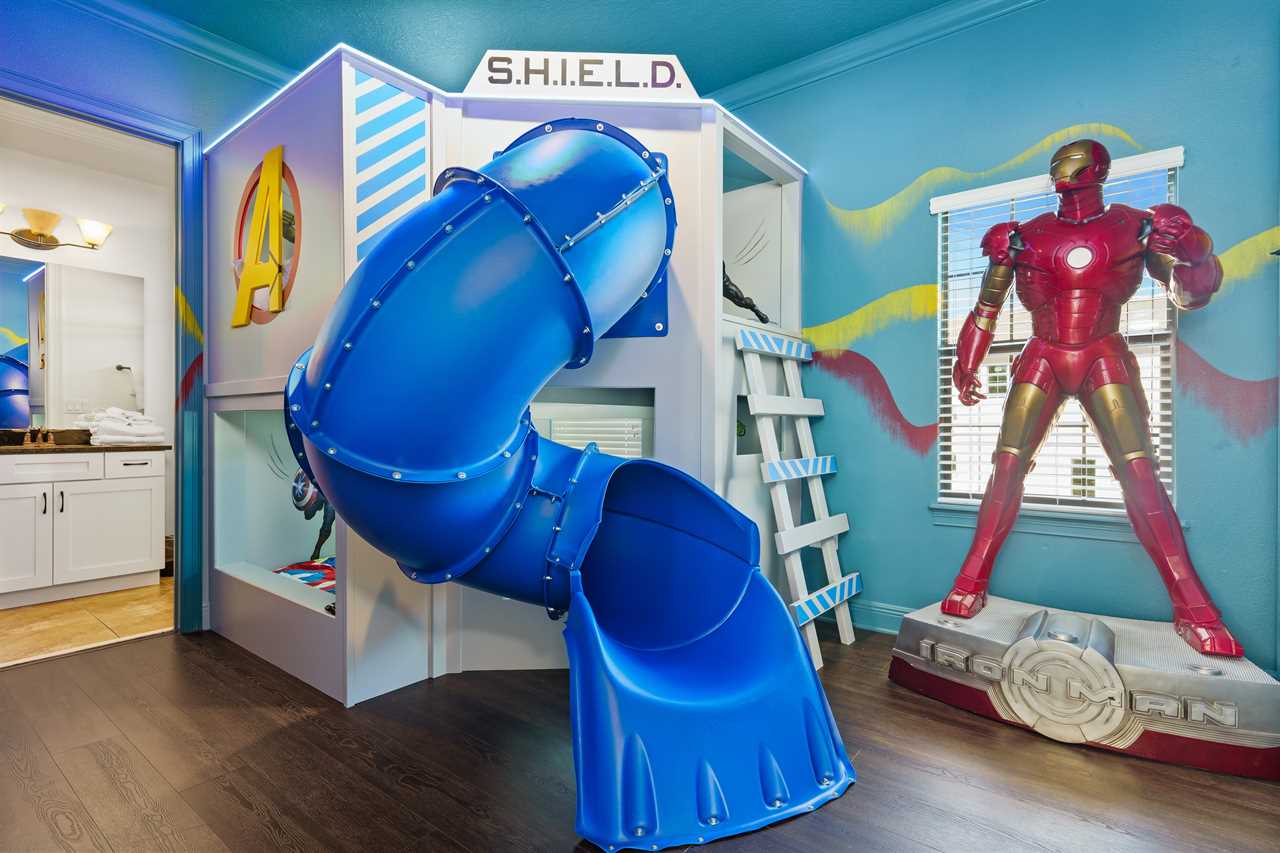 The large Master bedroom includes an oversized soaking tub and overlooks the crystal-clear swimming pool, as well as a nature preserve from its private balcony; the Hollywood-themed room brings comfort, class, and glamour to the most discerning of guests. The edgy character room includes luxury design and contemporary vibes infused with unique pop-art interpretations of the world's most famous mouse; the superhero room includes custom-built bunk beds, a tube slide, mind-blowing wall murals, and an authentic 7-foot tall superhero statue; and the wizard room includes a custom-build castle bunk-bed set-up, double slides out of the top bunks, epic wall murals, custom lighting and more!