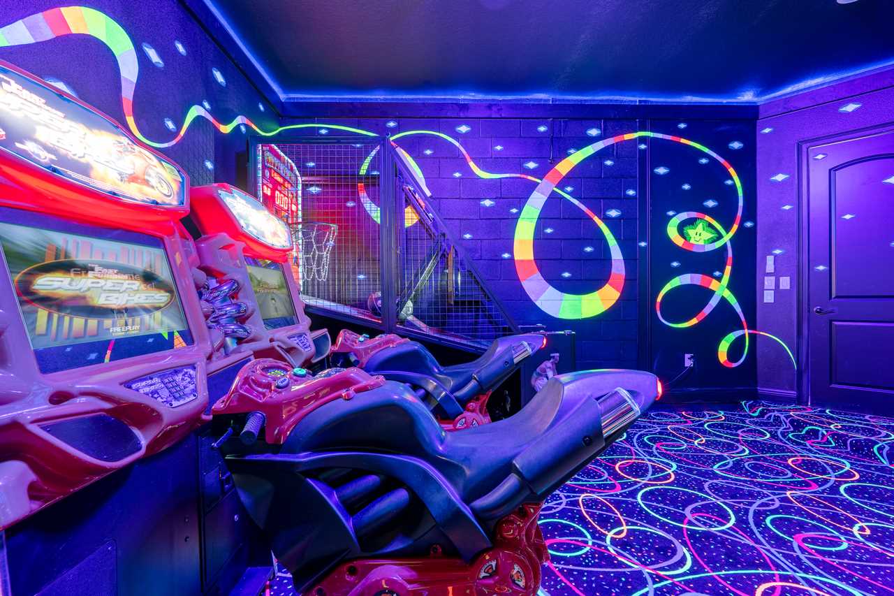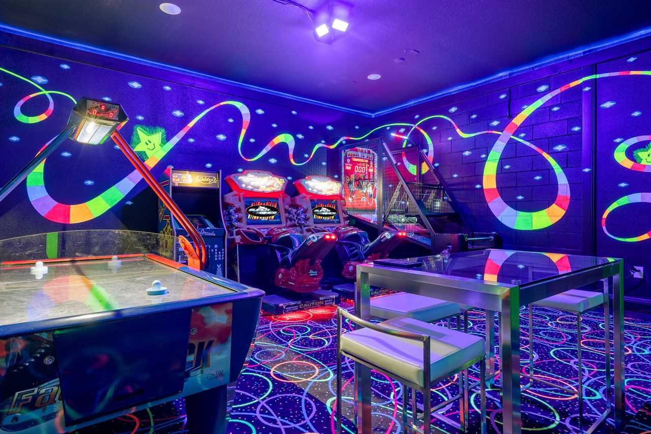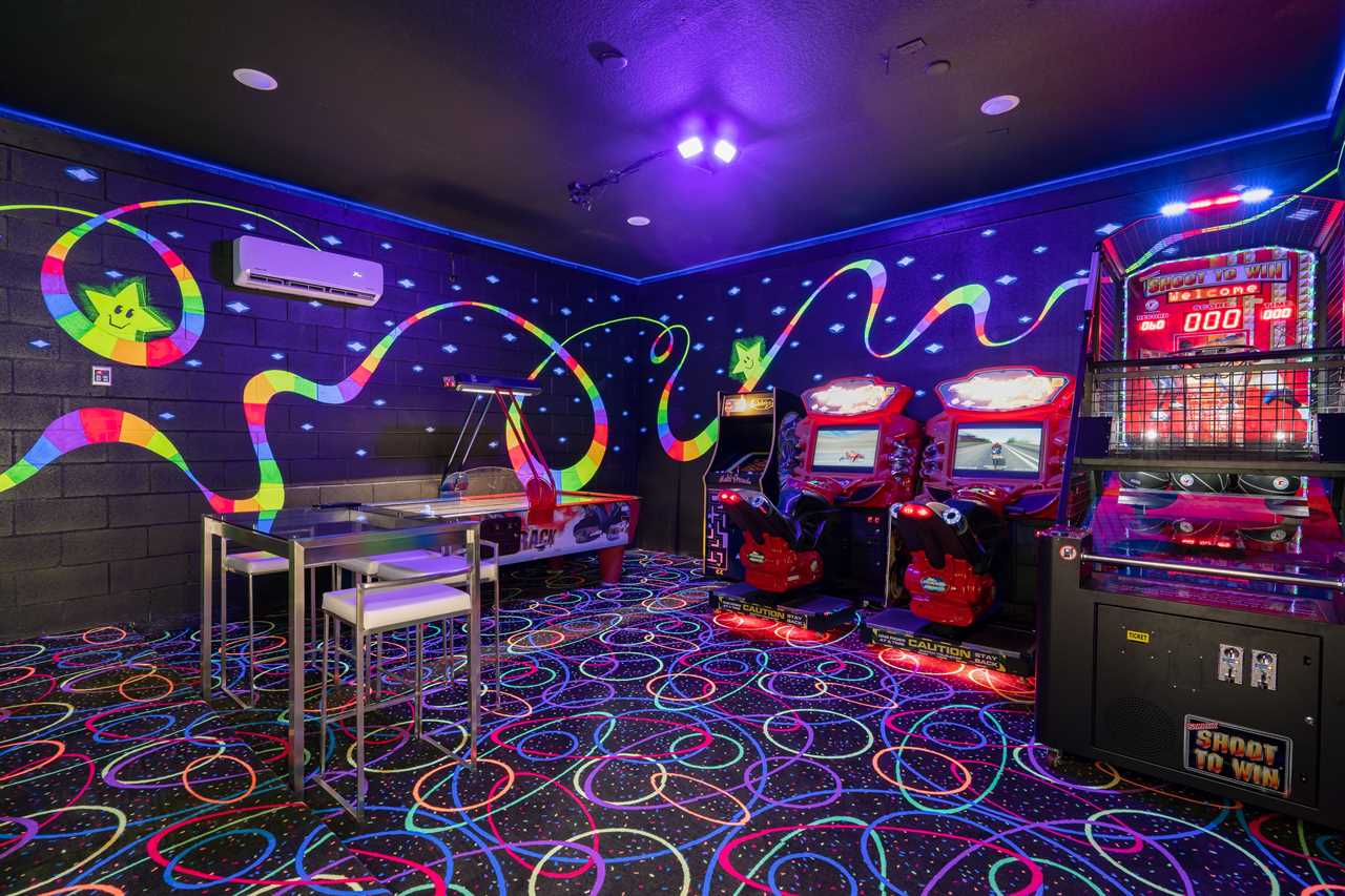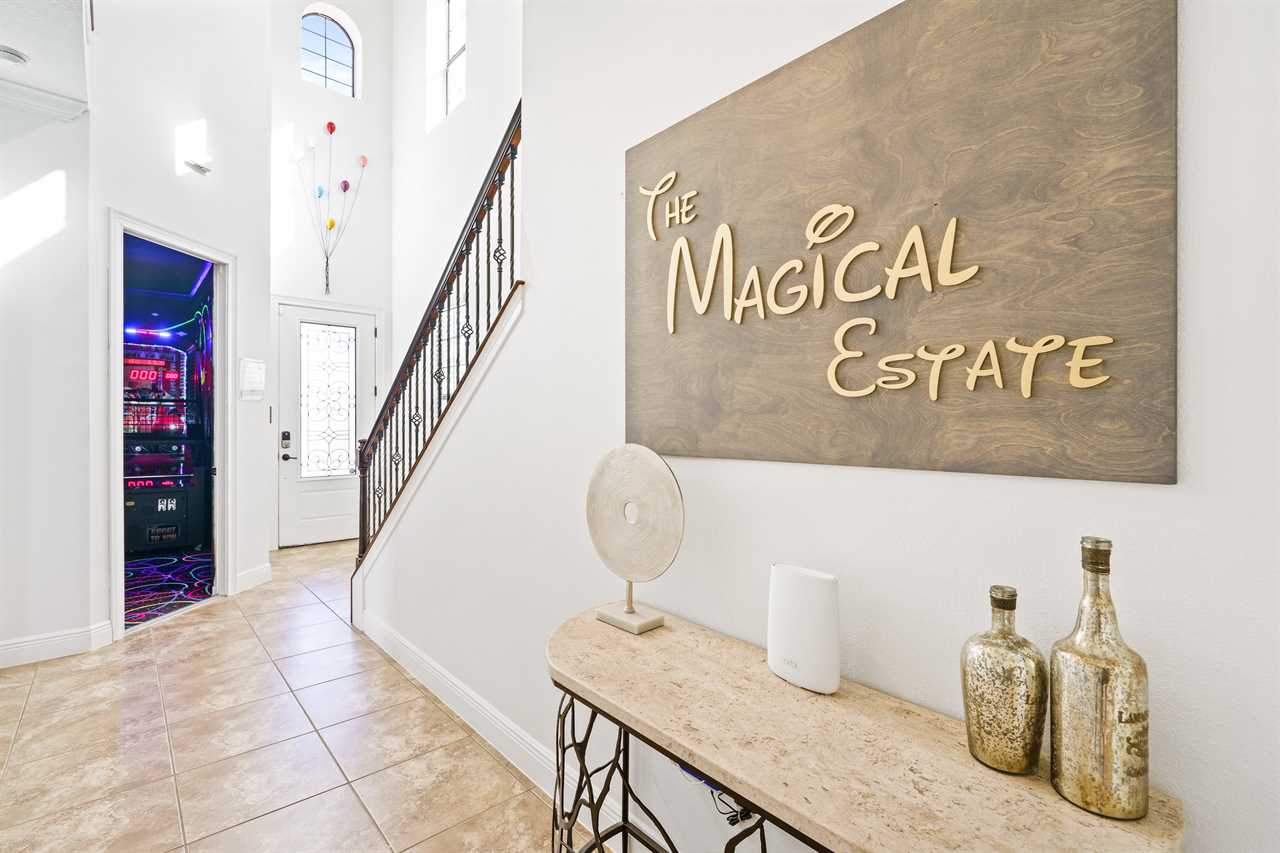 The Magical Estate is a 5 bedroom (all en-suite), 3,200 sq foot treasure that features countless activities for all ages! The private pool/spa and spacious pool deck include plenty of lounge chairs and countless games and activities. This includes pool basketball, cornhole, and larger-than-life ConnectFour! The outdoor kitchen and oversized dining/seating include an outdoor TV, the on-site Las Vegas-themed casino, and a lounge for adults featuring poker and token-based slots. the state-of-the-art arcade and game room, the next-level wizard, and superhero-themed rooms including 3 different commercial playground quality slides, and an unparalleled pop art collection that fills the walls, are just a few of the features that set this home apart! There's even an on-site laundry room with brand-new machines for your convenience.
