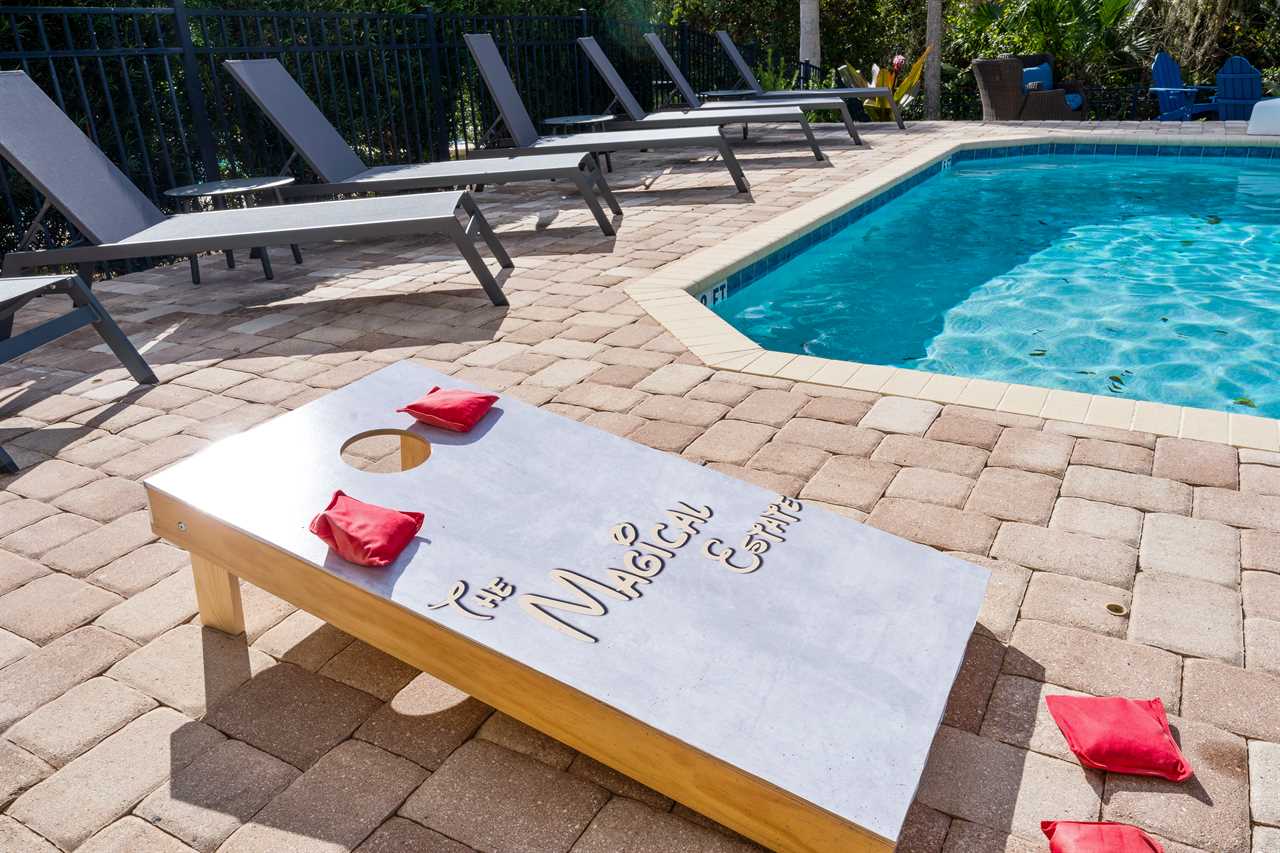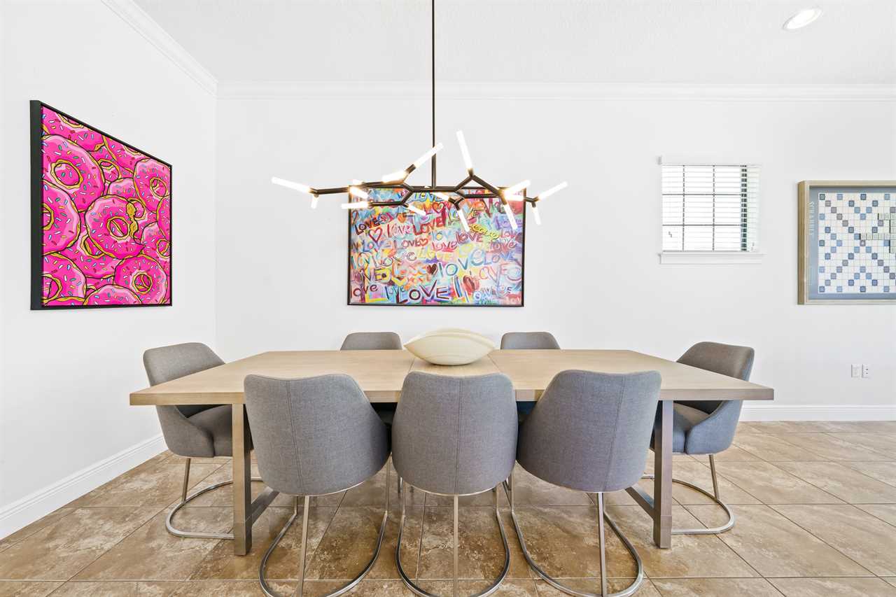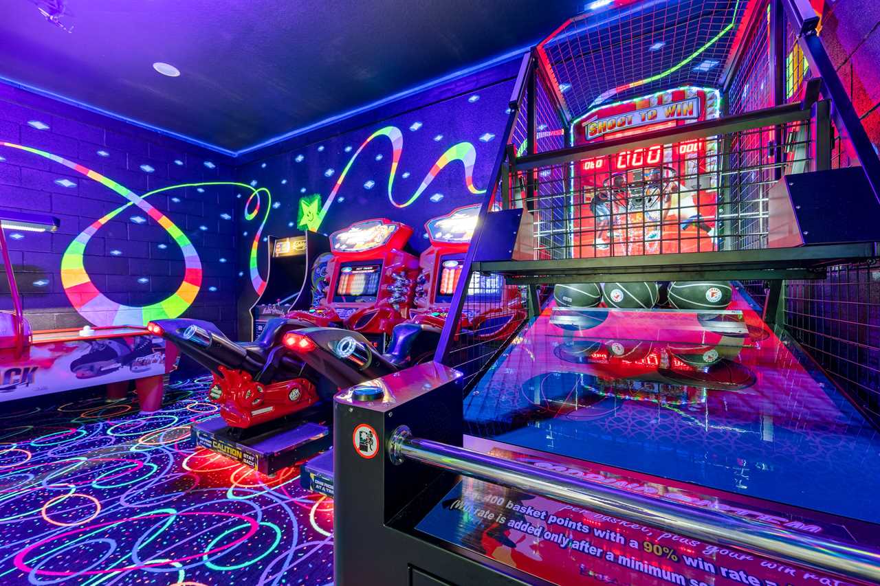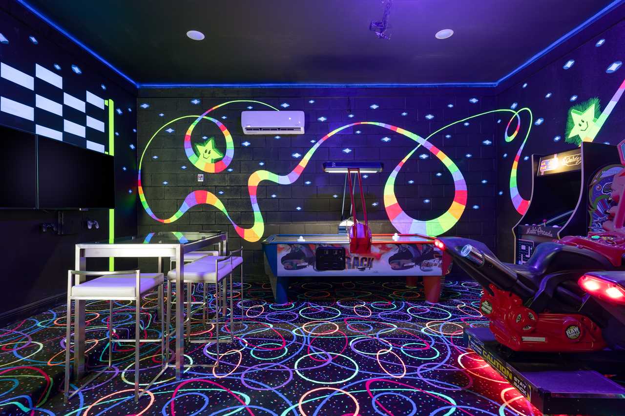 The Magical Estate is a 5 bedroom (all en-suite), 3,200 sq foot treasure that features countless activities for all ages! The private pool/spa and spacious pool deck include plenty of lounge chairs and countless games and activities. This includes pool basketball, cornhole, and larger-than-life ConnectFour! The outdoor kitchen and oversized dining/seating include an outdoor TV, the on-site Las Vegas-themed casino, and a lounge for adults featuring poker and token-based slots. the state-of-the-art arcade and game room, the next-level wizard, and superhero-themed rooms including 3 different commercial playground quality slides, and an unparalleled pop art collection that fills the walls, are just a few of the features that set this home apart! There's even an on-site laundry room with brand-new machines for your convenience.