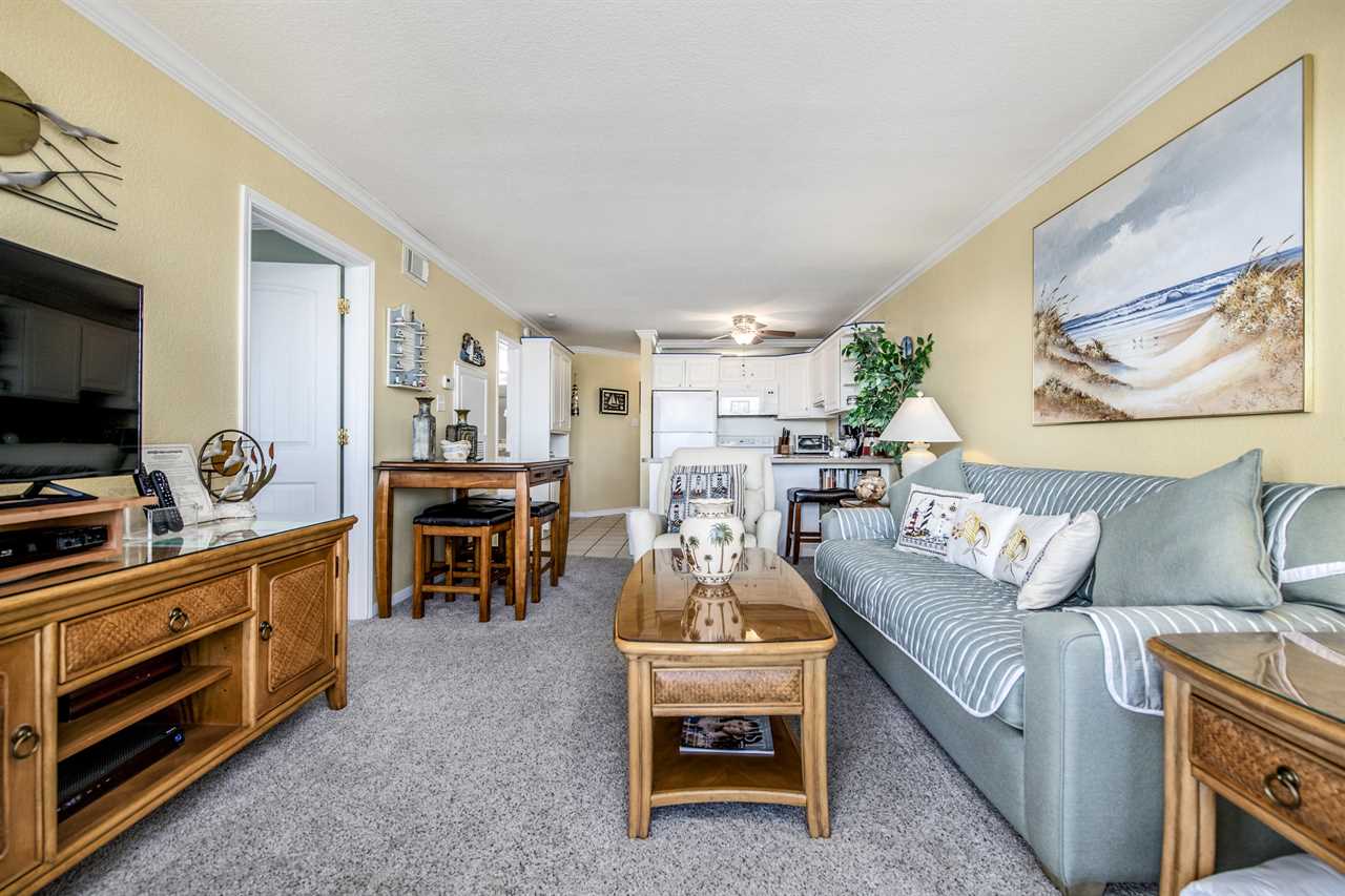 Living Area: Step into a cozy living room designed for relaxation, where soft, soothing colors create a tranquil ambiance. Plush sofas and an oversized armchair invite you to sink in and unwind.