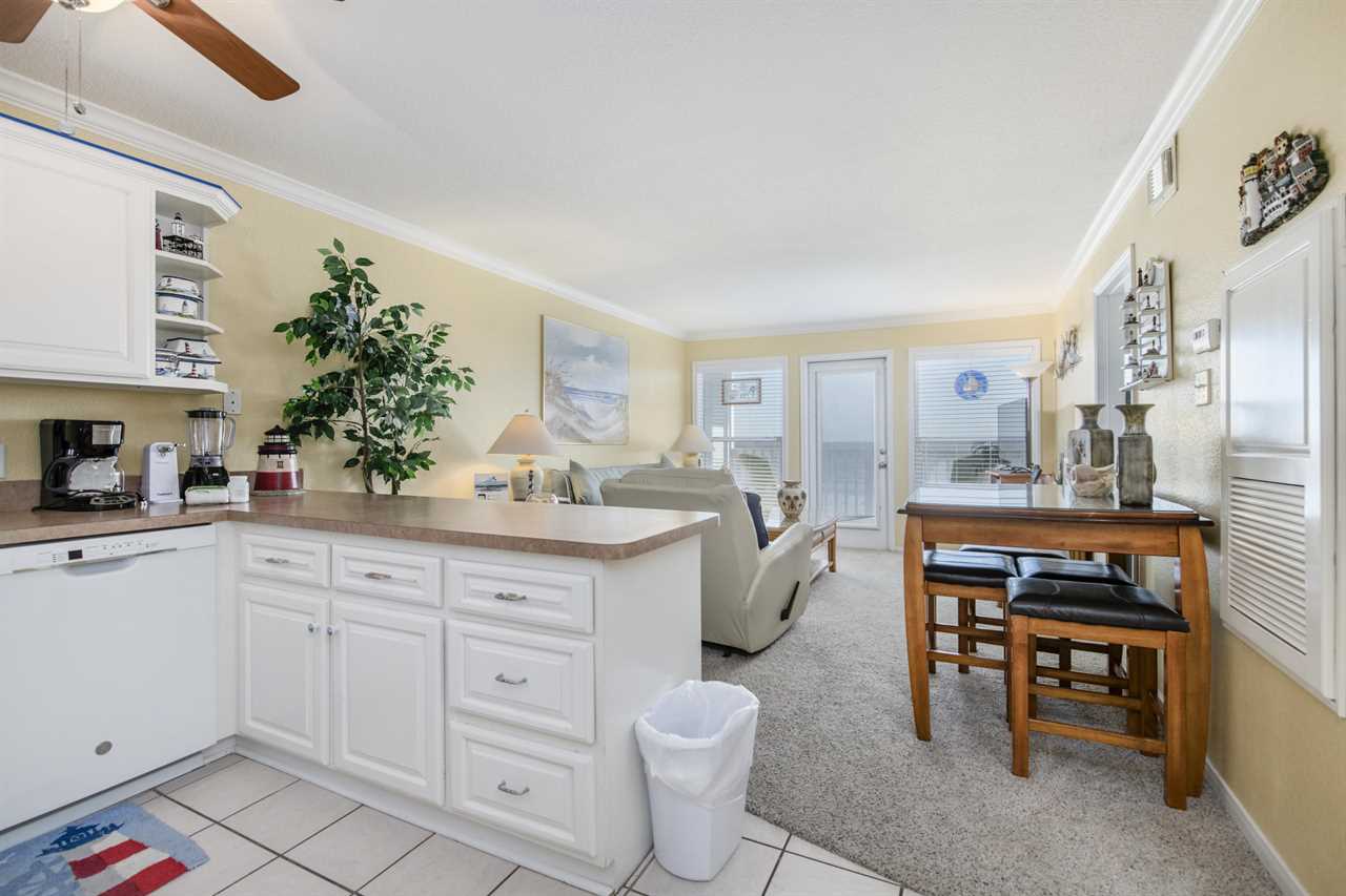 Dining & Kitchen Area: This bright and airy kitchen offers a simple yet functional design with plenty of counter and cabinet space for all your cooking needs. The open layout includes a cozy breakfast bar with seating for two, perfect for casual meals or morning coffee. Just steps away, a small dining table provides additional seating for four, creating a comfortable space for dining or conversation.