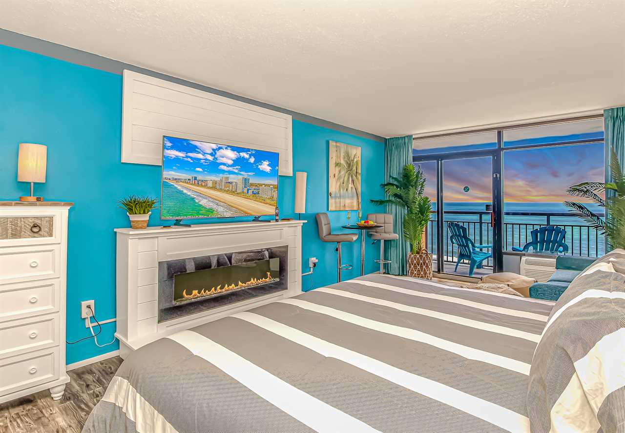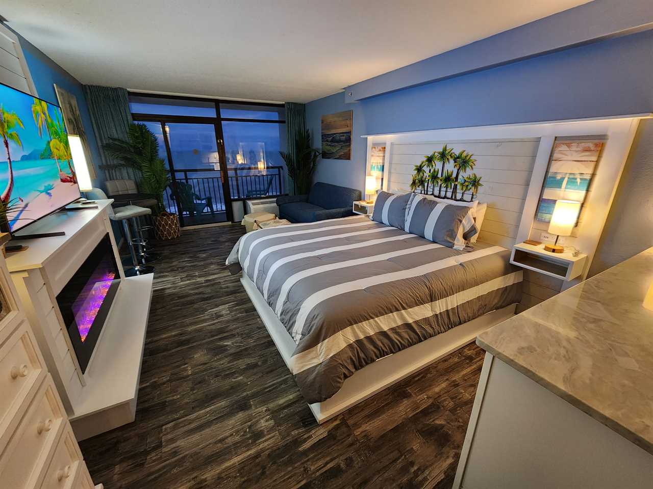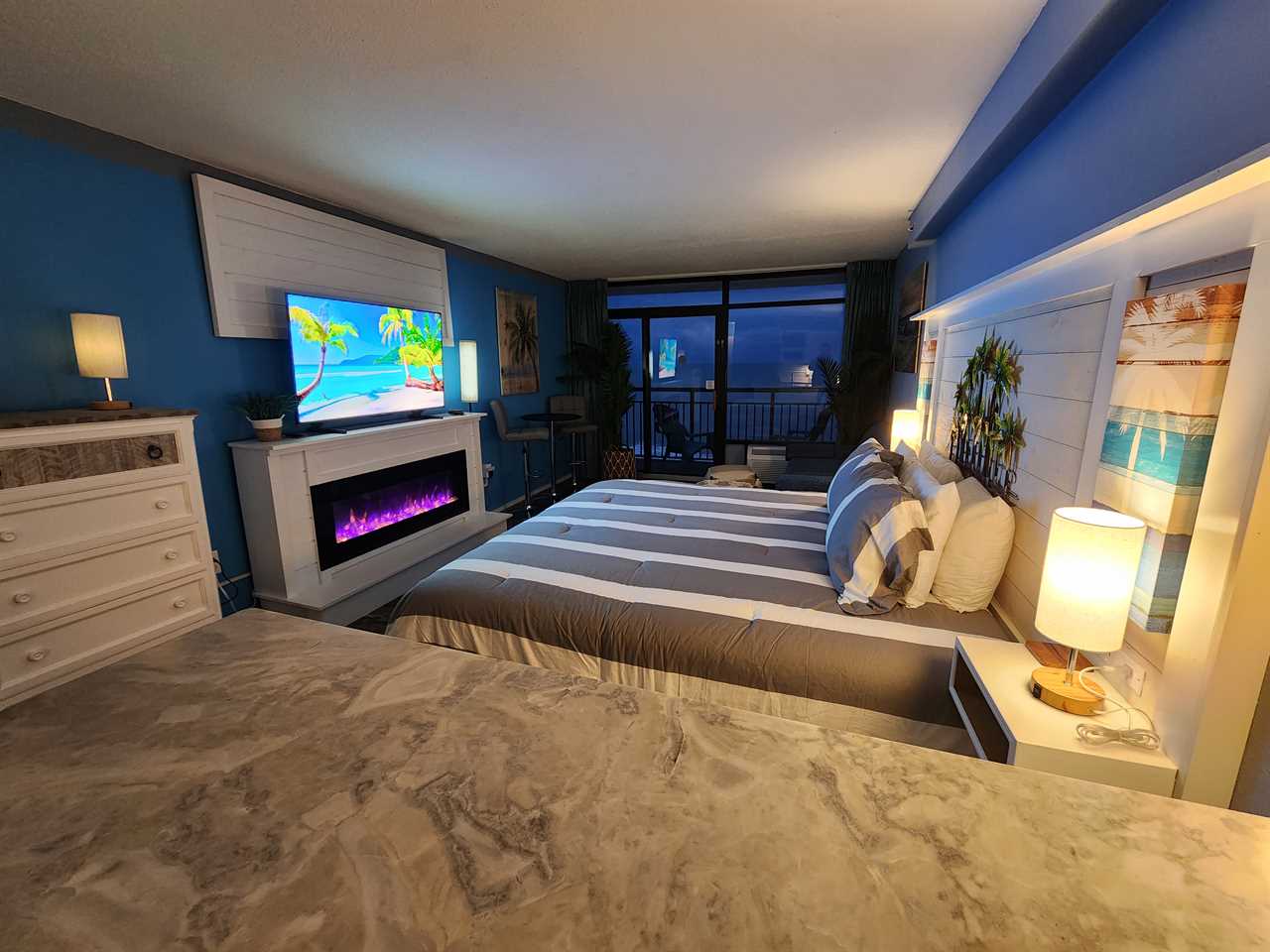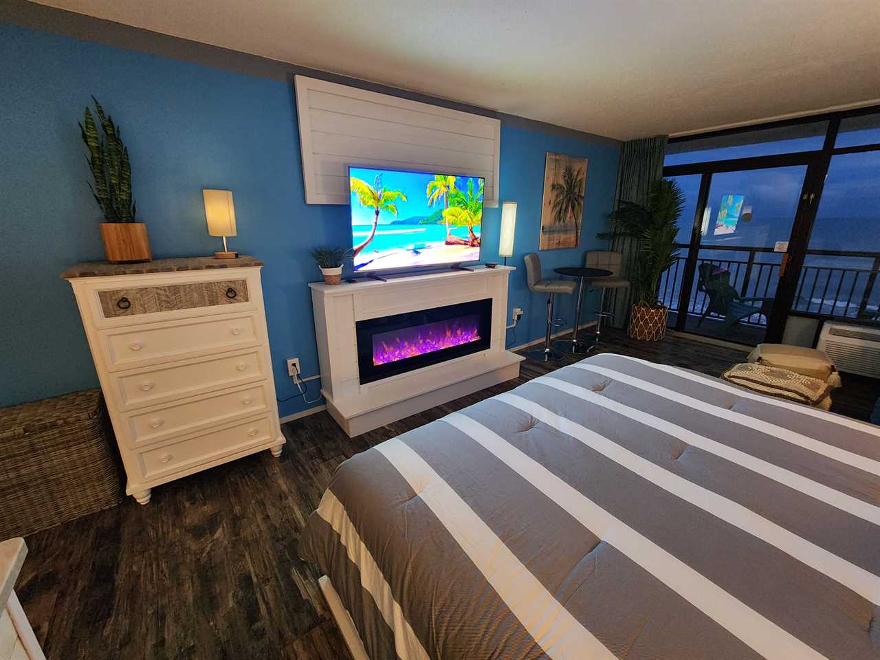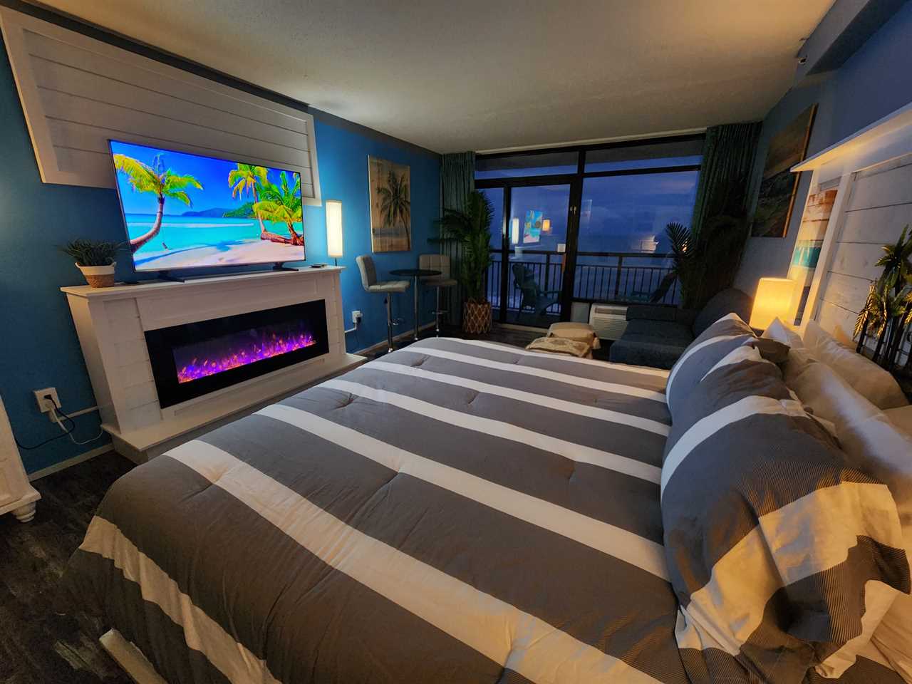 A brand-new custom king-size bed frame, headboard, and mattress were added, along with a new full-size sleeper sofa, dressers, pub table and bar stools, artwork, custom lighting, and plants. Everything in this condo is practically brand new! Whether relaxing on the sofa by the fire or enjoying the private oceanfront balcony furnished with new chairs, guests will find plenty of cozy spots to unwind.