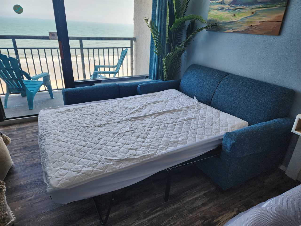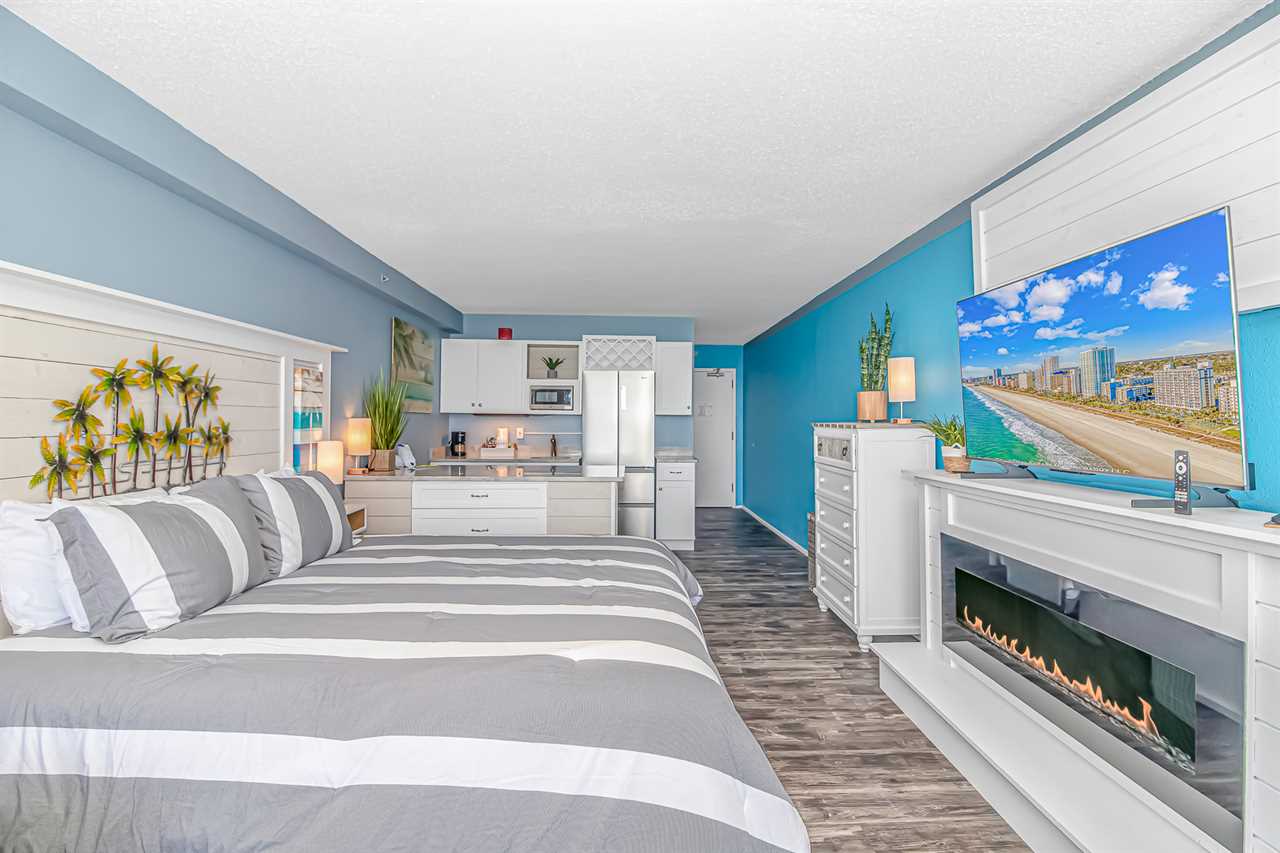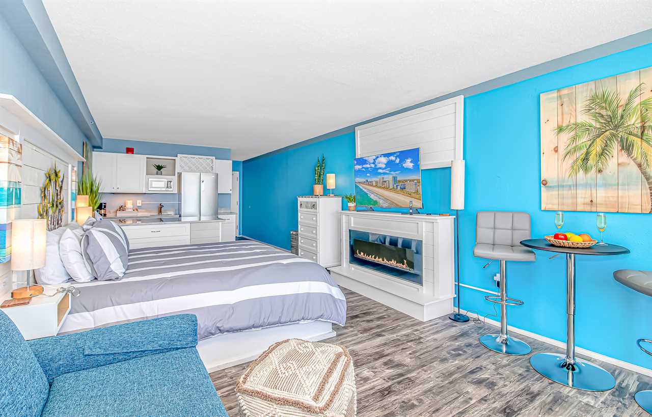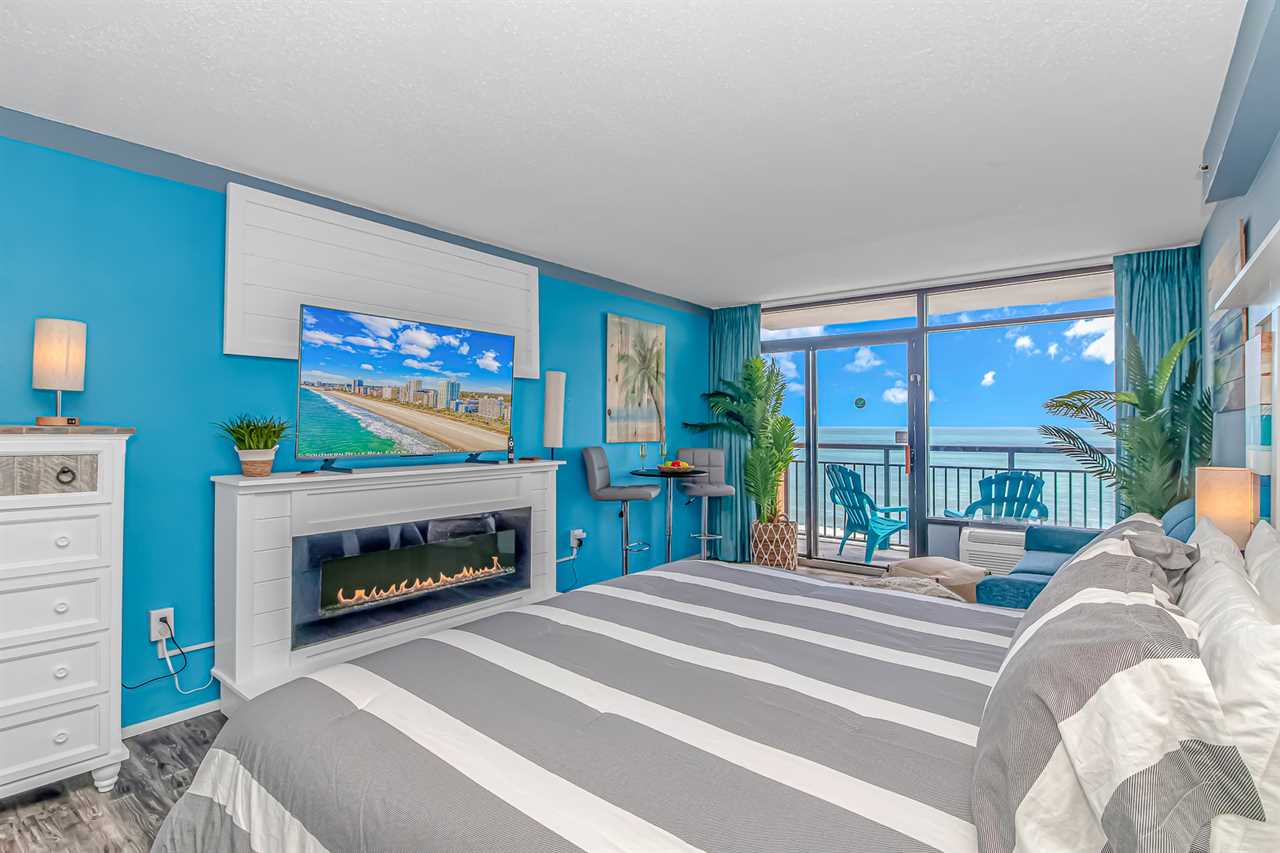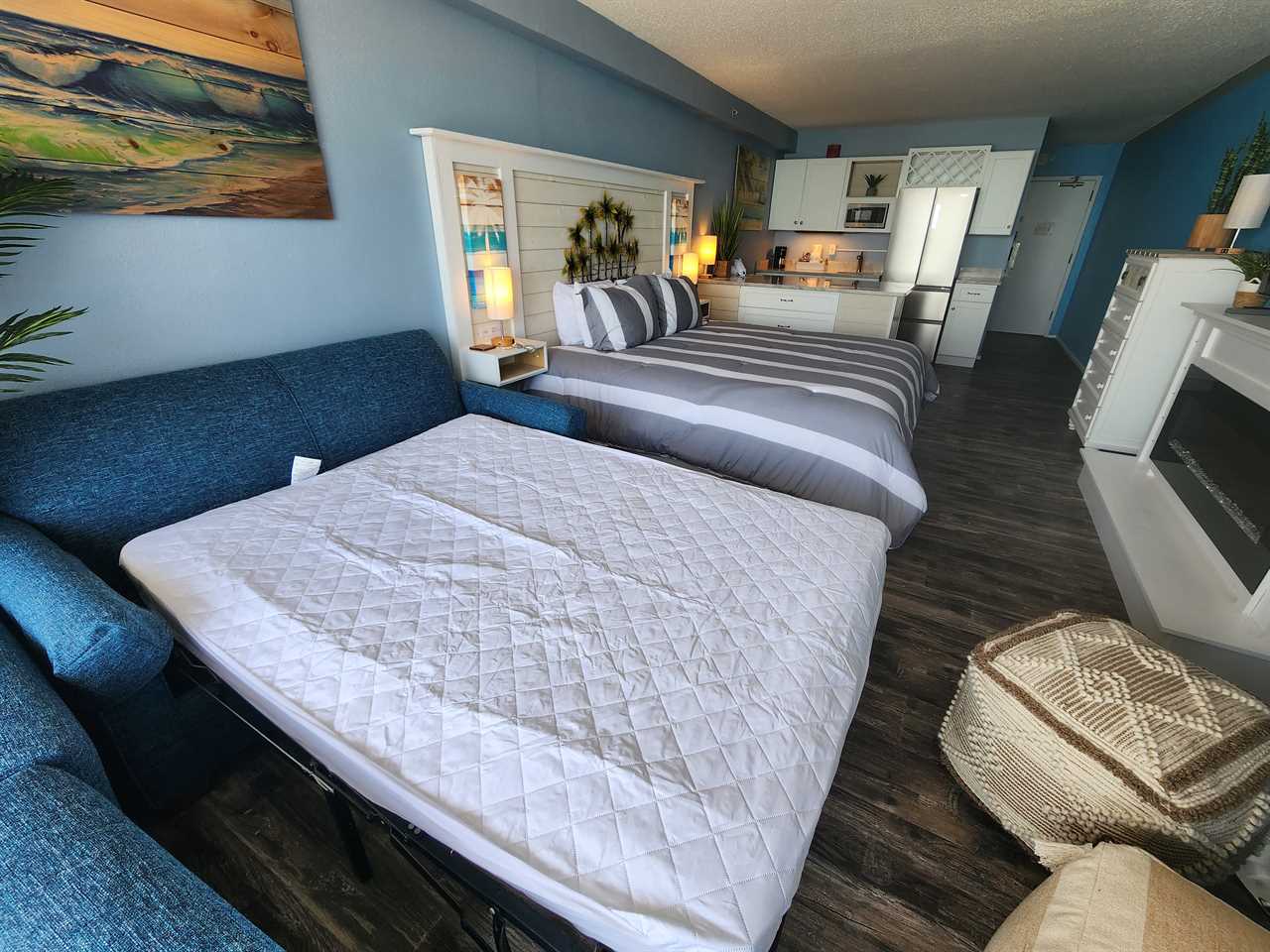 A brand-new custom king-size bed frame, headboard, and mattress were added, along with a new full-size sleeper sofa, dressers, pub table and bar stools, artwork, custom lighting, and plants. Everything in this condo is practically brand new! Whether relaxing on the sofa by the fire or enjoying the private oceanfront balcony furnished with new chairs, guests will find plenty of cozy spots to unwind.