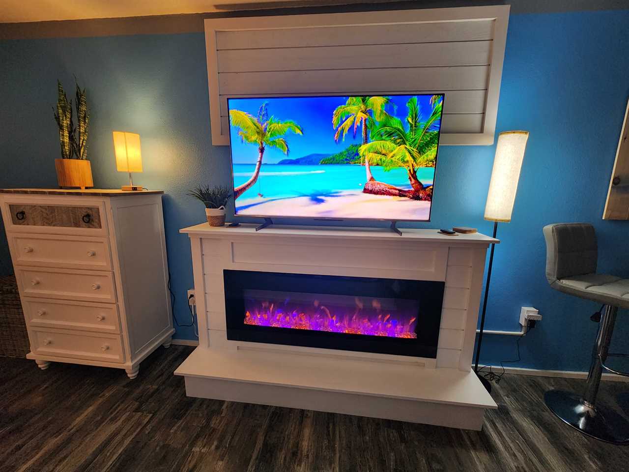 As of Spring 2023, this vacation rental has been completely renovated with breathtaking updates we're excited to share! All carpeting was removed and replaced with luxury vinyl plank flooring throughout. New baseboards were installed, and the entire unit was repainted in modern, welcoming colors. Guests will love the color-changing LED fireplace and new flat-screen smart TV mounted directly above.