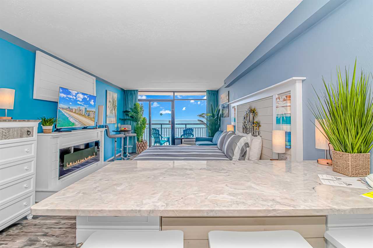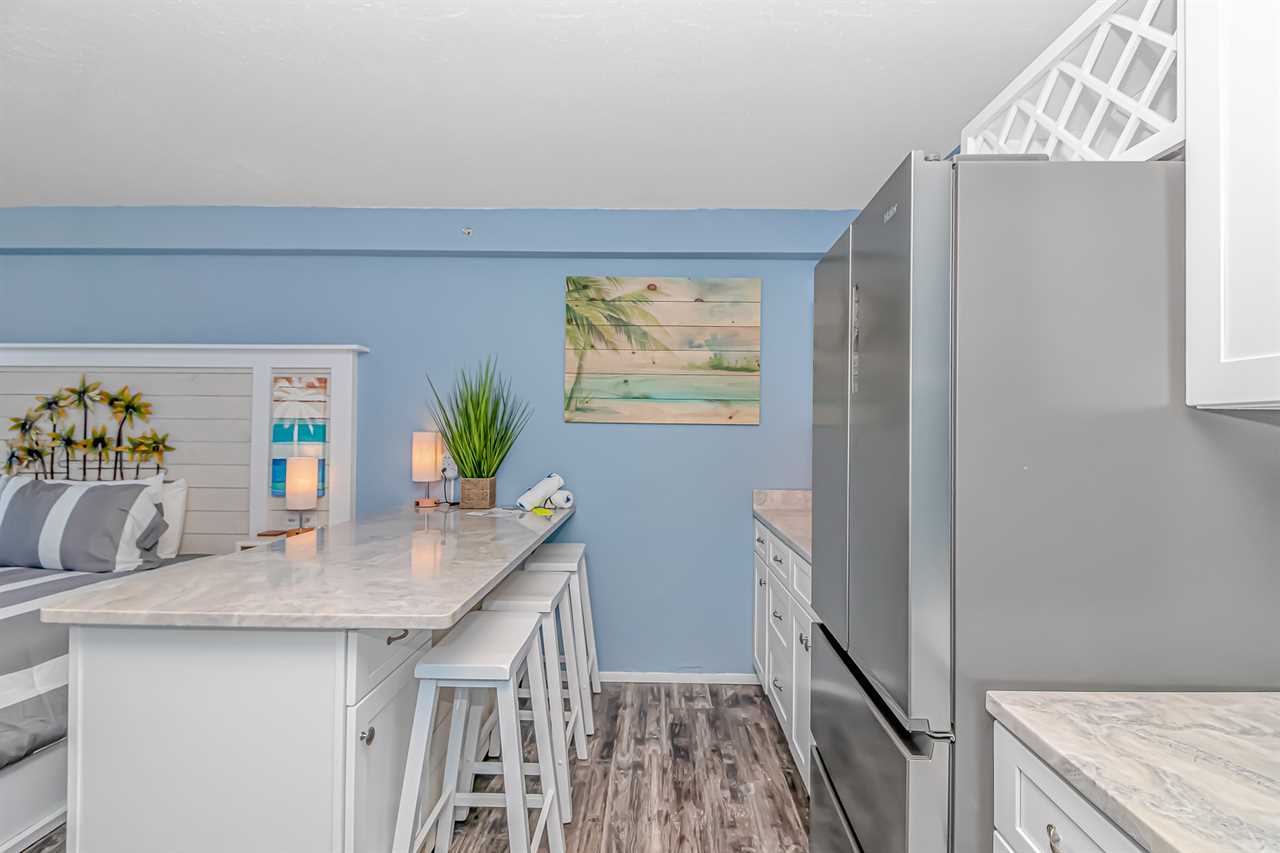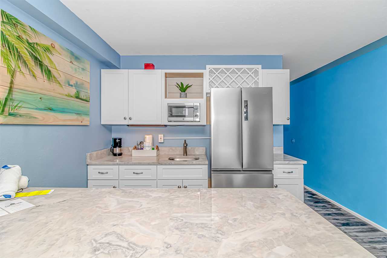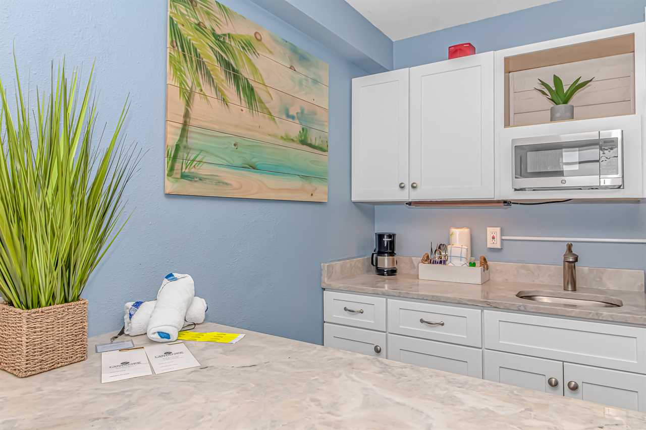 No expense was spared during this renovation—out with the old, in with the new! The kitchen, located just off the main living space, has been completely upgraded to showcase a modern look. It features all-new white cabinets, granite countertops, a kitchen island with bar stools, and stainless steel appliances including a refrigerator, microwave, coffee maker, and sink. We provide all cookware, utensils, plates, cups, and basic kitchen necessities. While coffee is not available in the lobby, guests will have everything they need in the condo to make both hot and iced coffee. The island seating area also includes a multi-outlet/USB port unit, making it the perfect workstation if needed.