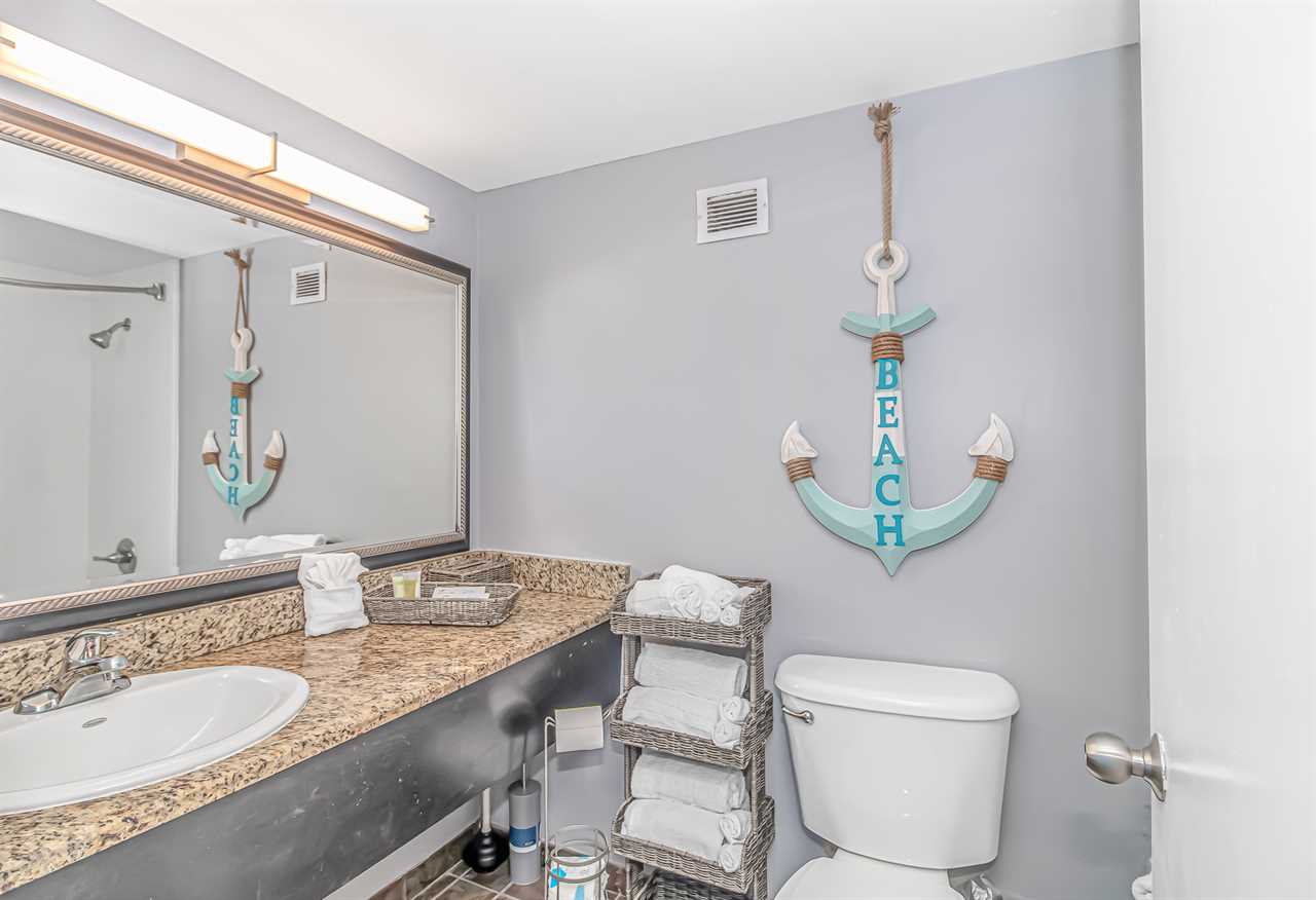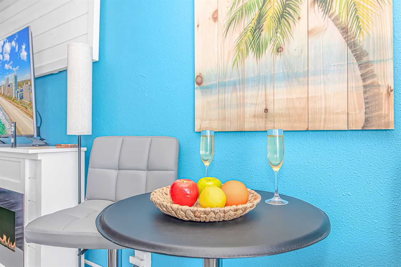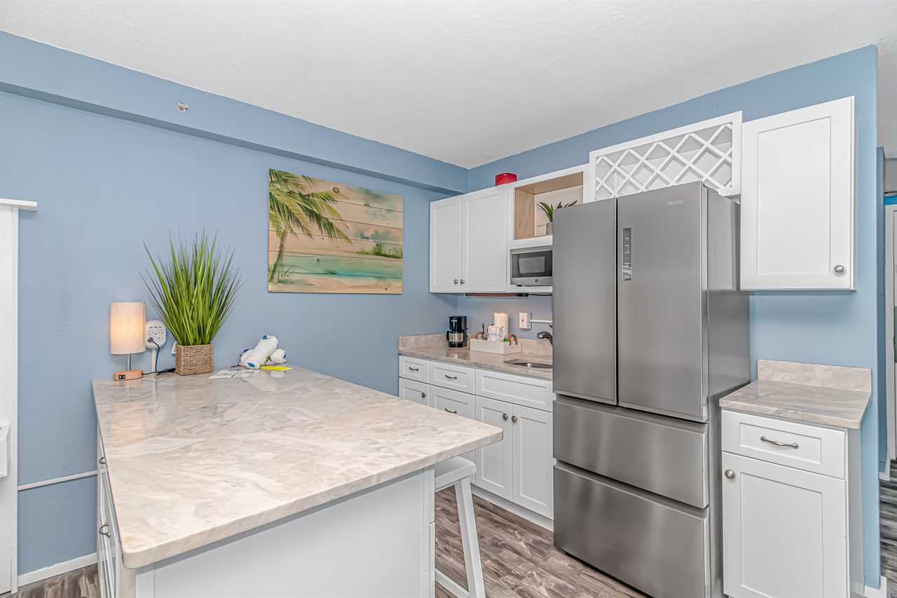No expense was spared during this renovation—out with the old, in with the new! The kitchen, located just off the main living space, has been completely upgraded to showcase a modern look. It features all-new white cabinets, granite countertops, a kitchen island with bar stools, and stainless steel appliances including a refrigerator, microwave, coffee maker, and sink. We provide all cookware, utensils, plates, cups, and basic kitchen necessities. While coffee is not available in the lobby, guests will have everything they need in the condo to make both hot and iced coffee. The island seating area also includes a multi-outlet/USB port unit, making it the perfect workstation if needed.
