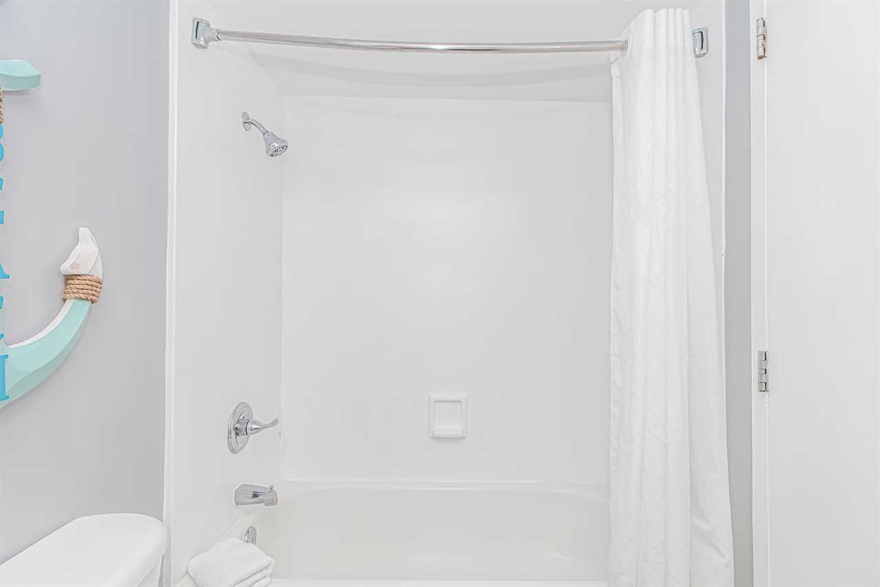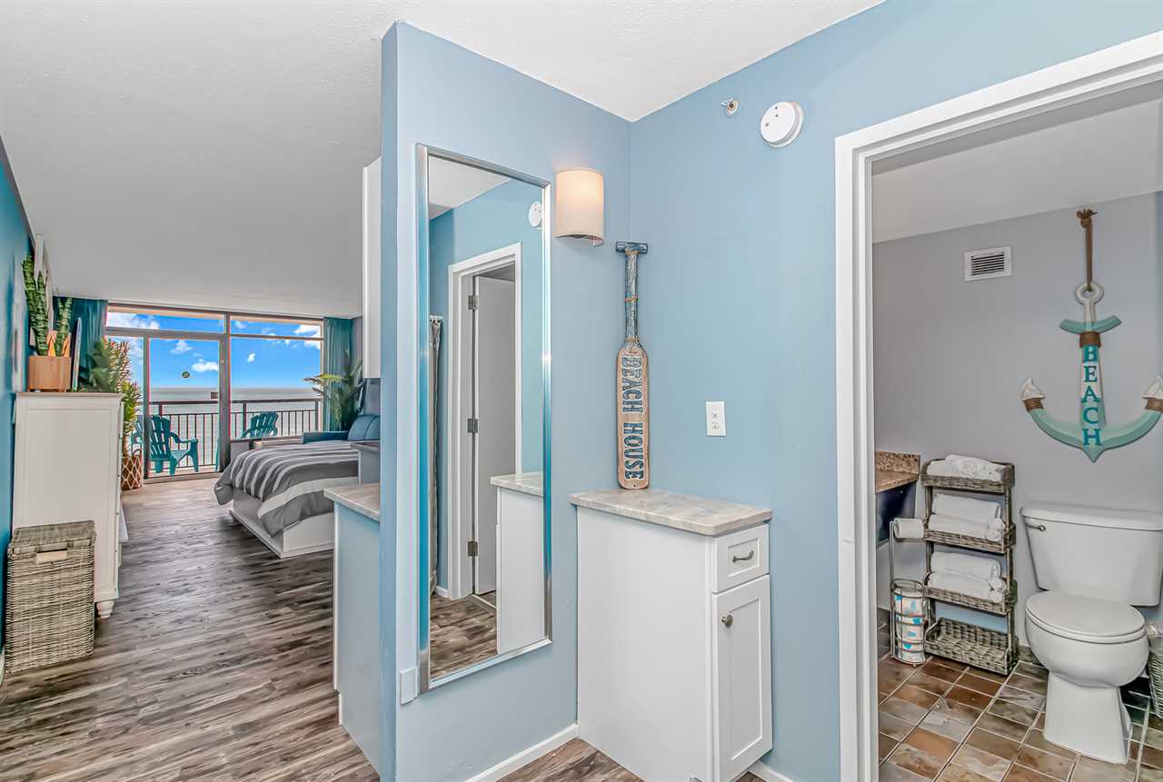 Just behind the kitchen, you'll find the bathroom, featuring a toilet, vanity, and shower/tub combo. A new makeup mirror was added nearby, along with a full-length mirror, stool, and counter area with an AC plug—an ideal spot to get ready while freeing up the bathroom for others.