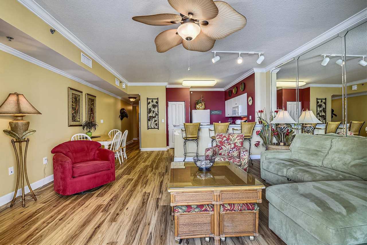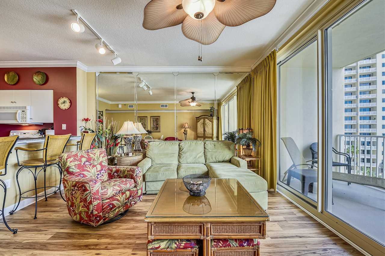 As soon as you enter the home, you will be blown away by the amenities, personal touches, cool lighting fixtures, unique color palette, and breathtaking views that you can see from your private deck and living room. The living room features a large, L-shaped cozy couch that provides a perfect viewpoint of the bright blue waters and never-ending white sand beaches right outside of your doorstep. You can also sit in one of the large chairs and read a book for a mid-afternoon escape from the shining sun.