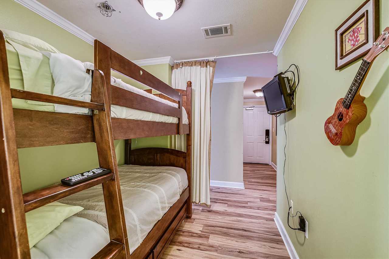 You can choose between the master suite with a king-sized bedroom and HD flat screen with a private bathtub and shower, or the Queen Suite with a large TV and full bathroom with a tub and shower. Both are great options for adults or couples who want a relaxing place to stay. Then, you can put a young couple or teenagers in the twin and twin bunk bed room with its own private bath and shower to provide some more independence and space from all of your guests.