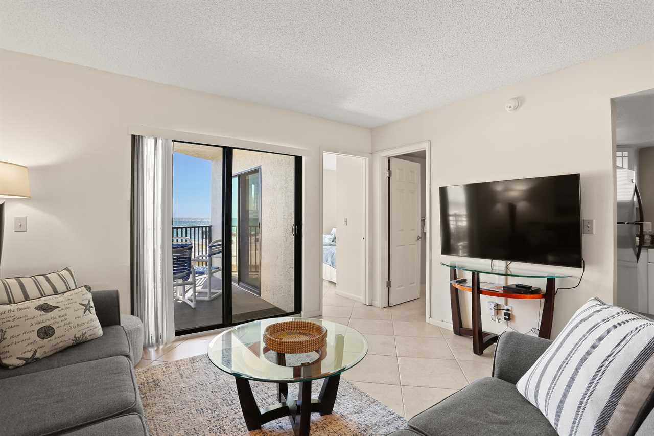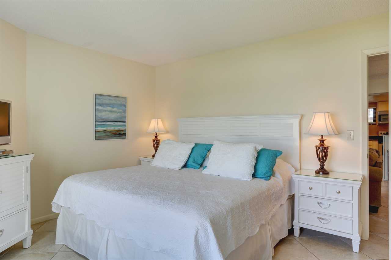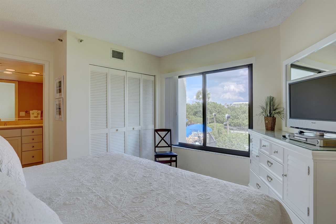 - Master Bedroom β King-size bed, 26β flat screen TV, DVD player, large beach-facing window