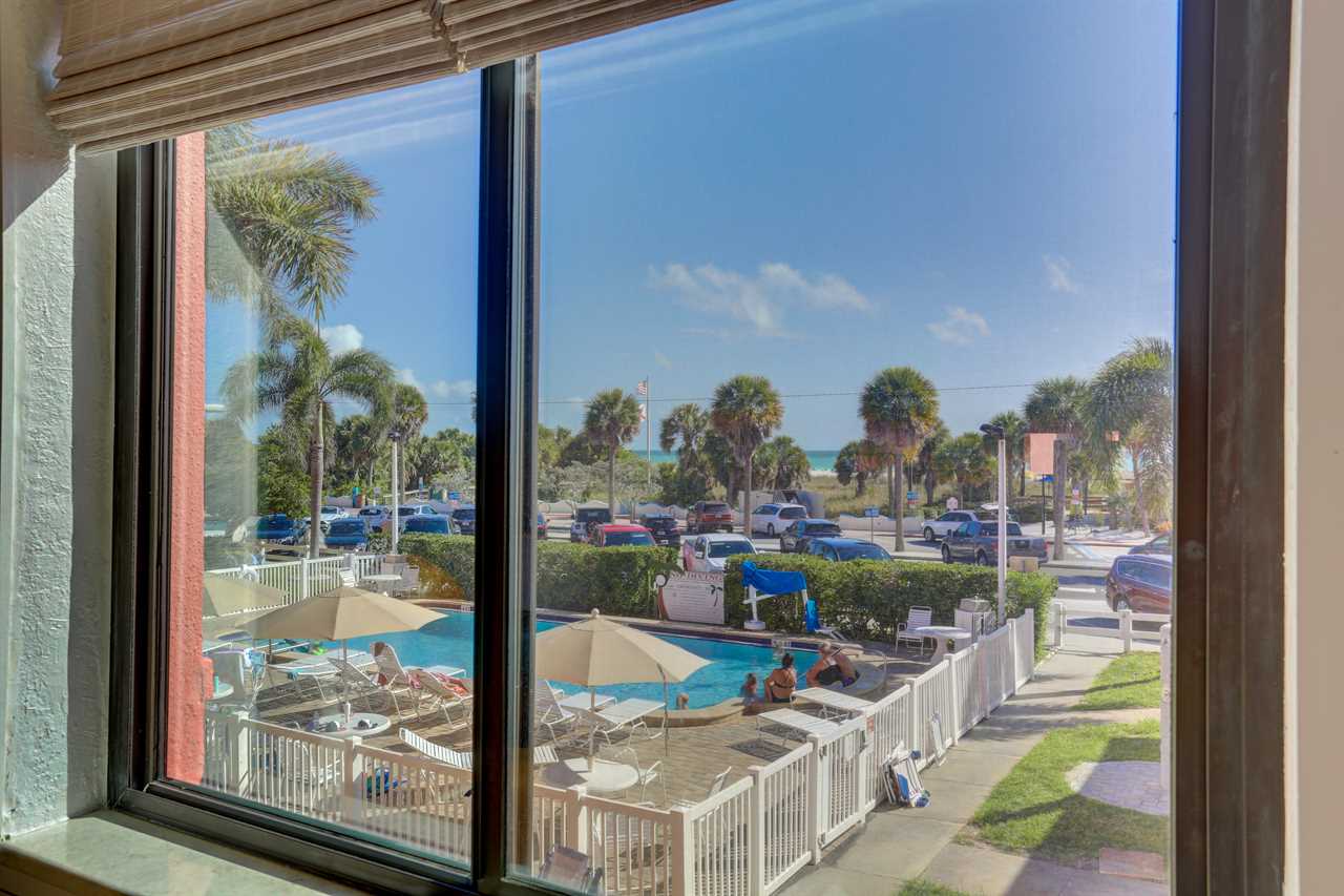 Experience classic St. Pete Beach living in this comfortable two-bedroom, one-bath vacation condo at Gulf Winds Resort. Located on the second floor with views of both the heated pool and the Gulf, this unit offers a relaxed beach getaway just across the street from the sand and surf. (Second-floor unit—no elevator.)