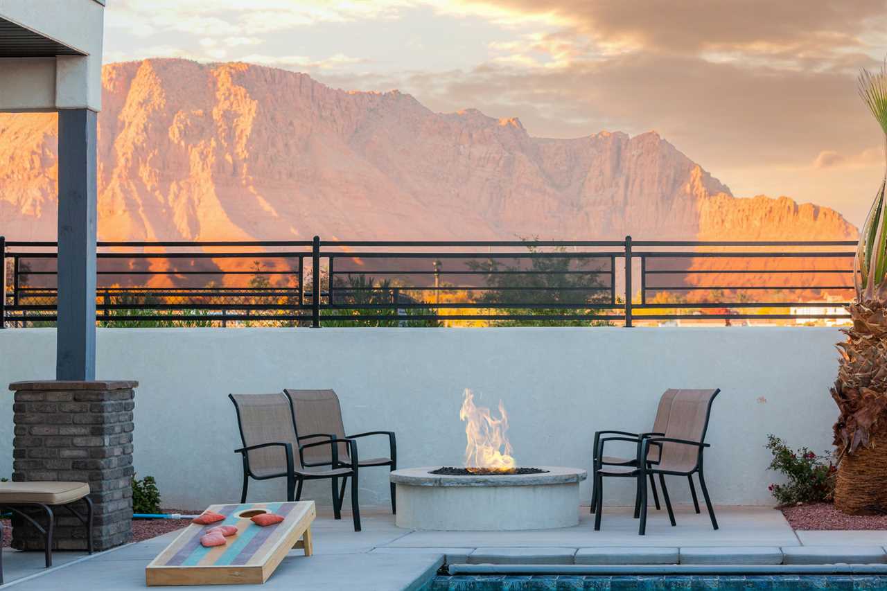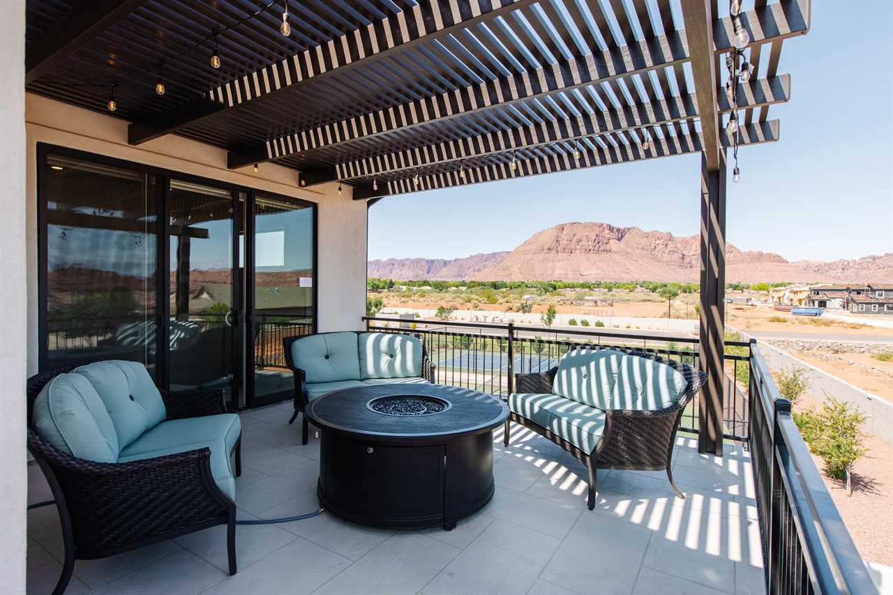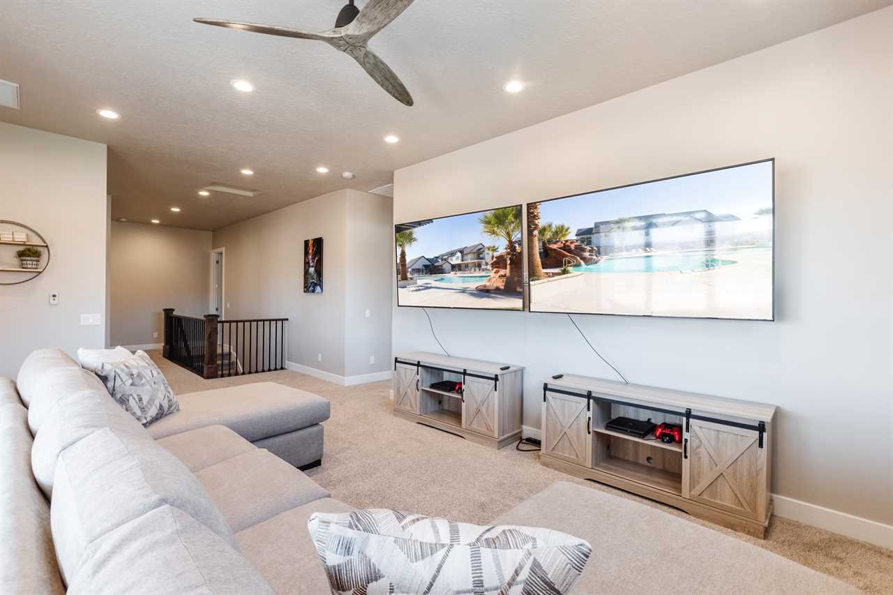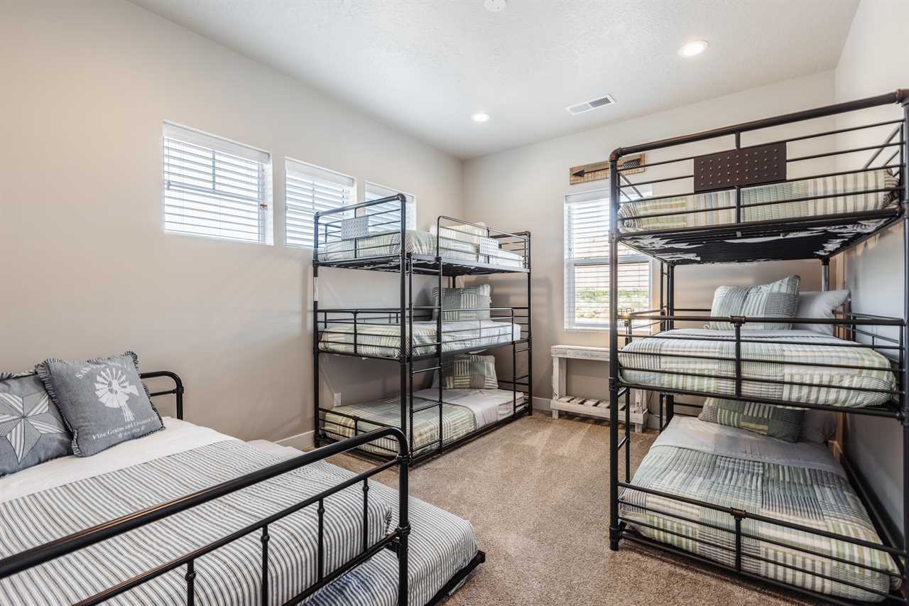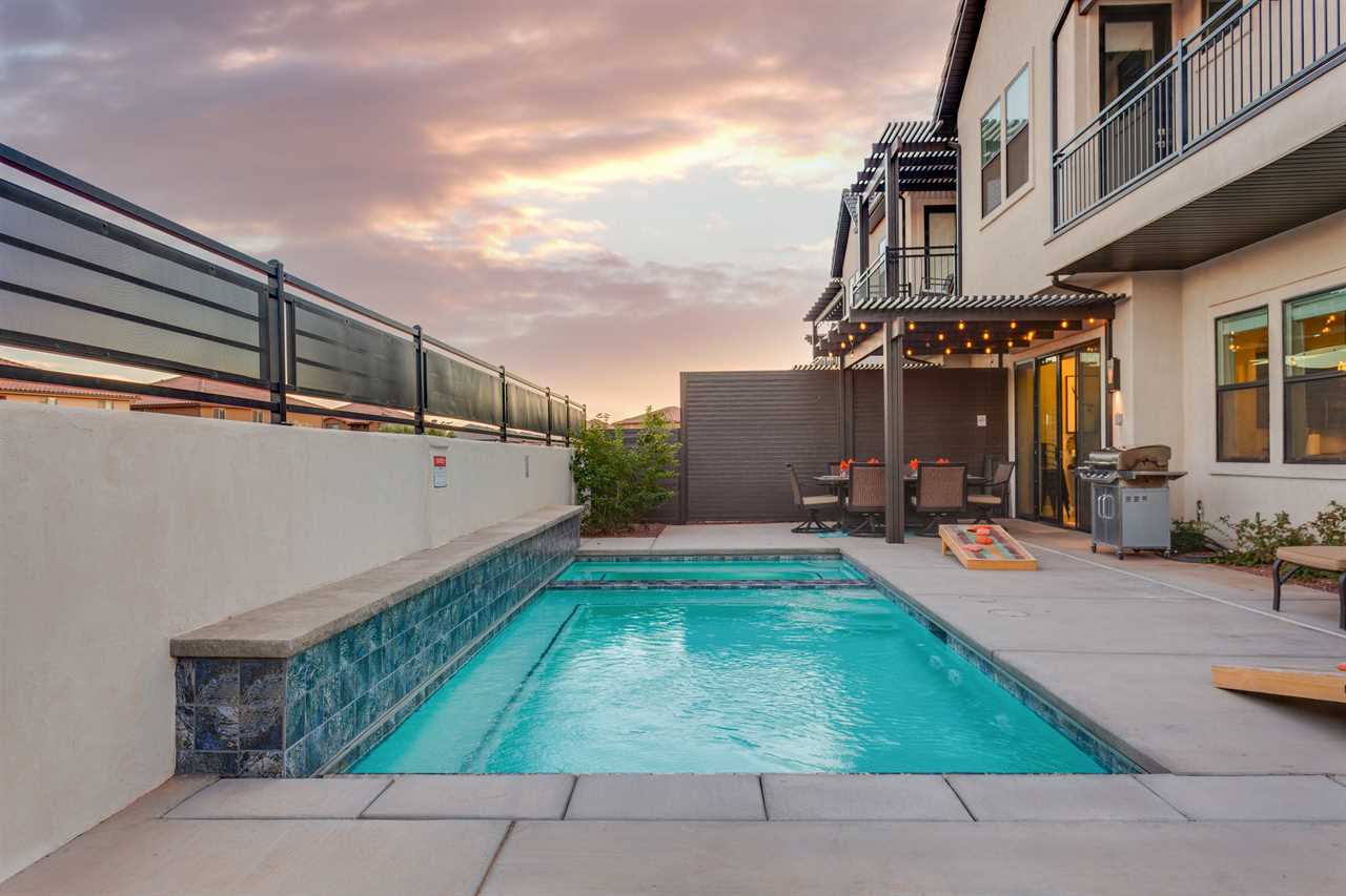 The Lookout in Ocotillo Springs **Splash Pad unavailable at this time** Spend your next southern Utah vacation at The Lookout in Ocotillo Springs, the perfect place to enjoy the desert sun! This beautiful home features a private pool and spa, as well as two play stations and large TVs in each room, as well as two in the loft and one in the living room! Enjoy the sunshine and desert breeze on your private patio with a refreshing dip in the pool or a delicious lunch on the balcony. As the sun sets, cook some delicious food on the grill and enjoy time with your favorite people! You can relax in front of a fire either from the upstairs balcony under shining string lights, or by the pool at one of two fire pits on the ground floor. Gaze up at the stars from the comfort of the hot tub and then cozy up on the couch in front of one of the TVs for a movie night This elegant 5 Bedroom / 5.5 Bathroom home can comfortably sleep 16 people, or with the use of a pull-out couch bed and roll-away twin beds, fit as many as 20 people to have all of your favorite people with you for your southern Utah vacation! The master bedroom is downstairs, with patio access as well as a large ensuite bathroom and master walk in closet. Enjoy a soak in the large tub, or a refreshing shower after a day of exploring the local scenery! Upstairs there are 2 more King suites, as well as a queen suite and a bunk room for the kids! The bunk room features two 3-tier twin bunk beds, as well as a twin daybed with a trundle, so you can fit as many as 8 people comfortably in one room! Spend your day exploring southern Utah at local destinations like Sand Hollow, Tuacahn Center for the Arts, and Snow Canyon all within a short trip from your new favorite vacation destination, The Lookout in Ocotillo Springs! **Private Pool Heated Upon Request Bedding: King – Ensuite Bathroom King – Ensuite Bathroom King – Ensuite Bathroom Queen – Ensuite Bathroom 2 twin trio bunk beds, 1 twin bed w/ trundle – Shared Bathroom Additional Bedding: 2 Roll-away Twin Beds, Queen Pull-Out Couch Amenities Highlights: Private Pool Private Spa 2 PS4s Smart TVs in each room 3 Fire pits Balcony Grill Resort Amenities: Resort Pool & Spa Splash Pad *Splash Pad closed, but Gubler Park, just 2 minutes away by car, offers its own Splash Pad and plenty more activities for you to enjoy!* Pickleball Courts Clubhouse (pool table, game system, ping pong, and outdoor fireplace) Additional Street Parking *Please inquire for parking rules and regulations prior to booking.