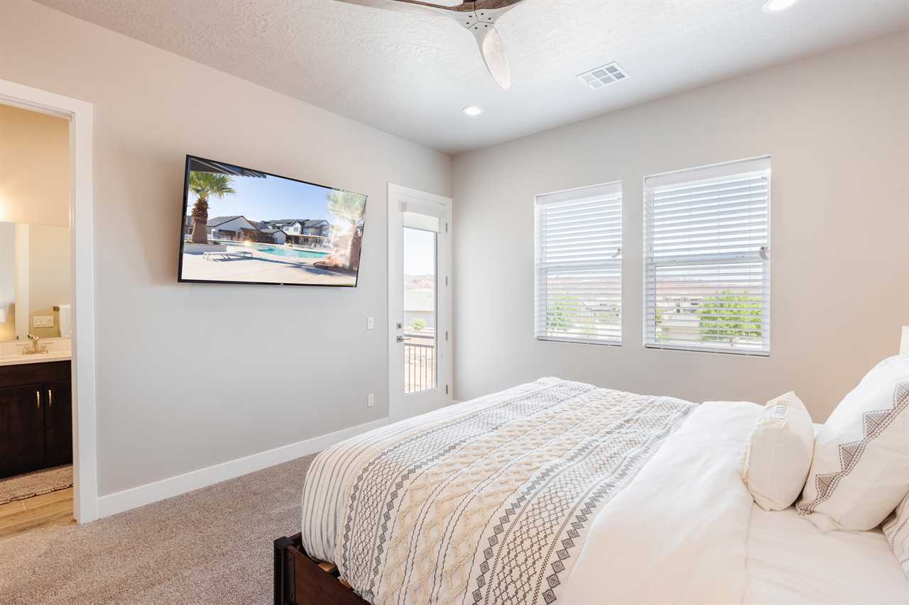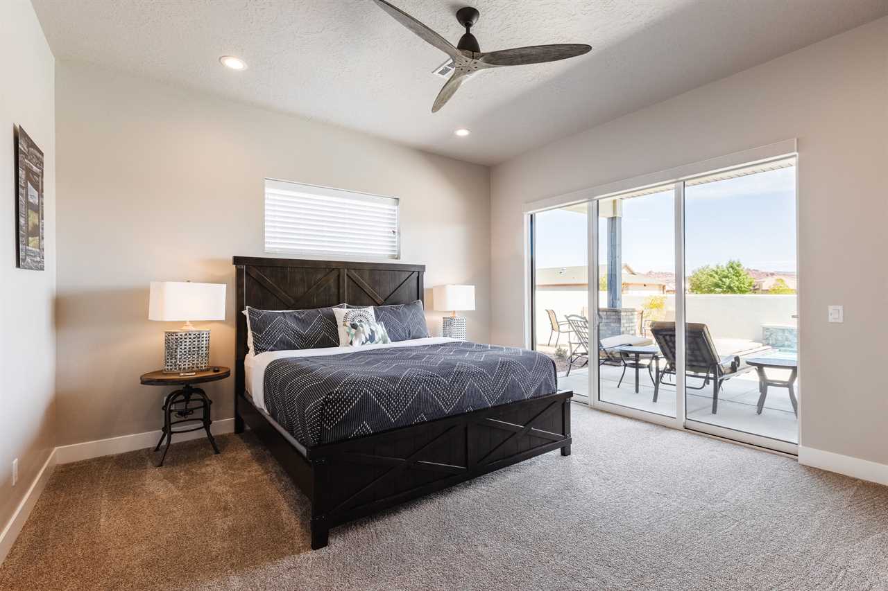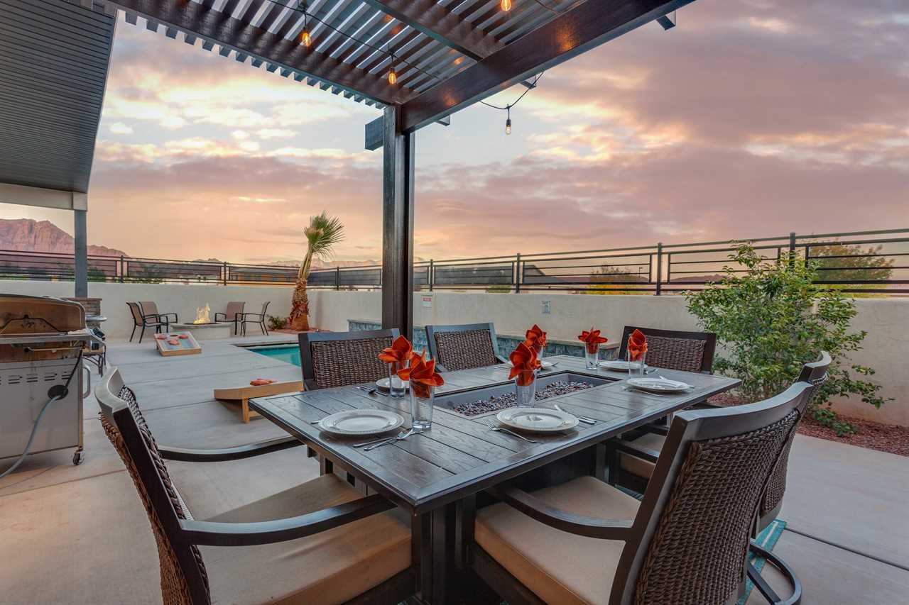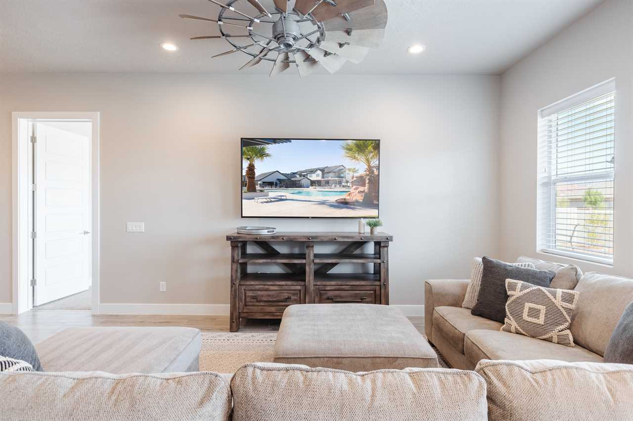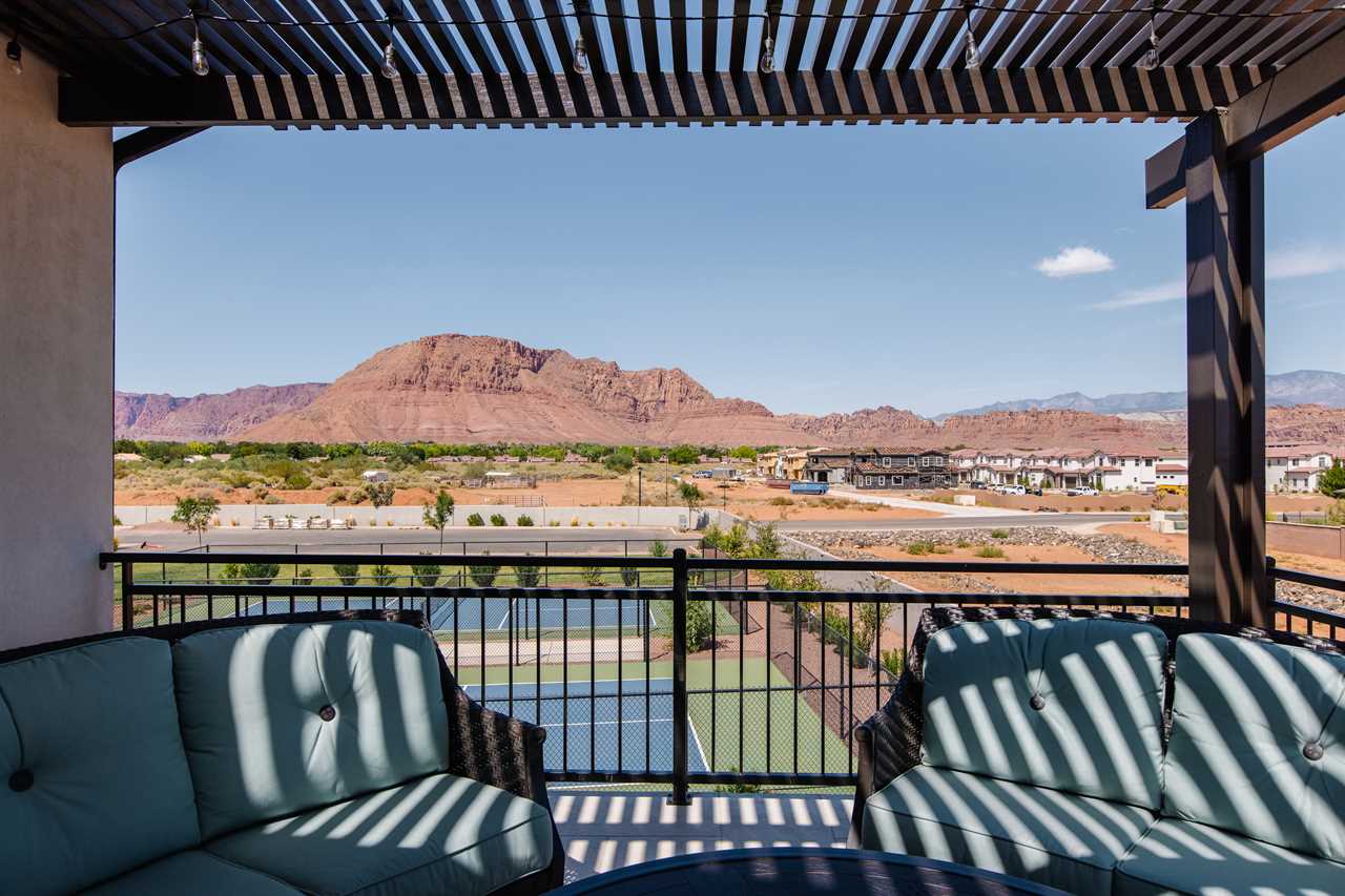 The Lookout in Ocotillo Springs **Splash Pad unavailable at this time** Spend your next southern Utah vacation at The Lookout in Ocotillo Springs, the perfect place to enjoy the desert sun! This beautiful home features a private pool and spa, as well as two play stations and large TVs in each room, as well as two in the loft and one in the living room! Enjoy the sunshine and desert breeze on your private patio with a refreshing dip in the pool or a delicious lunch on the balcony. As the sun sets, cook some delicious food on the grill and enjoy time with your favorite people! You can relax in front of a fire either from the upstairs balcony under shining string lights, or by the pool at one of two fire pits on the ground floor. Gaze up at the stars from the comfort of the hot tub and then cozy up on the couch in front of one of the TVs for a movie night This elegant 5 Bedroom / 5.5 Bathroom home can comfortably sleep 16 people, or with the use of a pull-out couch bed and roll-away twin beds, fit as many as 20 people to have all of your favorite people with you for your southern Utah vacation! The master bedroom is downstairs, with patio access as well as a large ensuite bathroom and master walk in closet. Enjoy a soak in the large tub, or a refreshing shower after a day of exploring the local scenery! Upstairs there are 2 more King suites, as well as a queen suite and a bunk room for the kids! The bunk room features two 3-tier twin bunk beds, as well as a twin daybed with a trundle, so you can fit as many as 8 people comfortably in one room! Spend your day exploring southern Utah at local destinations like Sand Hollow, Tuacahn Center for the Arts, and Snow Canyon all within a short trip from your new favorite vacation destination, The Lookout in Ocotillo Springs! **Private Pool Heated Upon Request Bedding: King – Ensuite Bathroom King – Ensuite Bathroom King – Ensuite Bathroom Queen – Ensuite Bathroom 2 twin trio bunk beds, 1 twin bed w/ trundle – Shared Bathroom Additional Bedding: 2 Roll-away Twin Beds, Queen Pull-Out Couch Amenities Highlights: Private Pool Private Spa 2 PS4s Smart TVs in each room 3 Fire pits Balcony Grill Resort Amenities: Resort Pool & Spa Splash Pad *Splash Pad closed, but Gubler Park, just 2 minutes away by car, offers its own Splash Pad and plenty more activities for you to enjoy!* Pickleball Courts Clubhouse (pool table, game system, ping pong, and outdoor fireplace) Additional Street Parking *Please inquire for parking rules and regulations prior to booking.