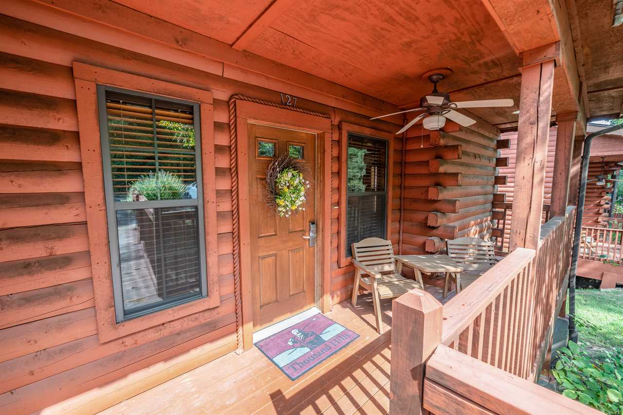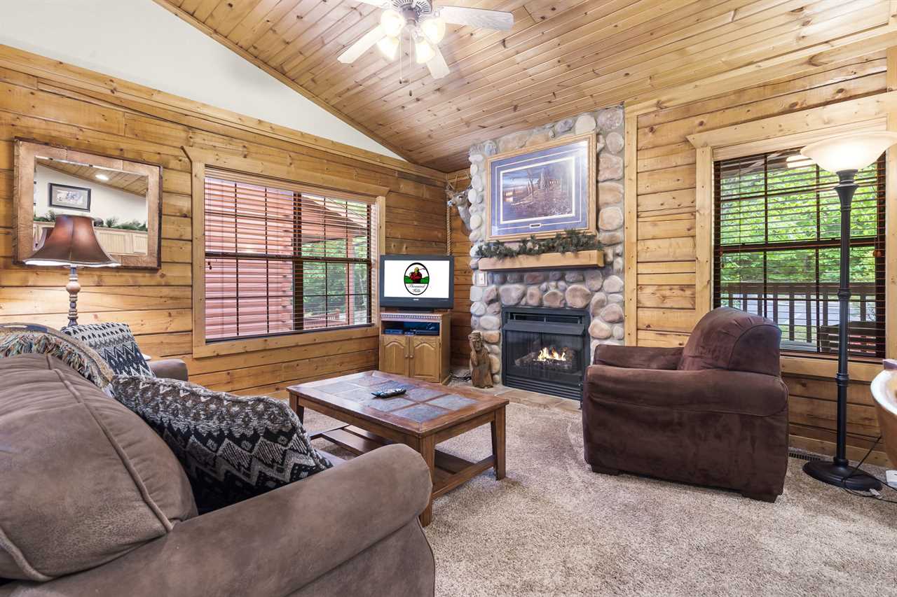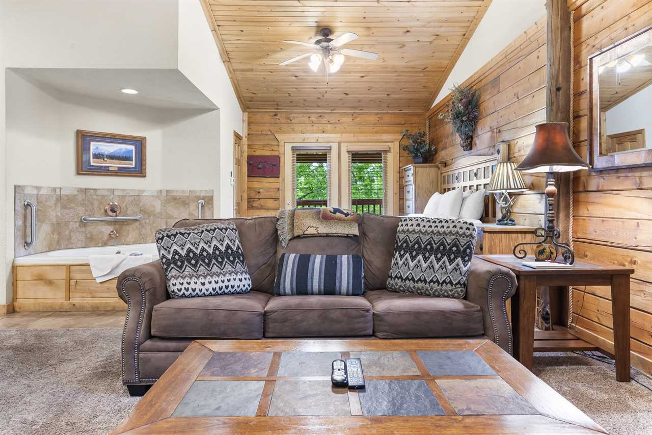 Walk-in Cedar Cabin with Walk-in Shower, Gas Fireplace, & Covered Balcony. Golf/Ticket Discounts