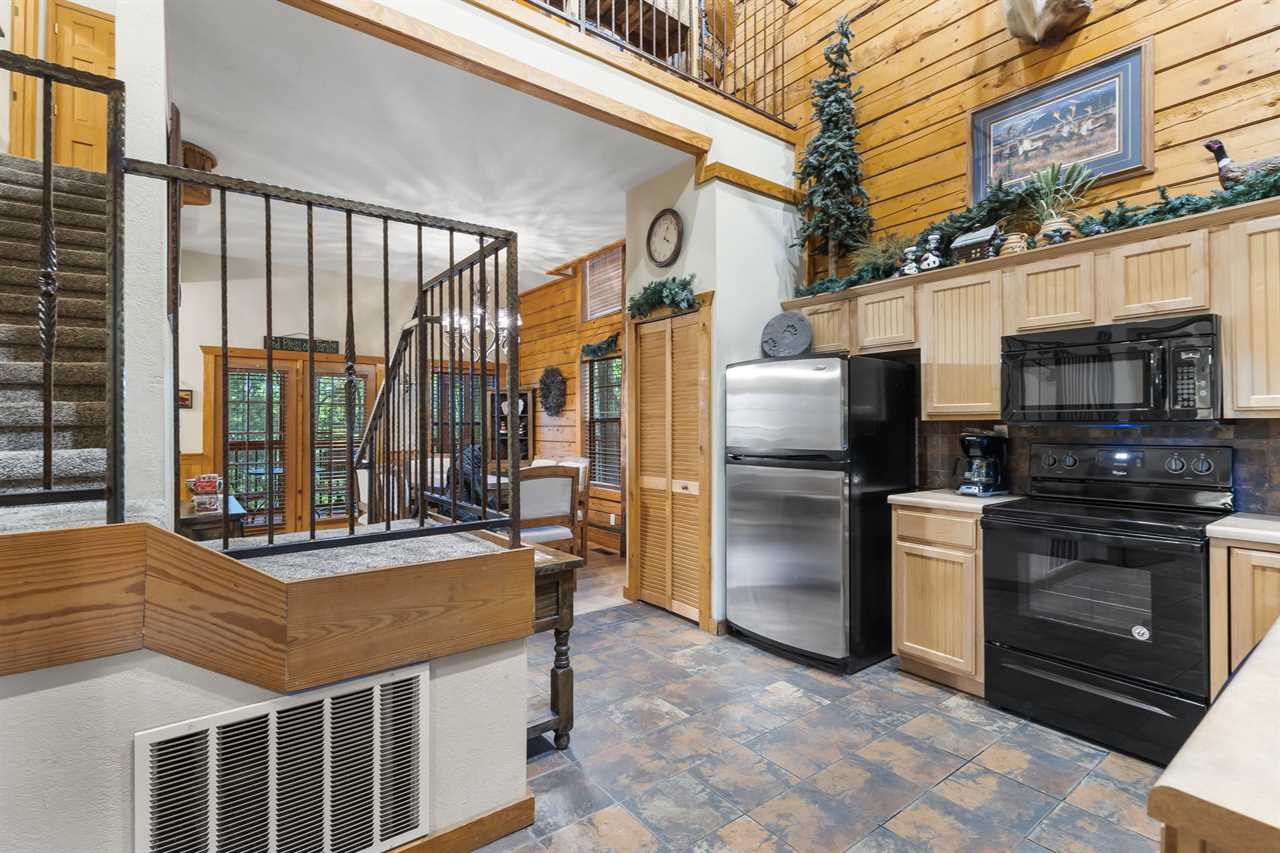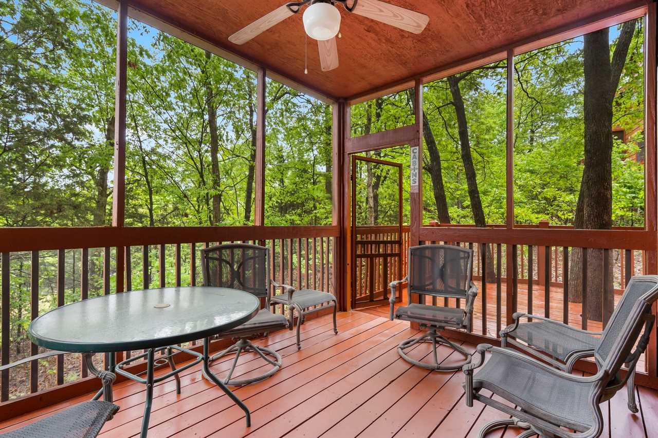Step inside to warm wood finishes, a striking floor-to-ceiling stone fireplace, and comfy furnishings that invite you to drop your bags and instantly relax. The full kitchen and dining area make mealtimes easy, whether you're cooking in or bringing back local favorites from the Strip. In the mornings, savor your coffee on the screened-in porch and balcony, where peaceful woodland views and the sounds of nature create a calm, tucked-away vibe before a busy Branson day.