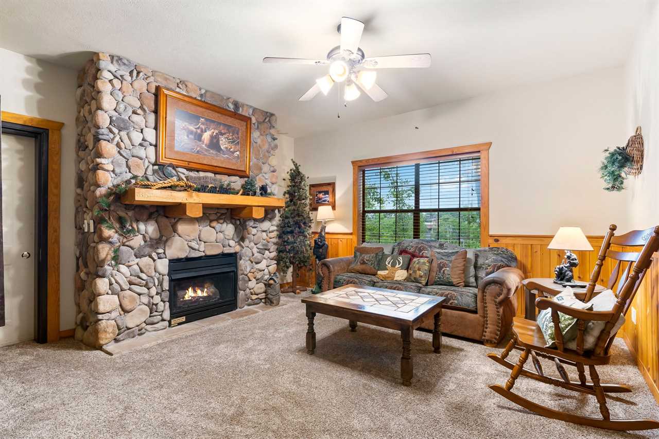 ✦ ✦ Open-concept living room with comfy seating, cable TV, and a floor-to-ceiling stone fireplace for cozy evenings 🛋️🔥