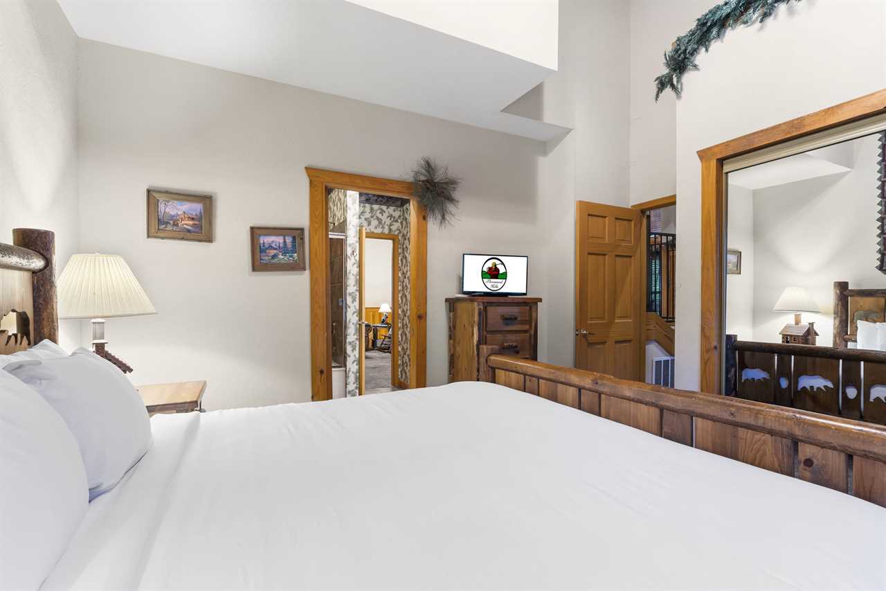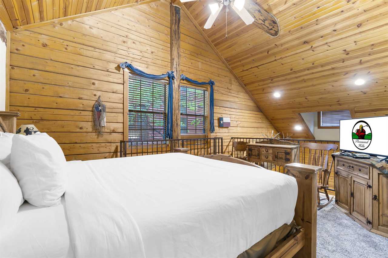 ✦ ✦ Open Loft – King (Upstairs): King bed, cable TV, and dedicated work desk; shares the upstairs bathroom accessed through Bedroom 2