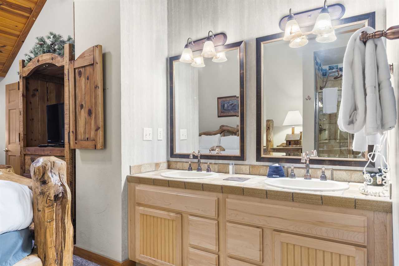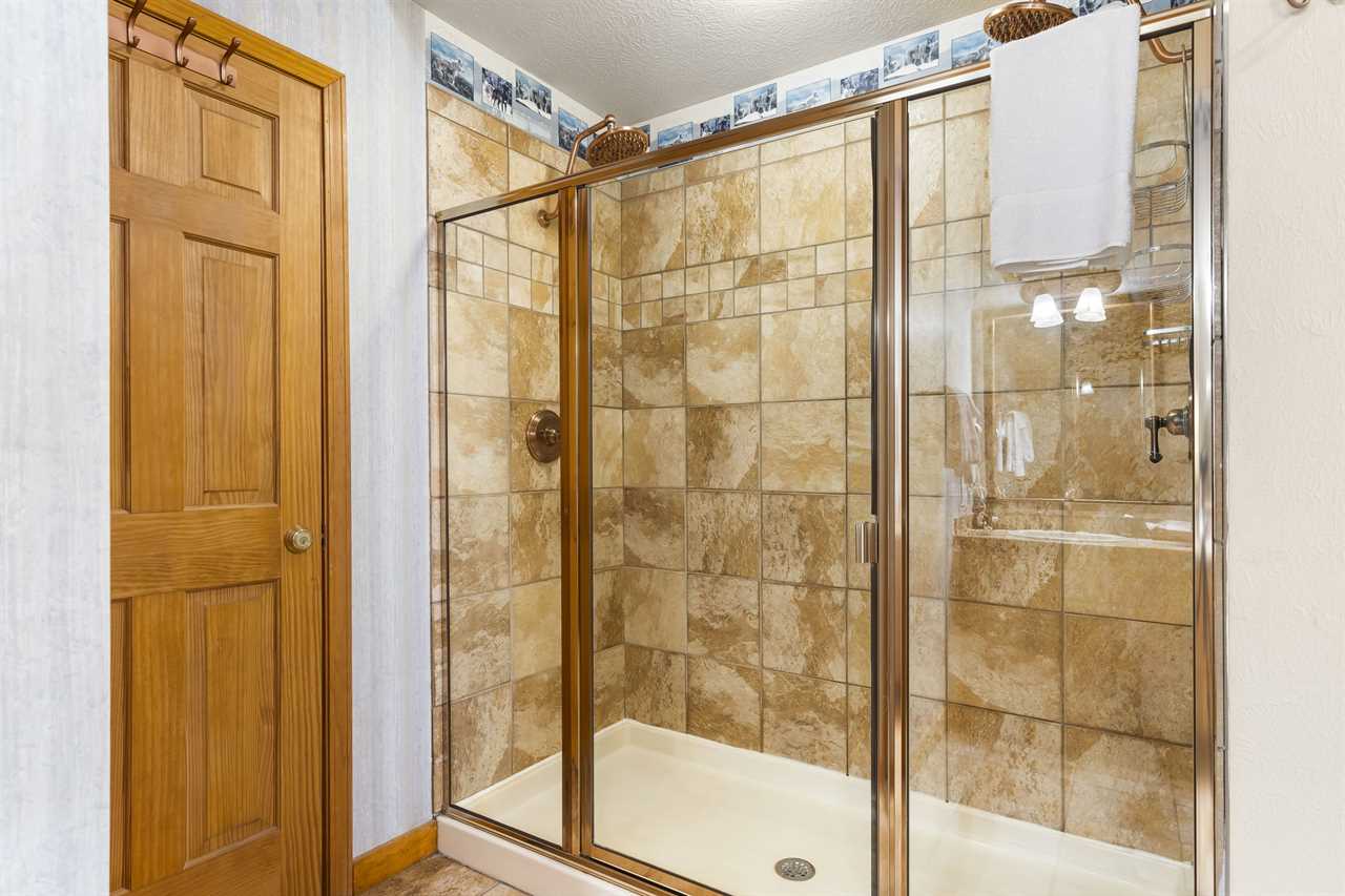 ✦ ✦ Bedroom 2 – King (Upstairs): King bed, cable TV, and attached full bathroom with step-in shower and double copper rainheads