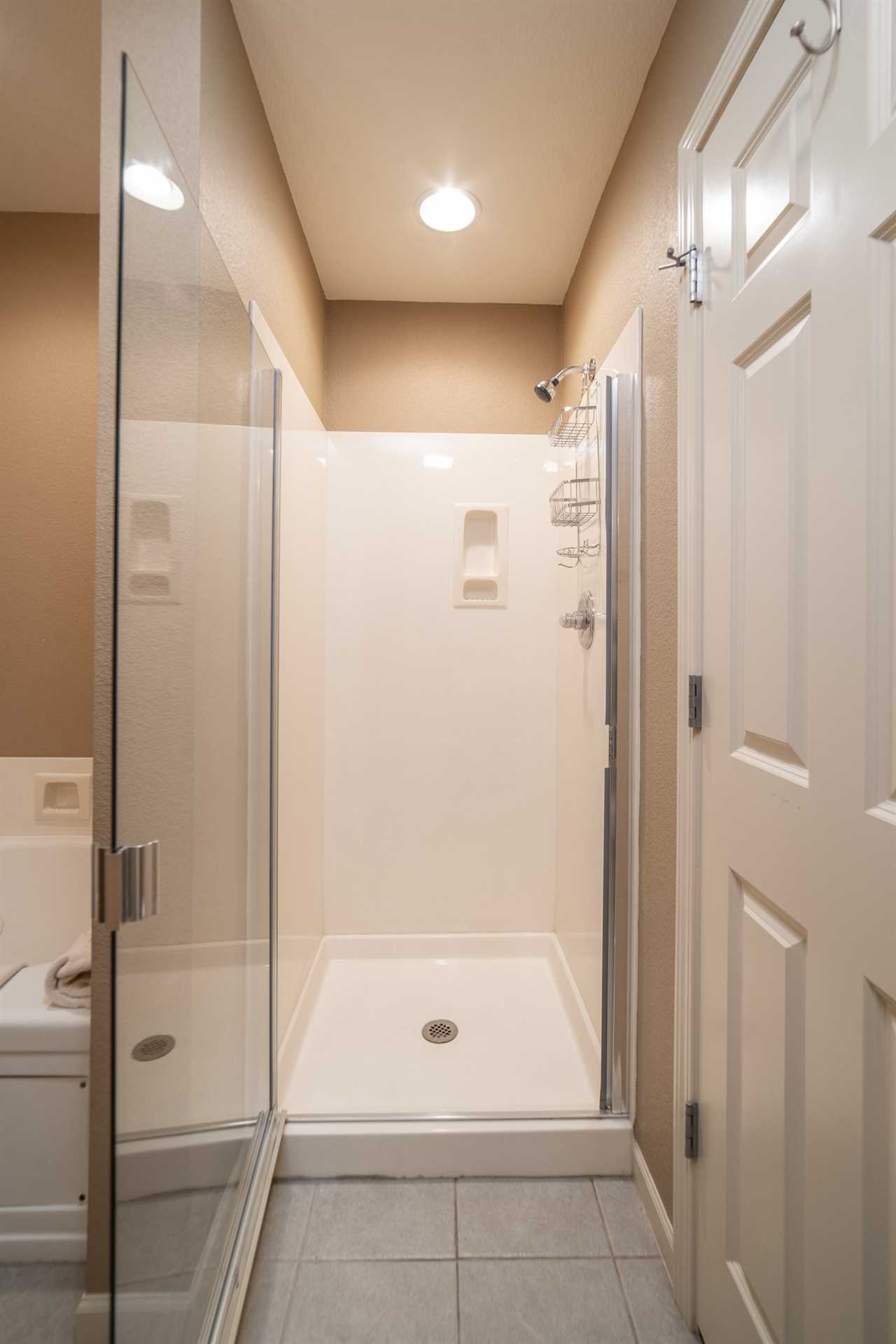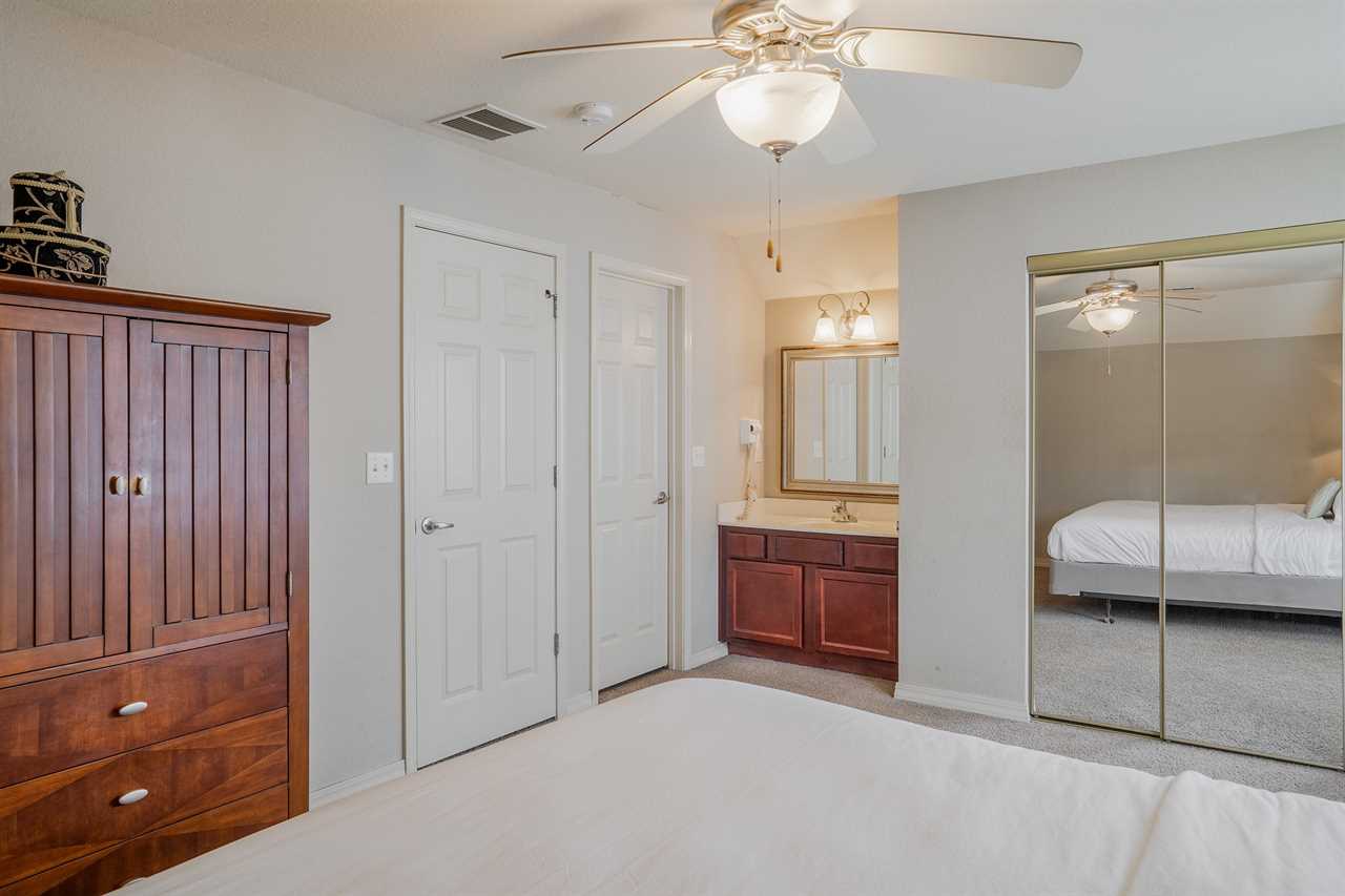 The main-floor master suite is a private retreat with a king bed 🛏️, cable TV 📺, and direct access to the patio 🌳. Its ensuite bathroom includes both a jetted tub 🛁 and a shower 🚿. Upstairs, two additional bedrooms provide plenty of space: one with a queen bed 🛏️ and the other with a queen bed 🛏️. Each has cable TV 📺, ample closet space, and its own vanity sink, while both share access to a Jack and Jill bathroom with a tub/shower combo 🚿🛁.