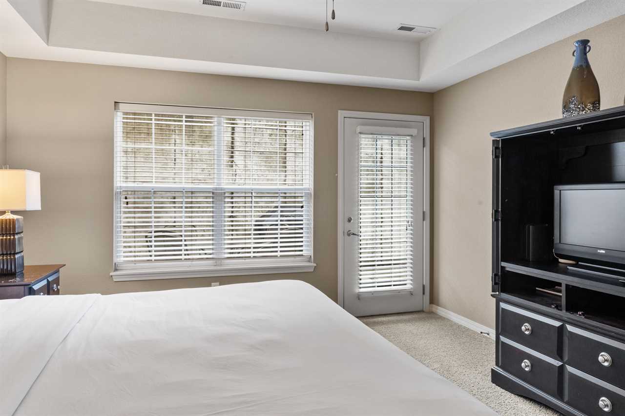 ✦ ✦ Bedroom 1 (Main Level): King bed 🛏️, cable TV 📺, ensuite bath (jetted tub 🛁 + shower 🚿), and patio access 🌳
