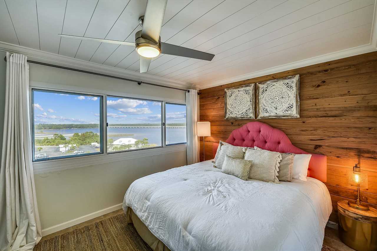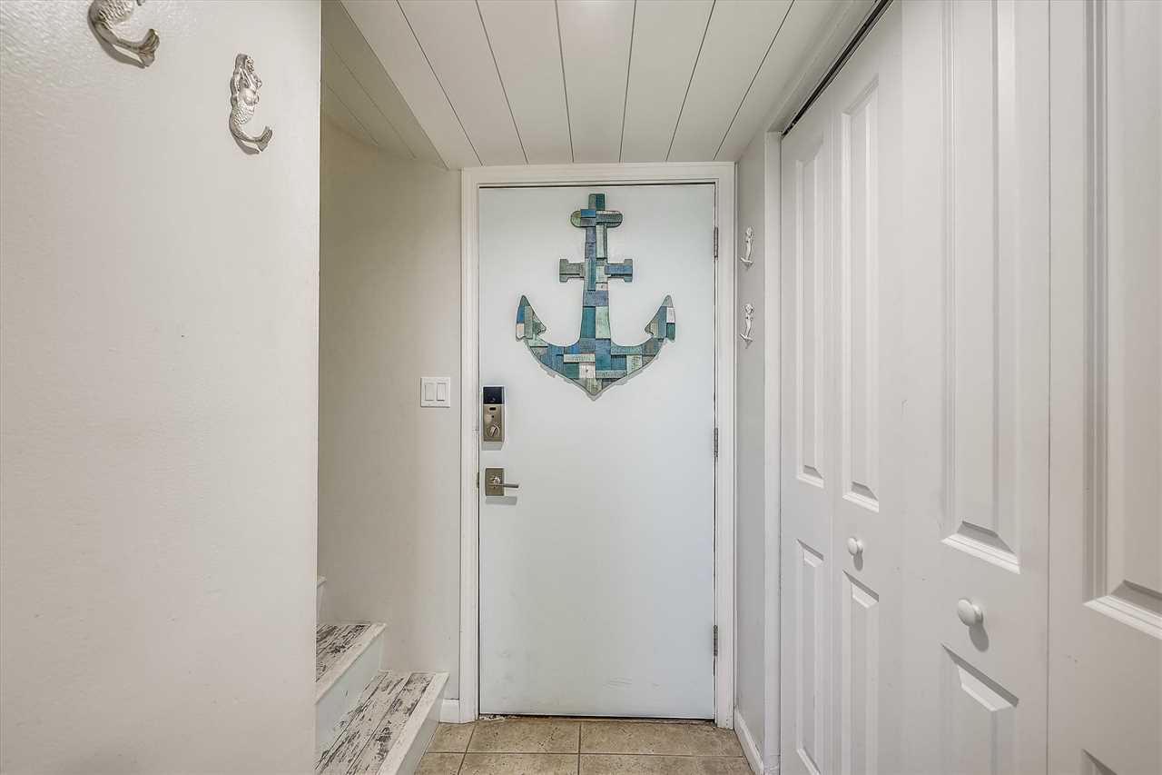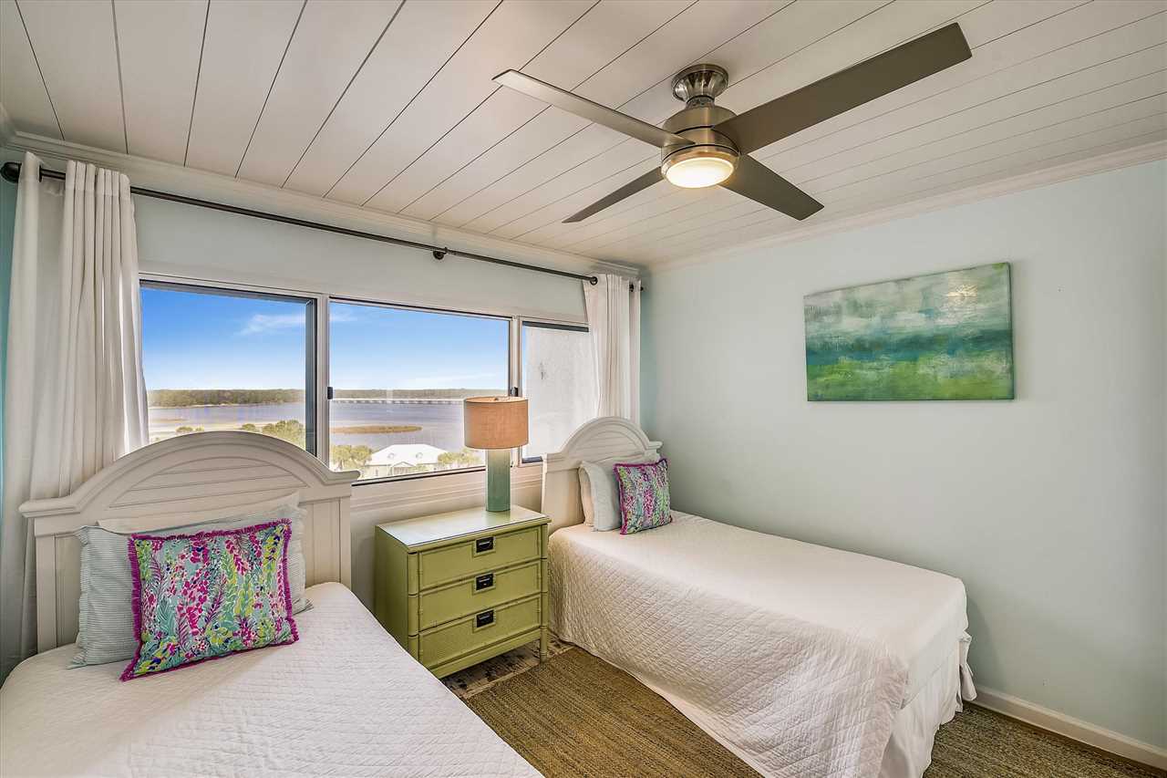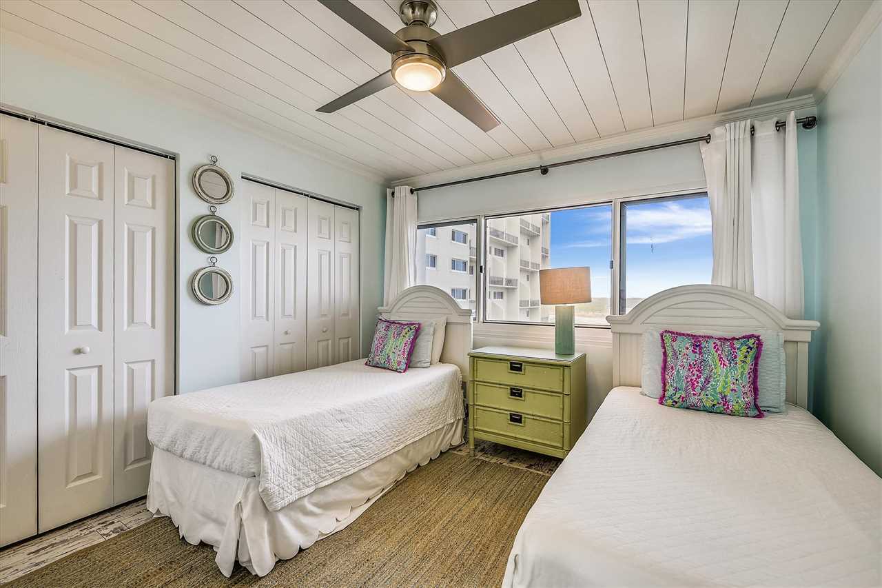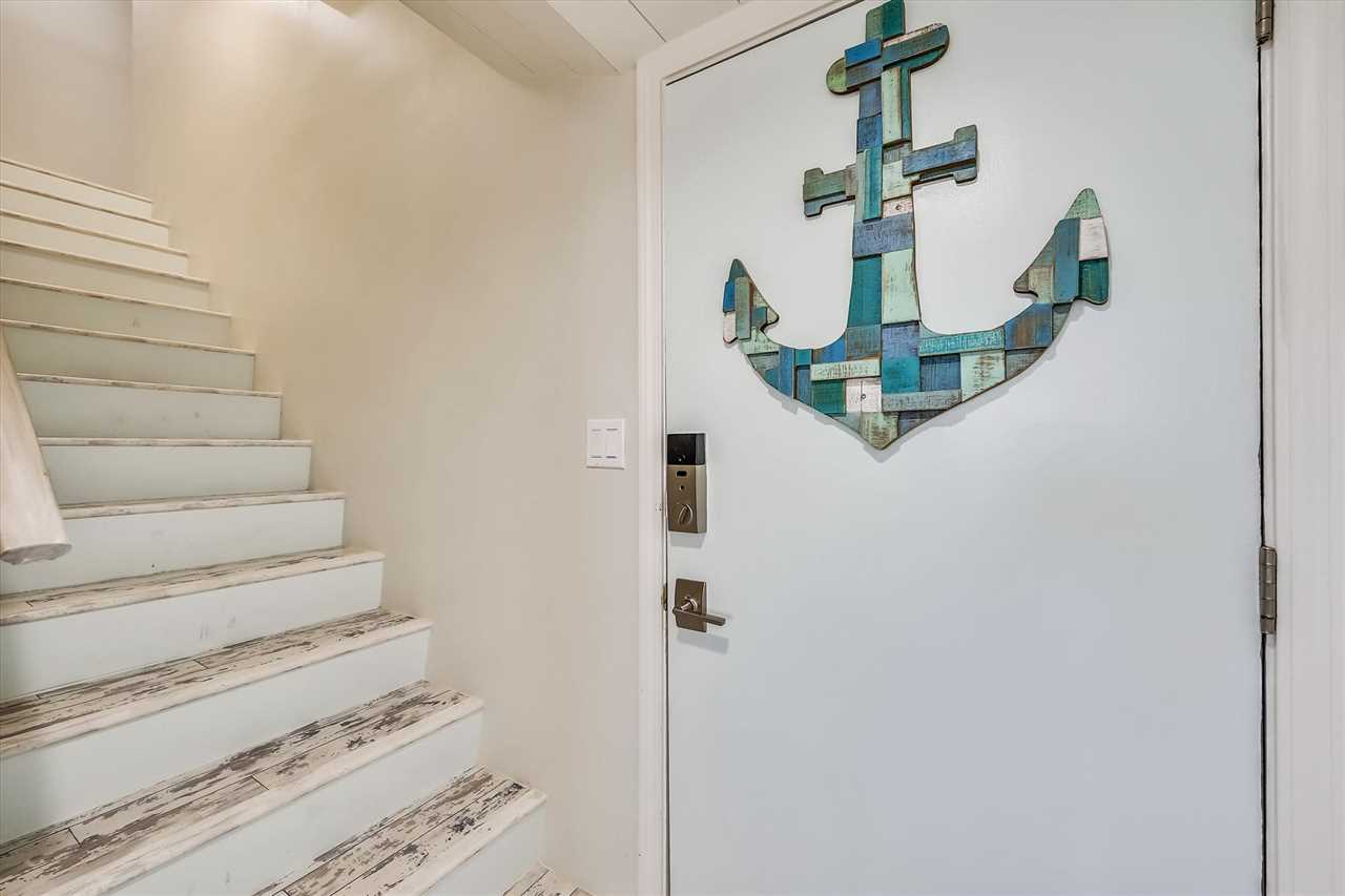 As you make your way upstairs, you'll find the sleeping area. The front bedroom has a set of twin beds and spacious closet. In the hallway, there is a full bathroom with shower. The master bedroom has a king bed, spacious closet, and balcony with Gulf View. There is also a full size master bathroom with tub/shower combo.