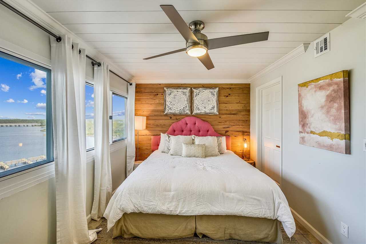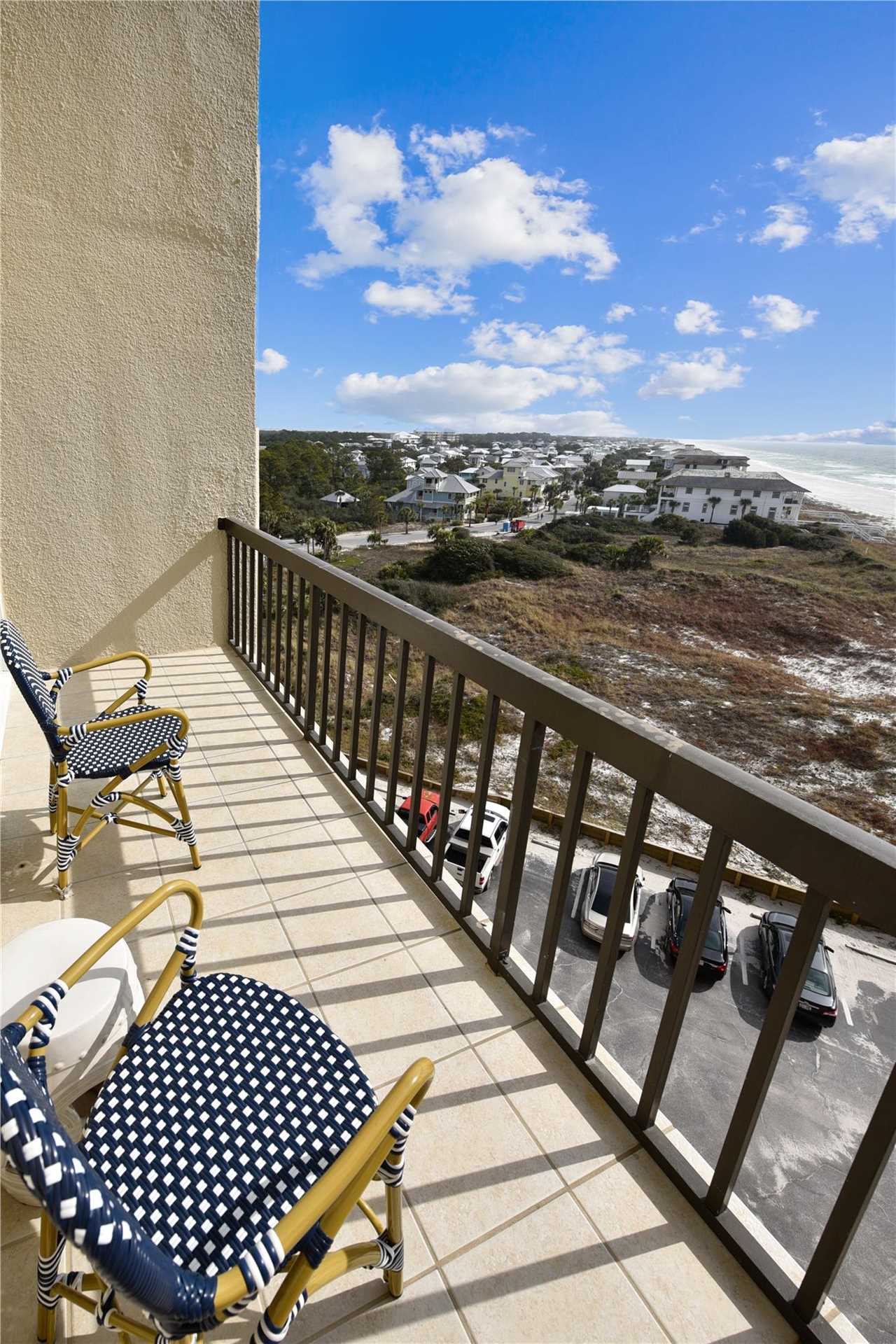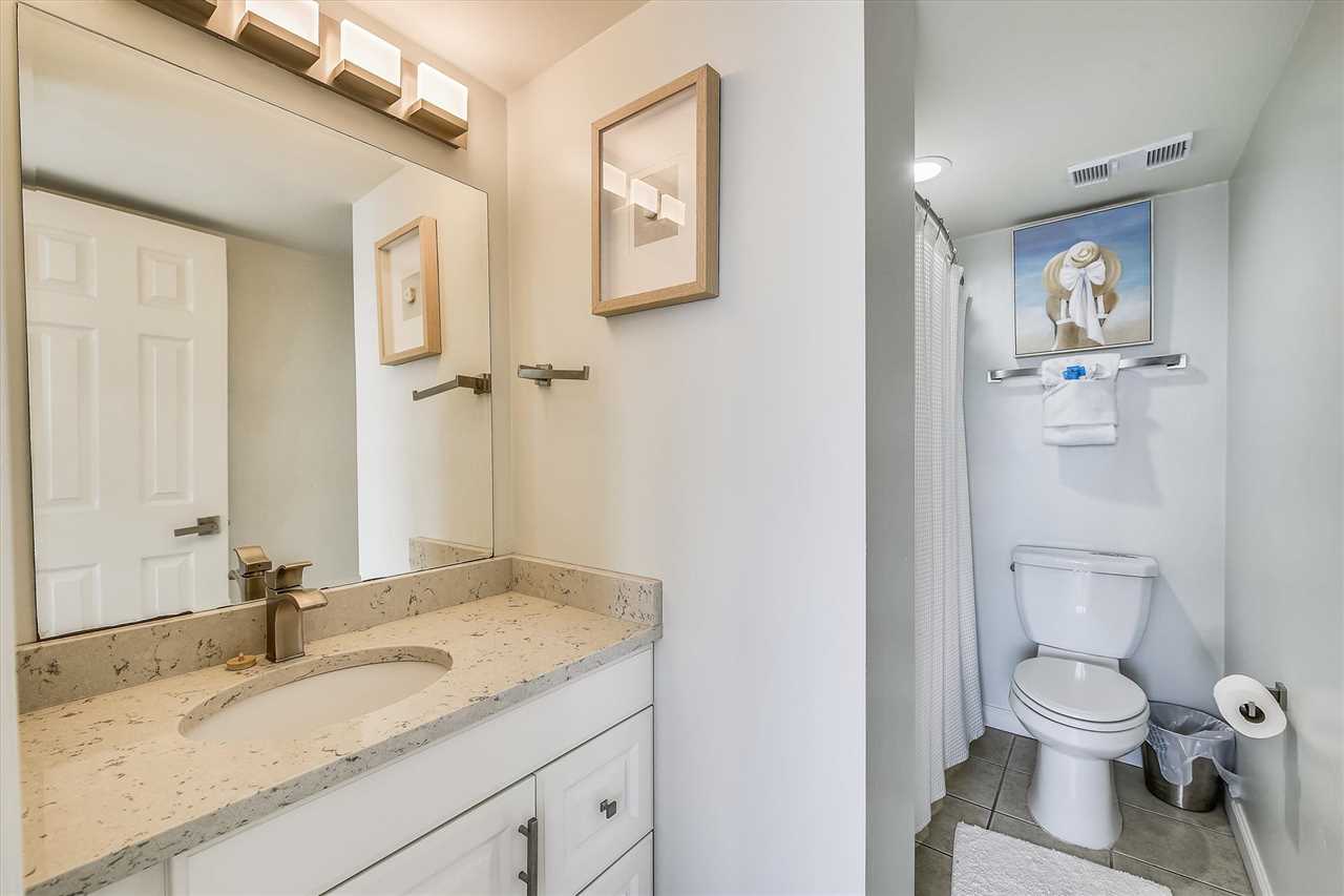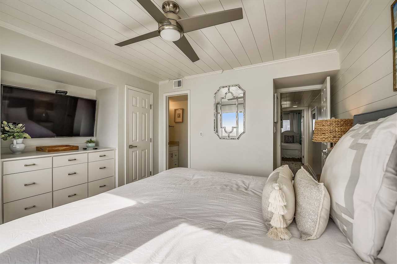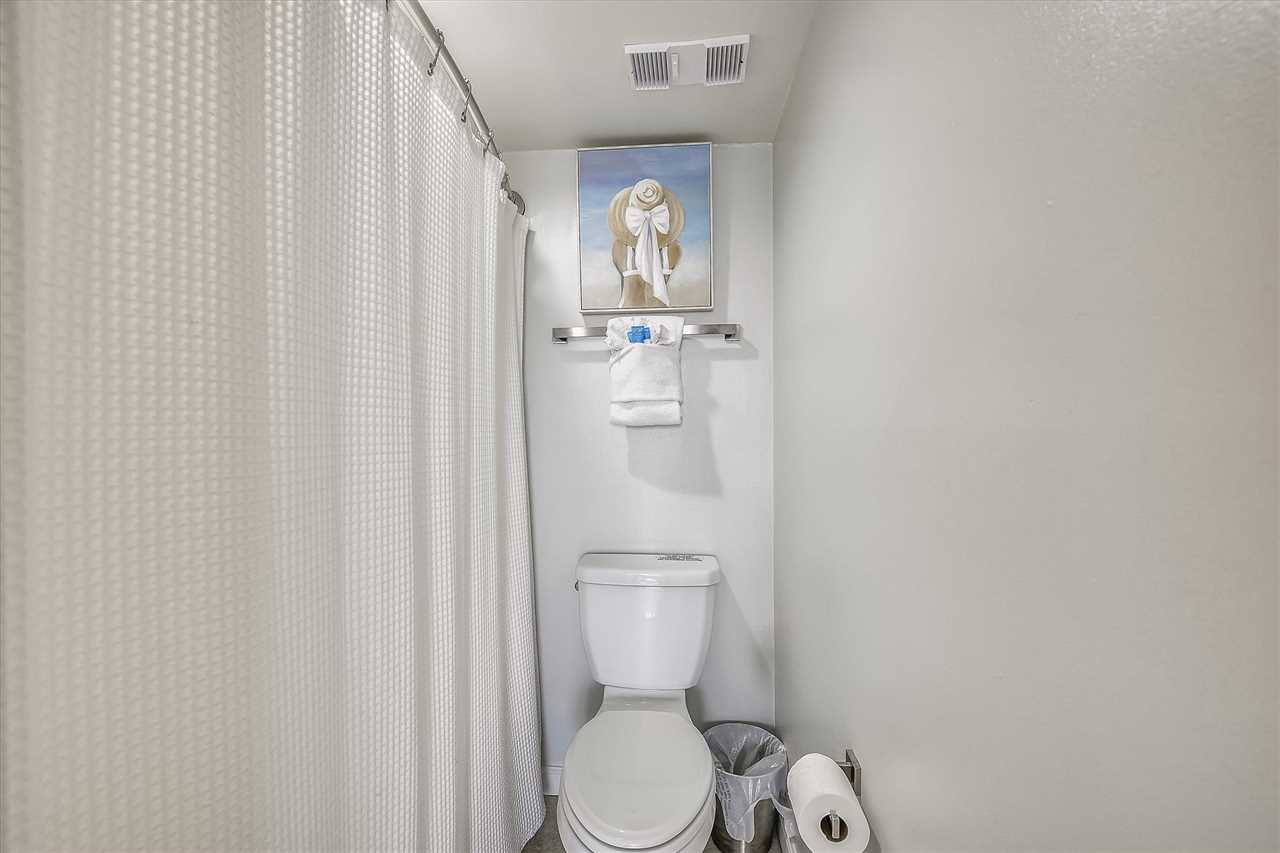 As you make your way upstairs, you'll find the sleeping area. The front bedroom has a set of twin beds and spacious closet. In the hallway, there is a full bathroom with shower. The master bedroom has a king bed, spacious closet, and balcony with Gulf View. There is also a full size master bathroom with tub/shower combo.
