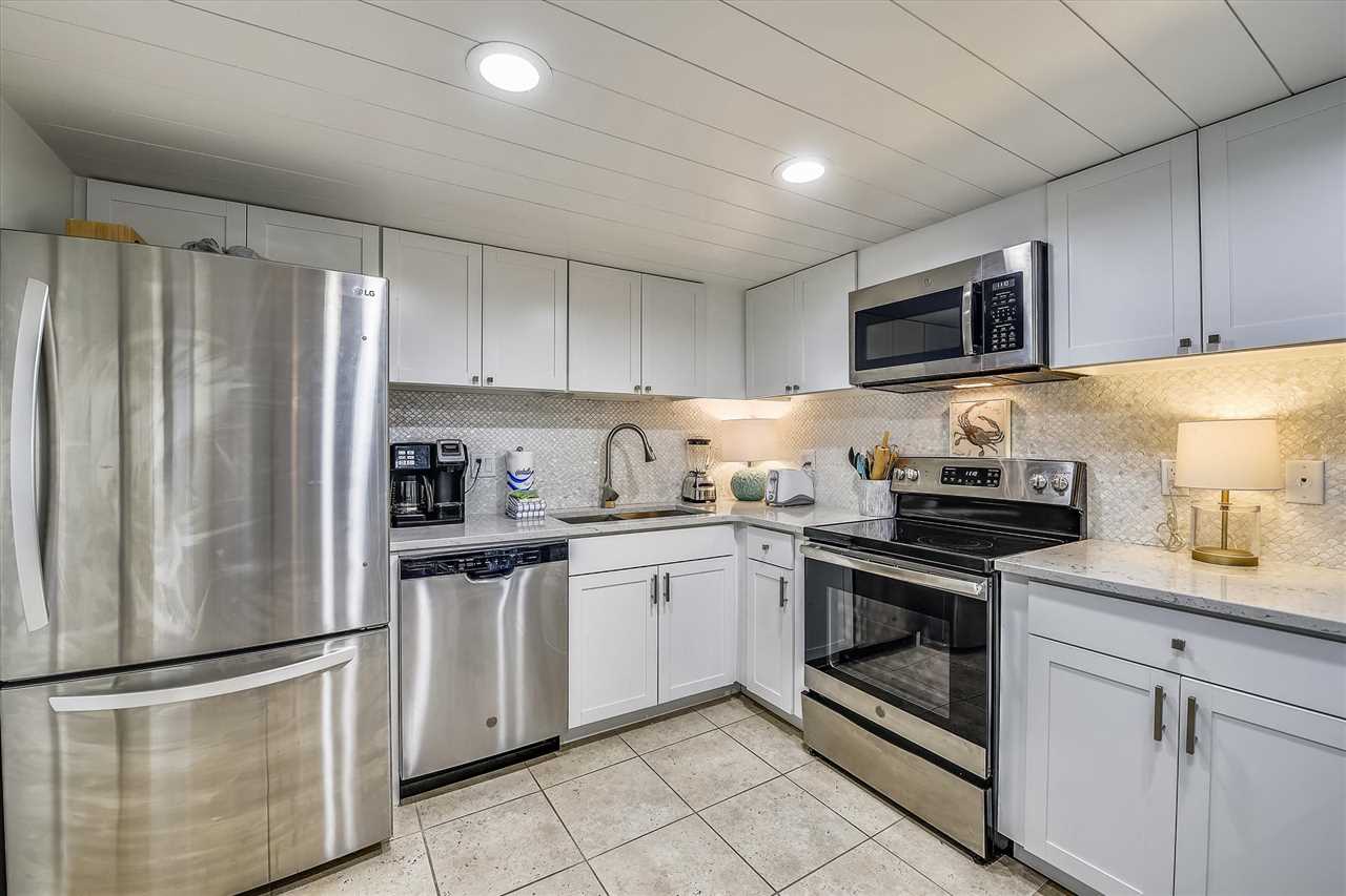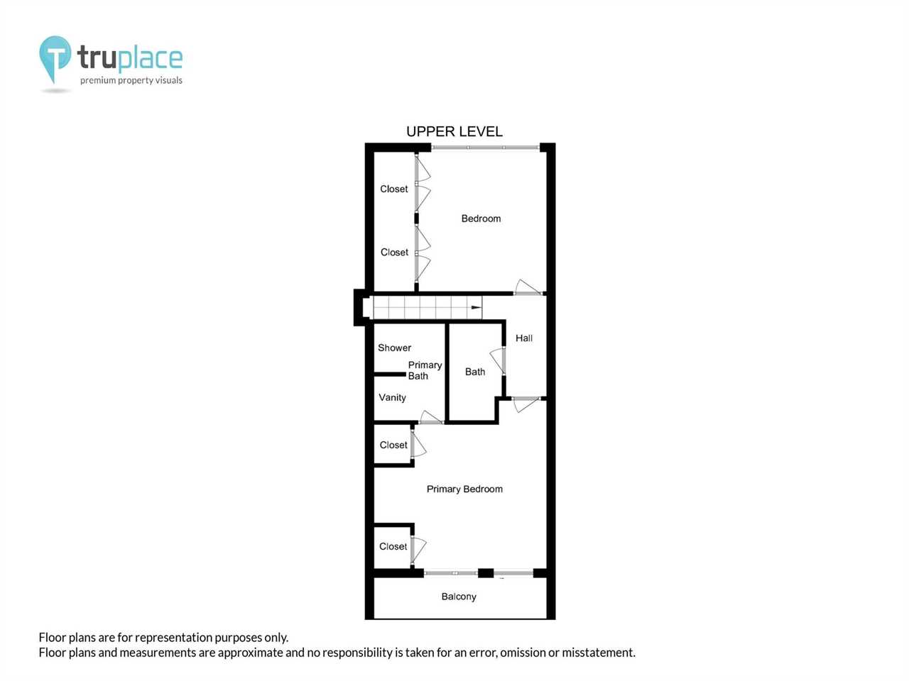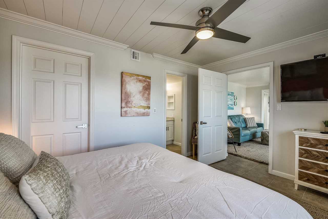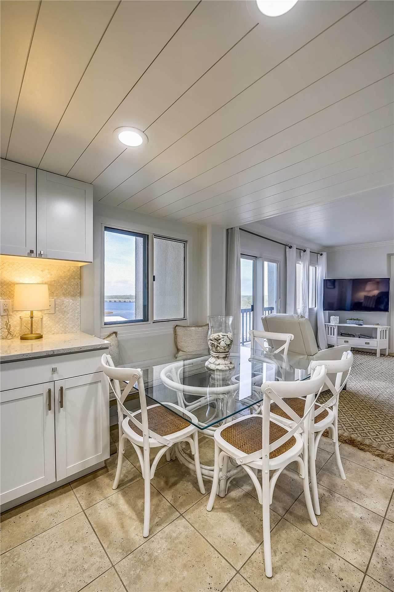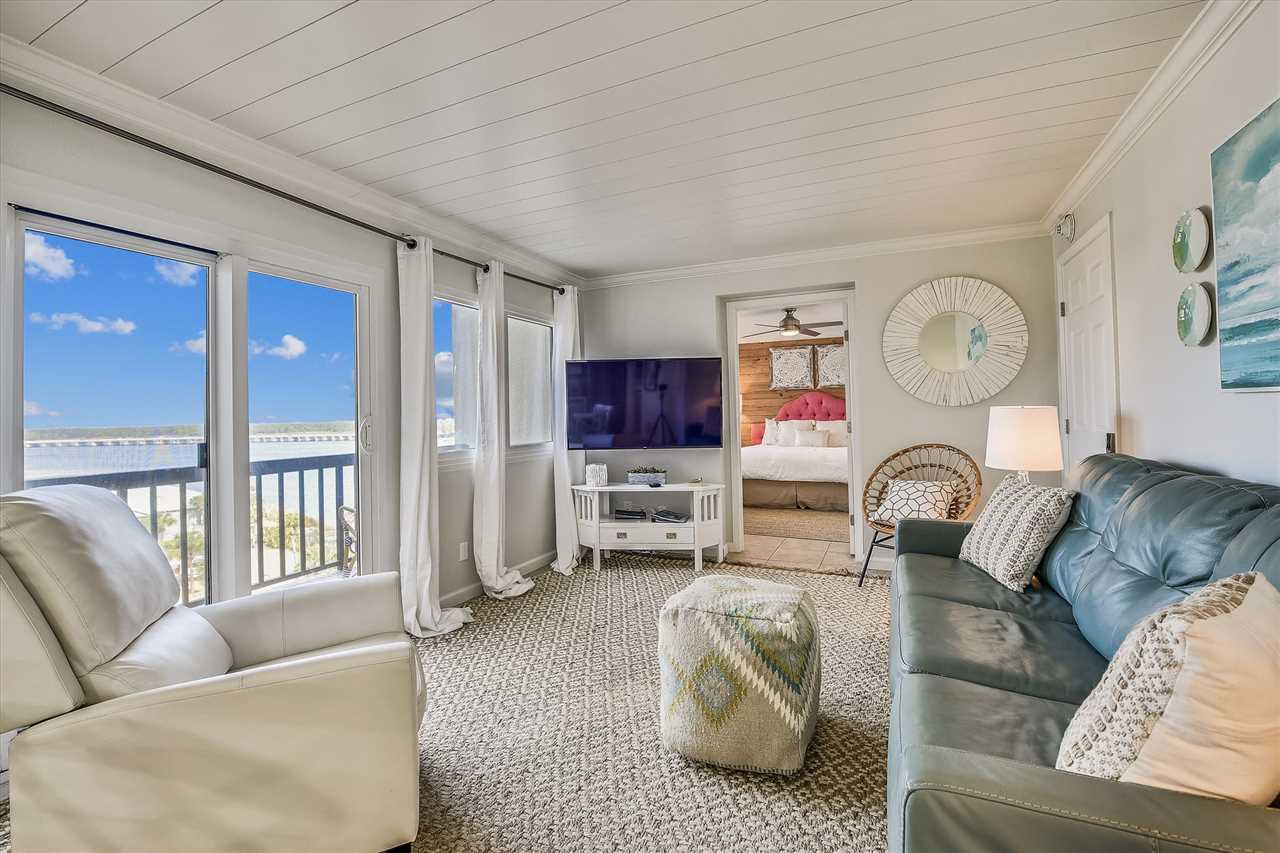 As you make your way upstairs, you'll find the sleeping area. The front bedroom has a set of twin beds and spacious closet. In the hallway, there is a full bathroom with shower. The master bedroom has a king bed, spacious closet, and balcony with Gulf View. There is also a full size master bathroom with tub/shower combo.