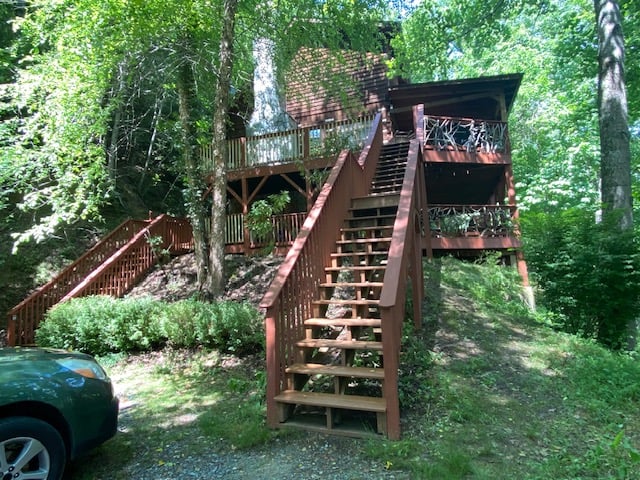 On the main level, the expansive deck offers an even more impressive vantage point of the view. Enjoy meals at the live-edge dining table, relax in classic rocking chairs, or sway gently in the chair swing as you sip morning coffee or evening drinks.