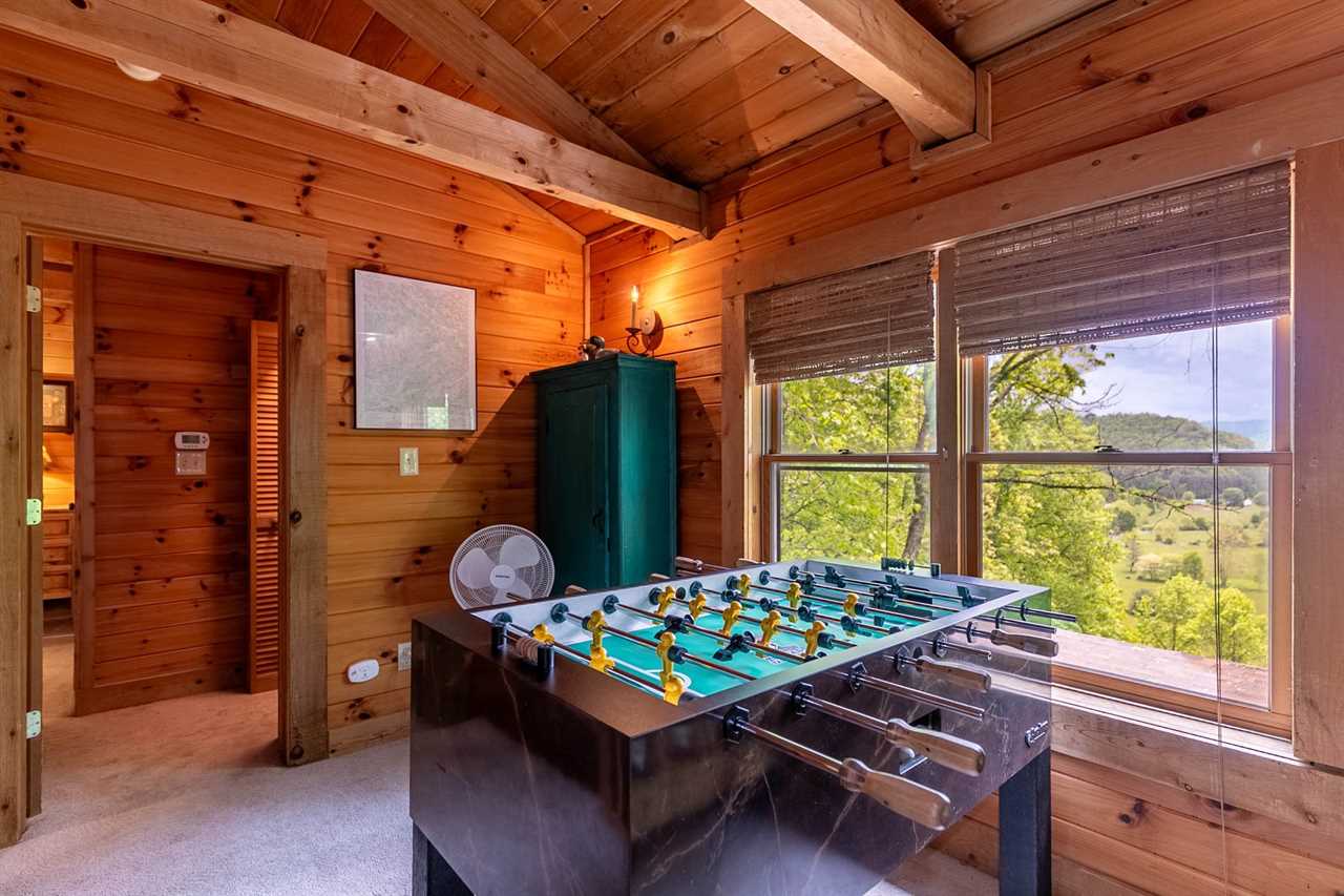 Upstairs, a loft overlooks the great room below and provides a fun and flexible space with foosball and a custom log twin-over-twin bunk bed. Adjacent to the loft is a queen bedroom with its own private TV and ensuite bathroom featuring a charming cast iron tub and shower combination.