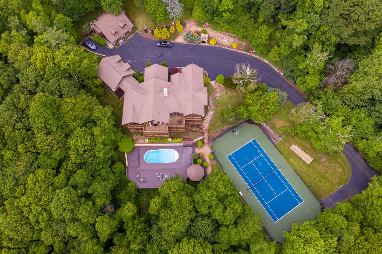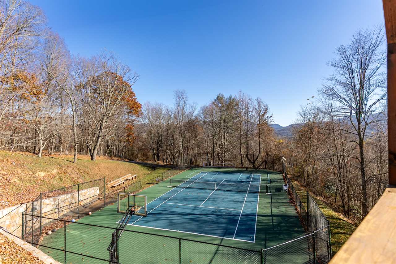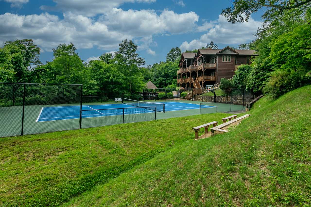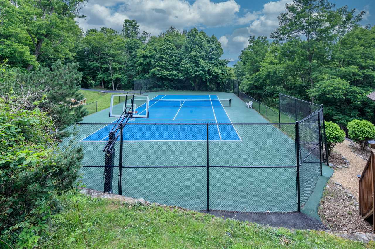 The outside spaces of Banner Crest feature unmatched recreation and relaxation options for everyone in your group. Both levels of the main house have expansive covered deck with multiple seating arrangements, and the main level deck includes an outdoor gas fireplace with patio tablel, providing a perfect place to relax during cooler evenings. Down a flight of stairs from the main house you'll find a heated in-ground swimming pool and a cabana deck with several chaise loungers and an outdoor couch. Shade yourself from the sun in the gazebo at the end of the deck and you'll have a bird's eye view of the tennis courts and basketball goal below (bring your favorite basketballs and tennis rackets & balls!) Across the driveway facing the house is a wooded park-like setting with a picnic table and in-ground stone fire ring, accessed by trail-style railroad tie stairs.