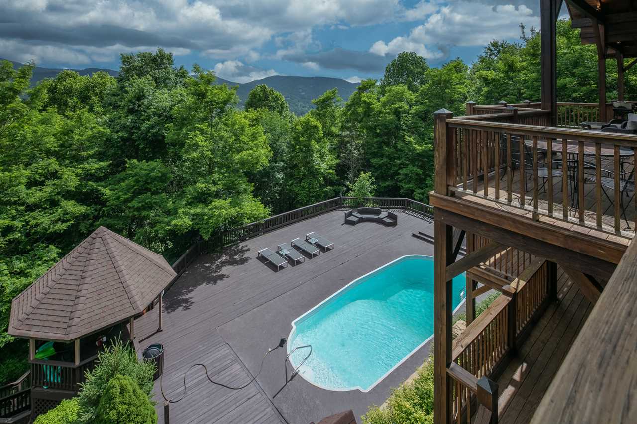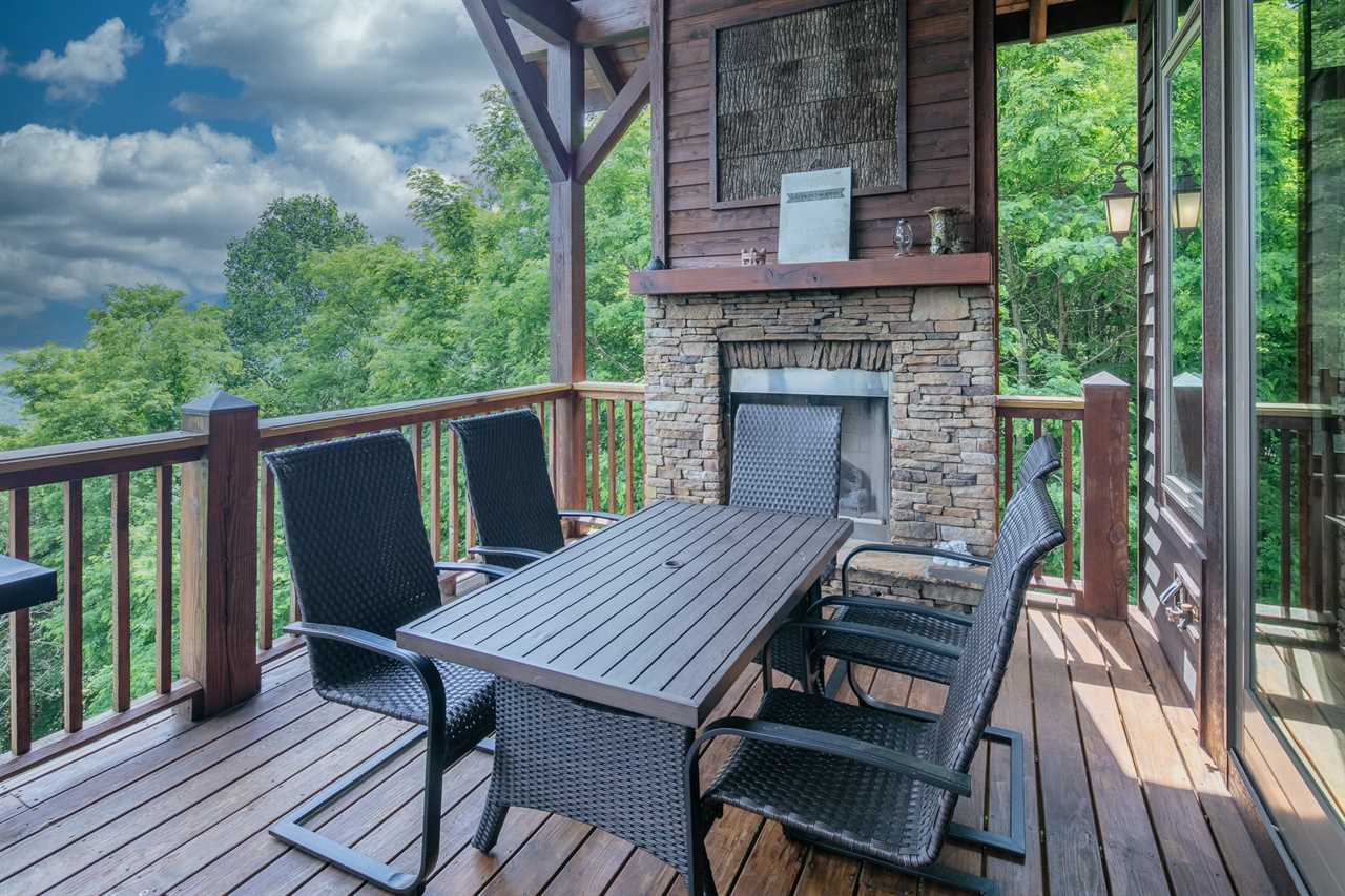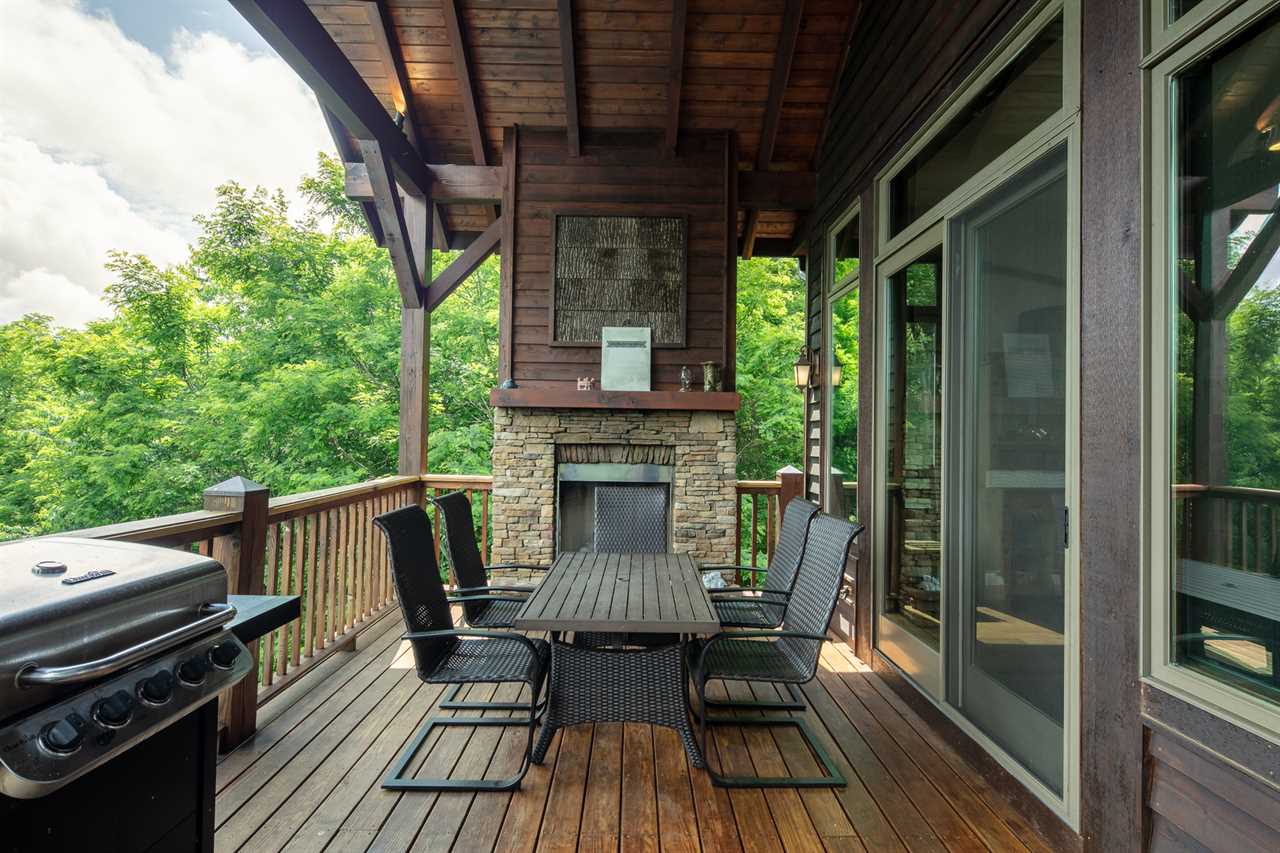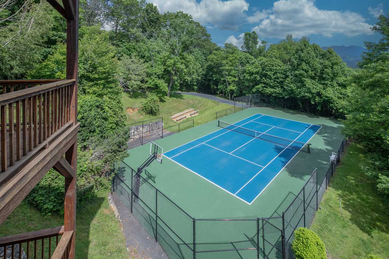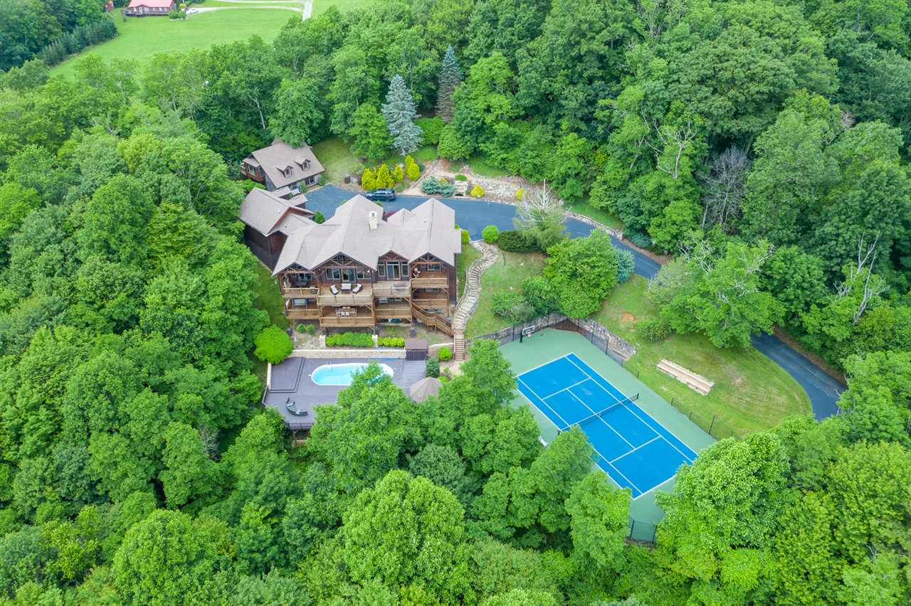 The outside spaces of Banner Crest feature unmatched recreation and relaxation options for everyone in your group. Both levels of the main house have expansive covered deck with multiple seating arrangements, and the main level deck includes an outdoor gas fireplace with patio tablel, providing a perfect place to relax during cooler evenings. Down a flight of stairs from the main house you'll find a heated in-ground swimming pool and a cabana deck with several chaise loungers and an outdoor couch. Shade yourself from the sun in the gazebo at the end of the deck and you'll have a bird's eye view of the tennis courts and basketball goal below (bring your favorite basketballs and tennis rackets & balls!) Across the driveway facing the house is a wooded park-like setting with a picnic table and in-ground stone fire ring, accessed by trail-style railroad tie stairs.