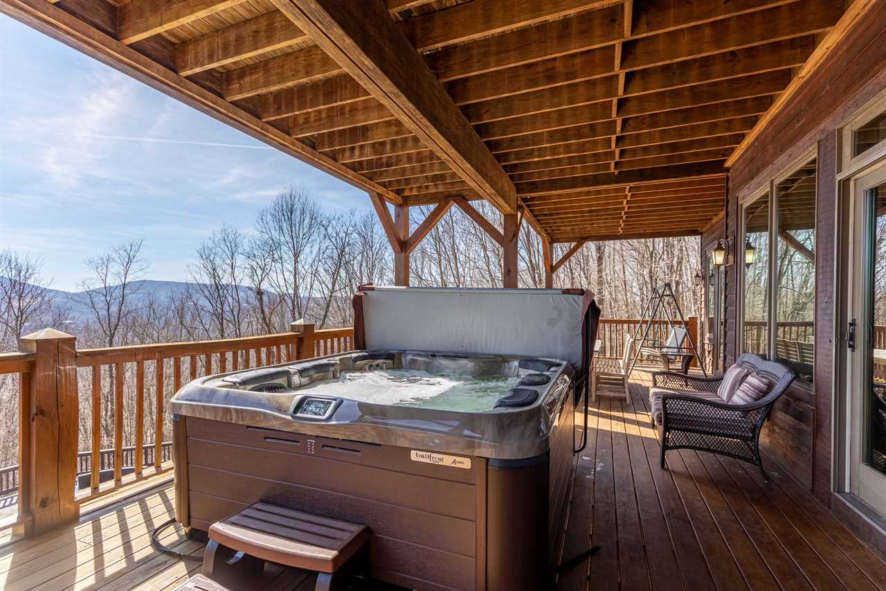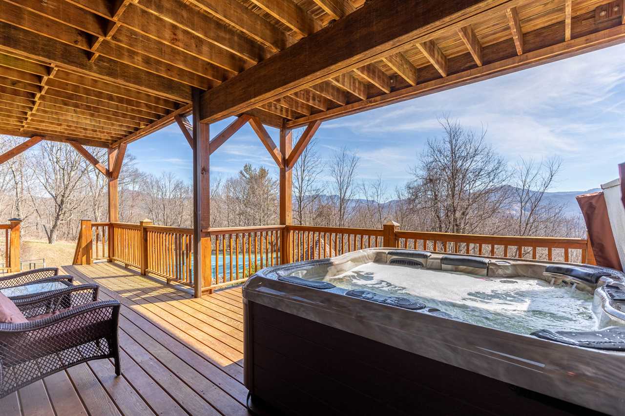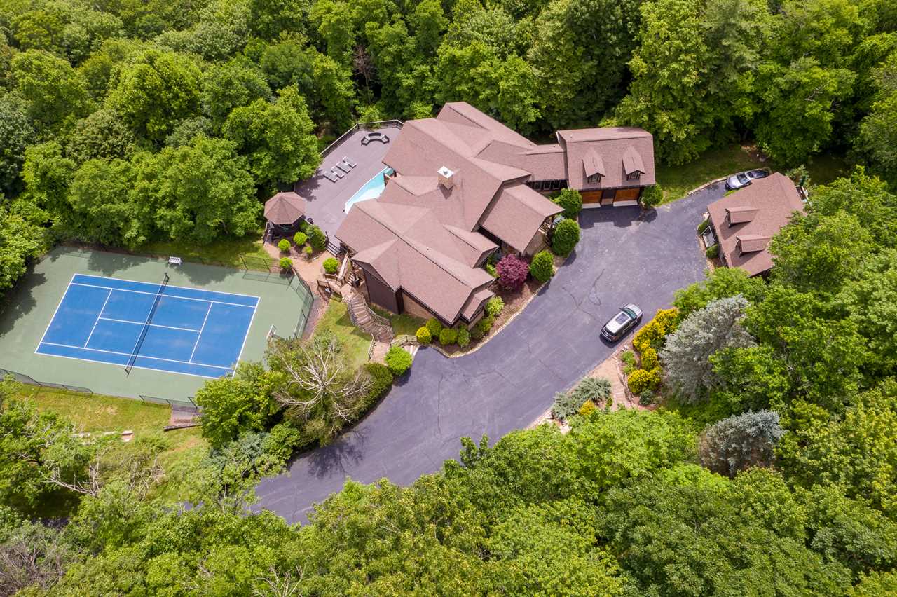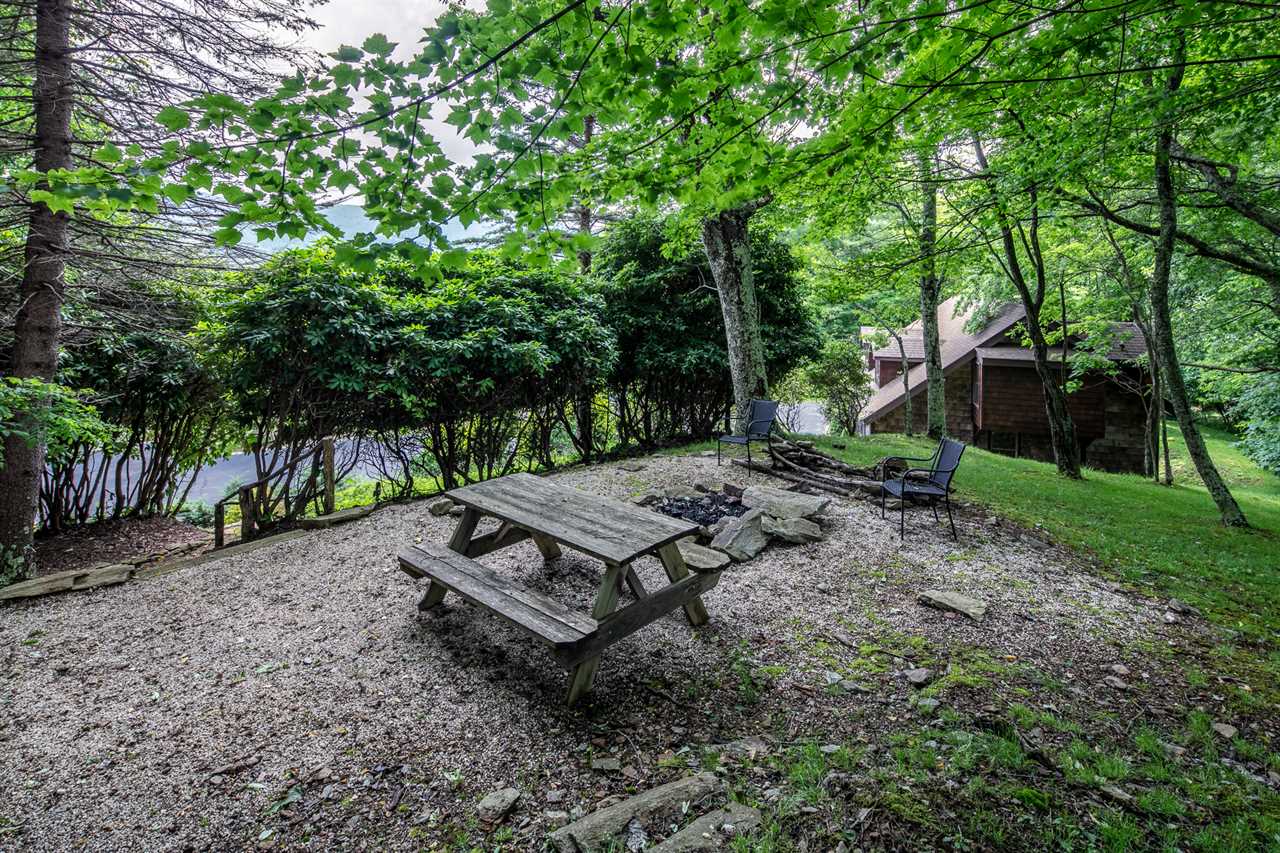 The outside spaces of Banner Crest feature unmatched recreation and relaxation options for everyone in your group. Both levels of the main house have expansive covered deck with multiple seating arrangements, and the main level deck includes an outdoor gas fireplace with patio tablel, providing a perfect place to relax during cooler evenings. Down a flight of stairs from the main house you'll find a heated in-ground swimming pool and a cabana deck with several chaise loungers and an outdoor couch. Shade yourself from the sun in the gazebo at the end of the deck and you'll have a bird's eye view of the tennis courts and basketball goal below (bring your favorite basketballs and tennis rackets & balls!) Across the driveway facing the house is a wooded park-like setting with a picnic table and in-ground stone fire ring, accessed by trail-style railroad tie stairs.