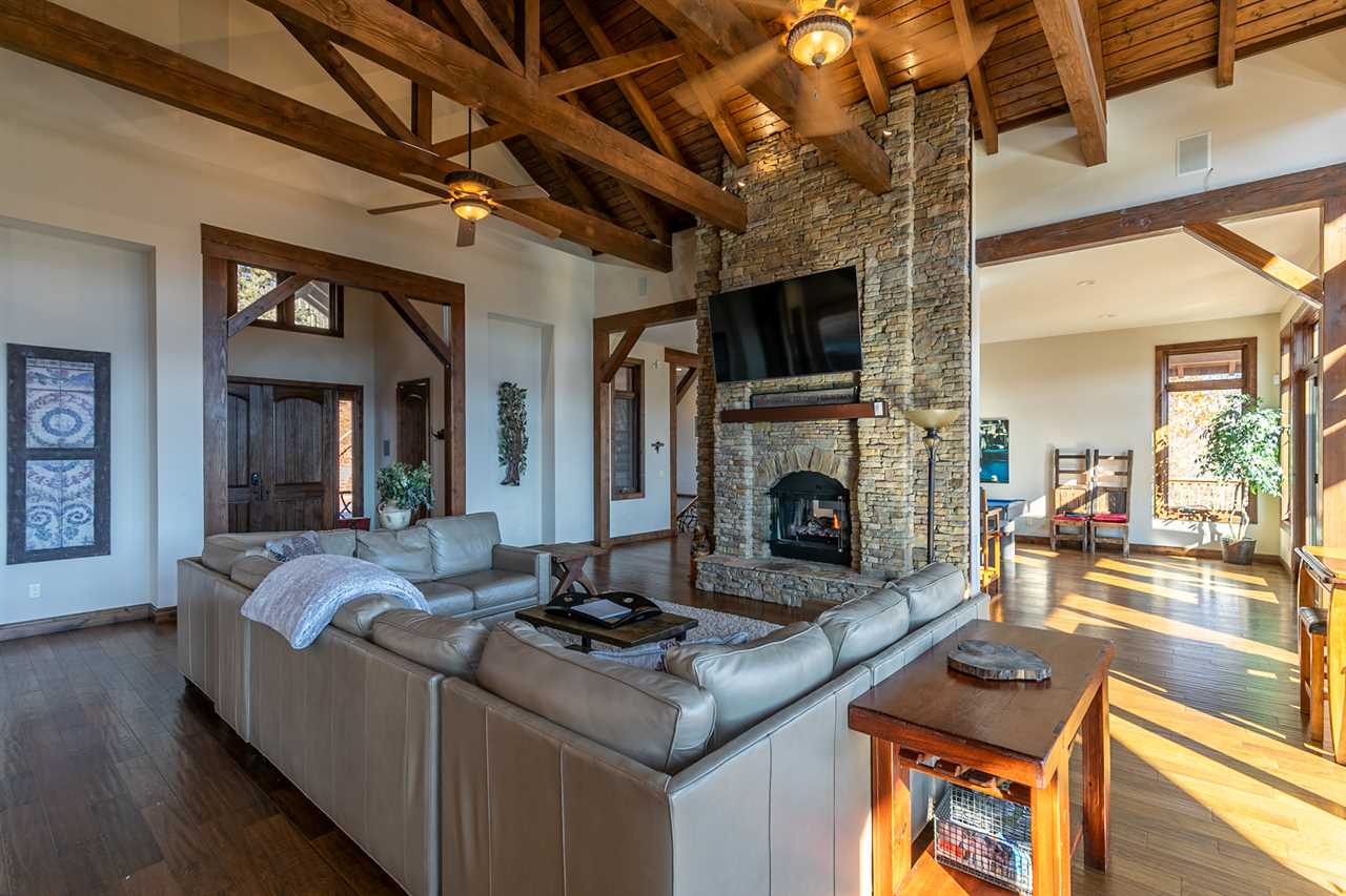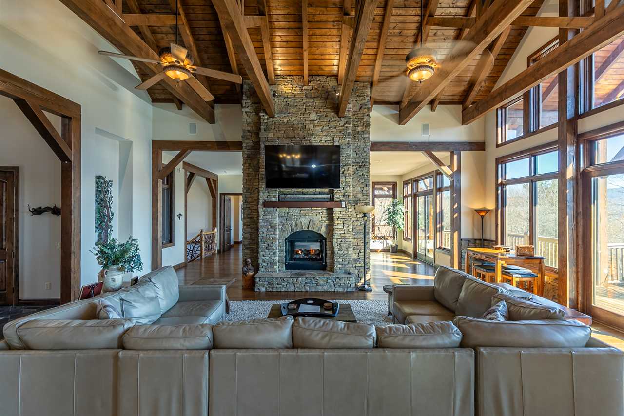 The main level of the main house is accessed with just two steps, offering easy entry for everyone in your group. Enter through the solid oak door and walk through the foyer, and prepare to have your breath taken by the stunning interior. The great room features hardwood floors and soaring tongue & groove ceilings with impressive beams overhead. The double-sided stone gas log fireplace reaching all the way to the ceiling is the focal point of this room, along with the wall of windows overlooking the ever-changing mountain views. Leather furnishings are arranged around the fireplace and there's a large flatscreen TV mounted above.