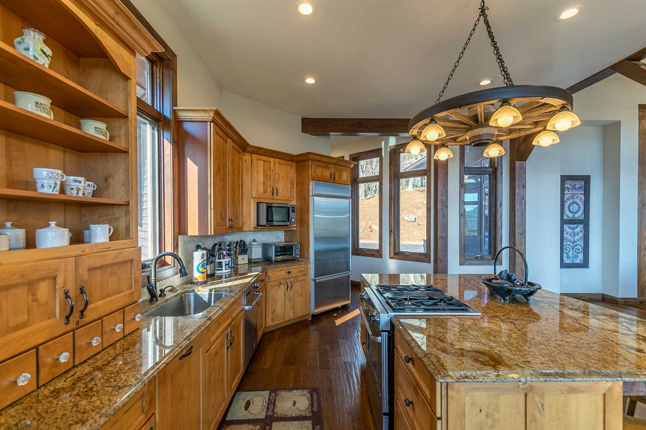 The spacious kitchen is a chef's dream. Granite counters and a huge island, custom cabinets, stainless steel appliances, Keurig, and a gas stovetop combine to create a perfect place for cooks of all skill levels. The dining table has room for up to 10 with additional seating for 5 at the island and 4 more at the breakfast table in the great room.