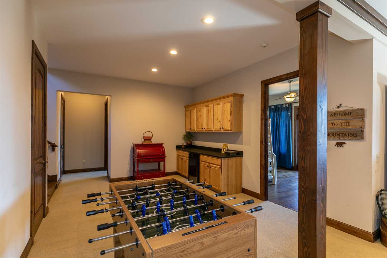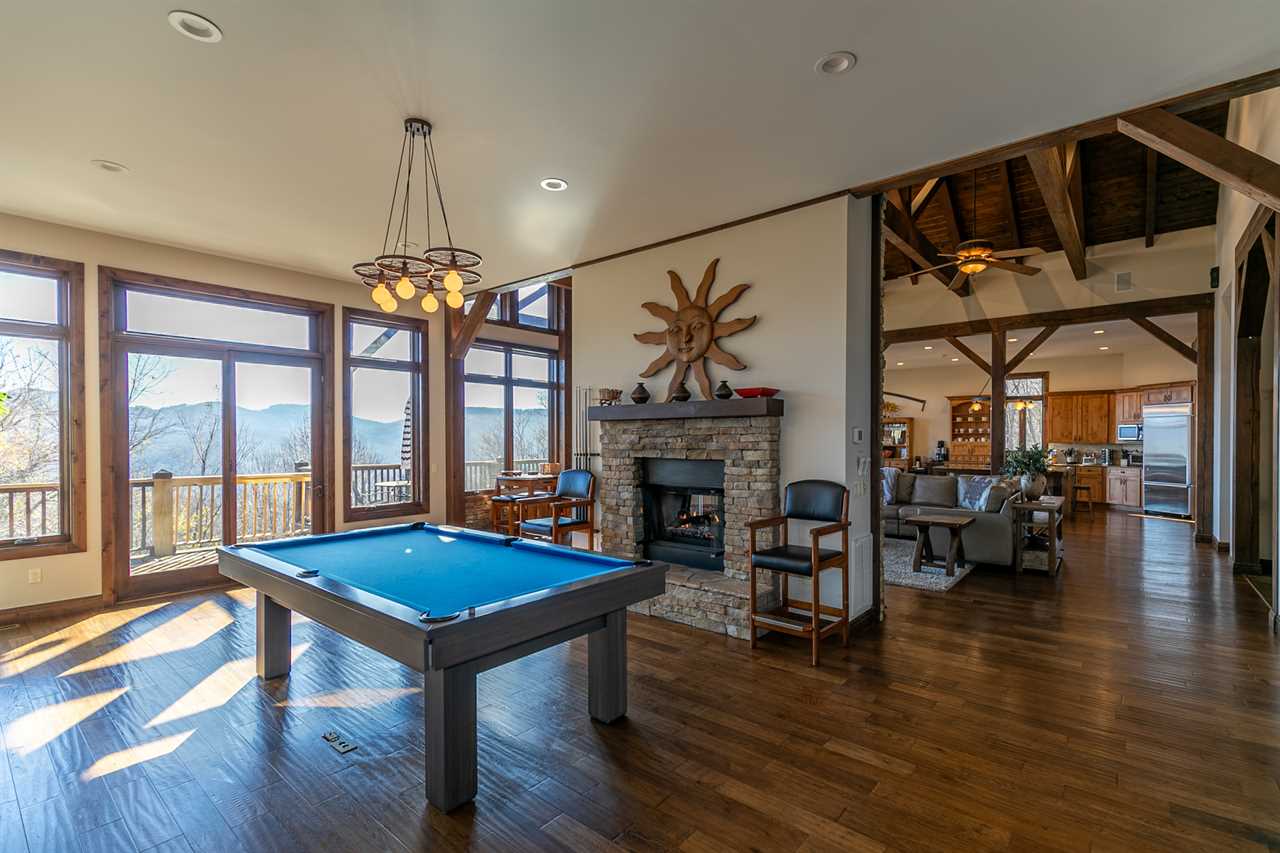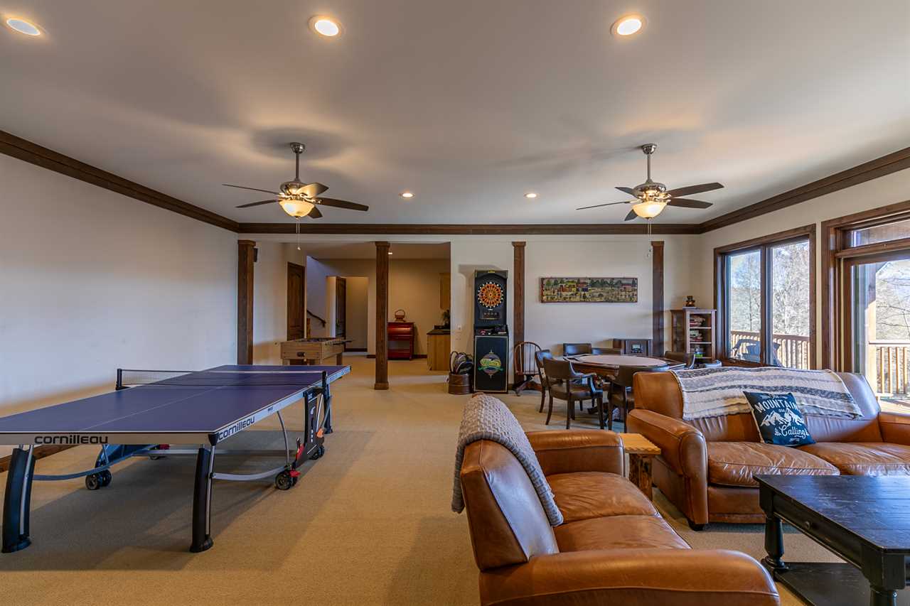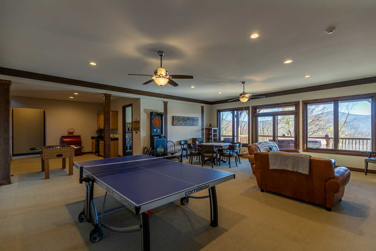 On the other side of the fireplace you'll find a game room with a pool table as well as the staircase heading to the lower level. Downstairs is a second living area. This room offers comfortable leather seating, an electric fireplace, a TV, kitchenette, and a game area with foosball and a ping pong table.