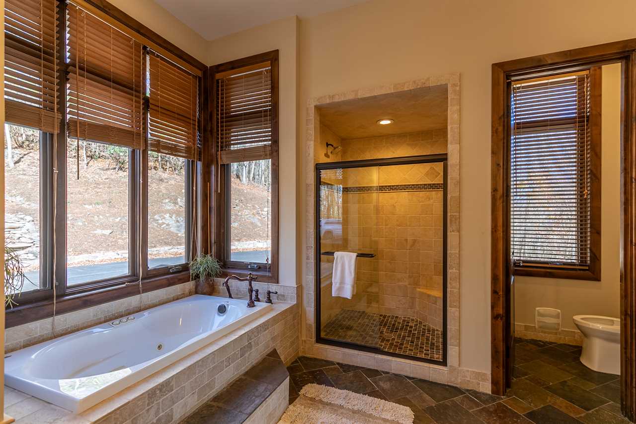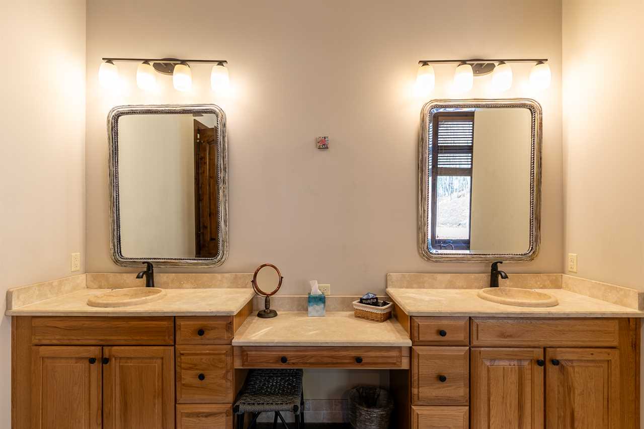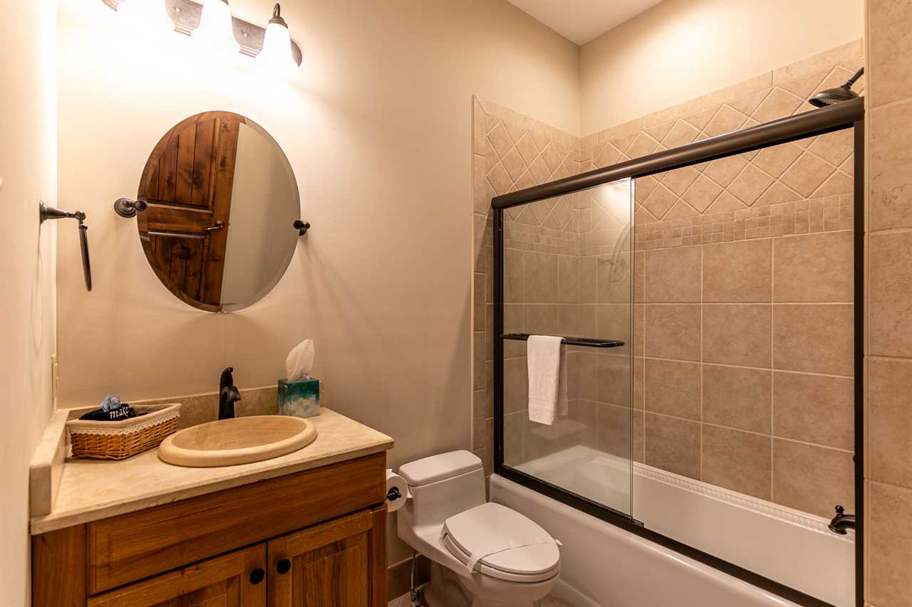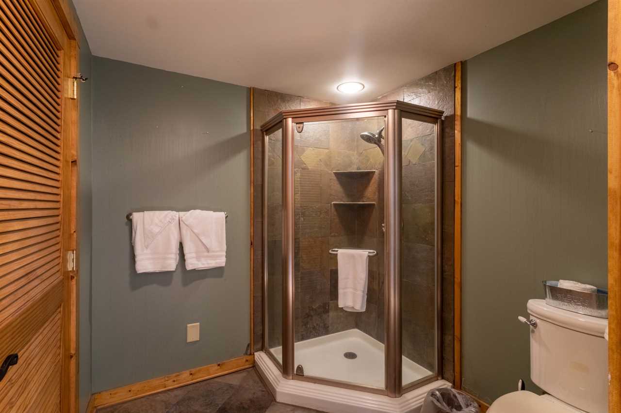Banner Crest offers luxurious sleeping accommodations for everyone in your group. On the main level in the main house, you'll find a master bedroom with a King bed, TV, and sliding doors to the deck. Its private bathroom offers an oversized travertine tiled shower, a separate jetted bathtub, and marble double sinks with a makeup vanity in the middle. Downstairs you'll find three more bedrooms. Two suites each have a Queen bed with private tiled shower, and the third offers a twin-over-full bunk bed. There is a tiled tub/shower combination on the lower level for the common area and bunk room.