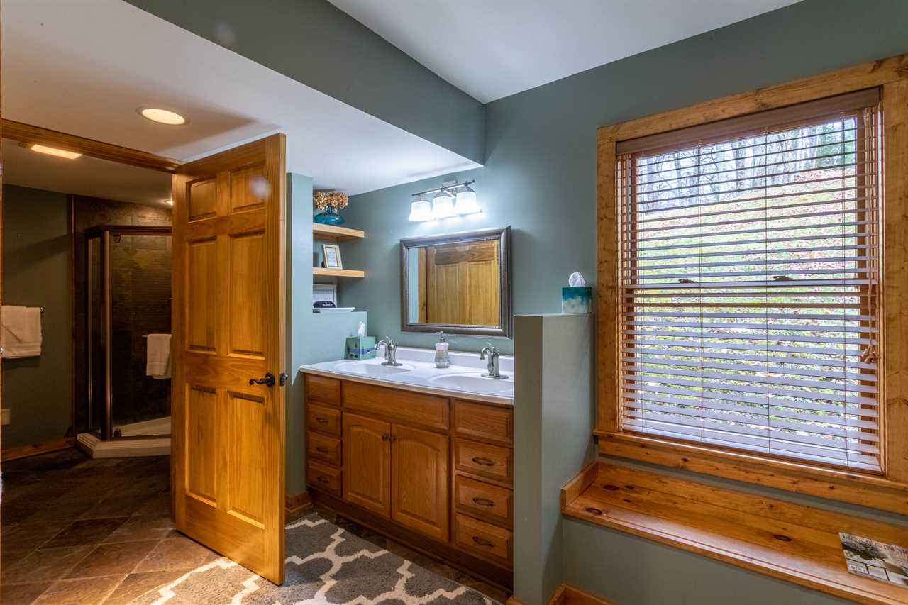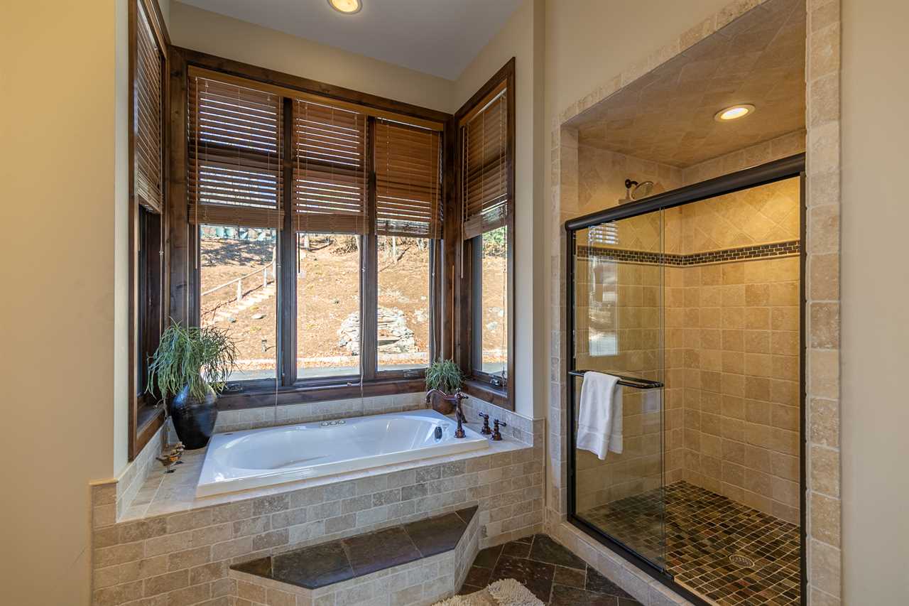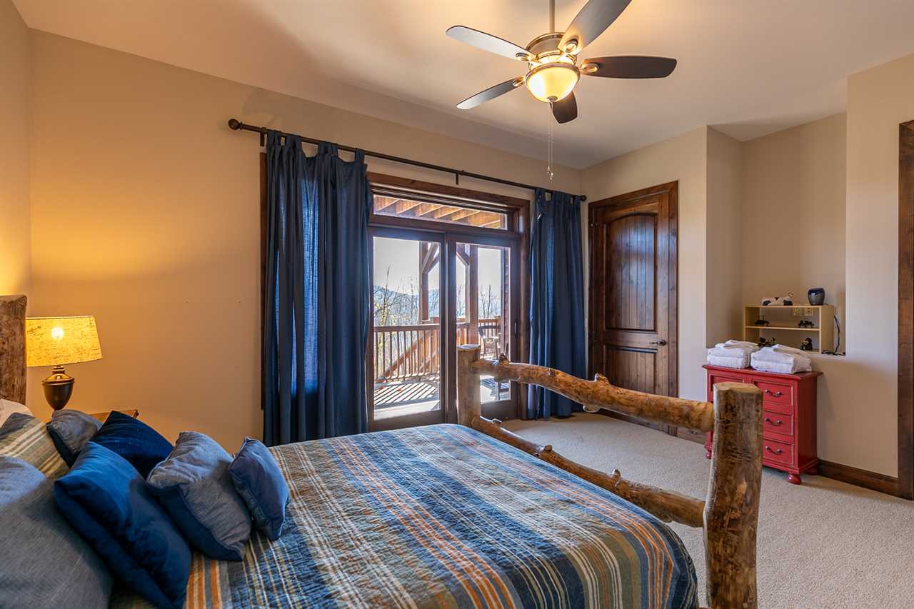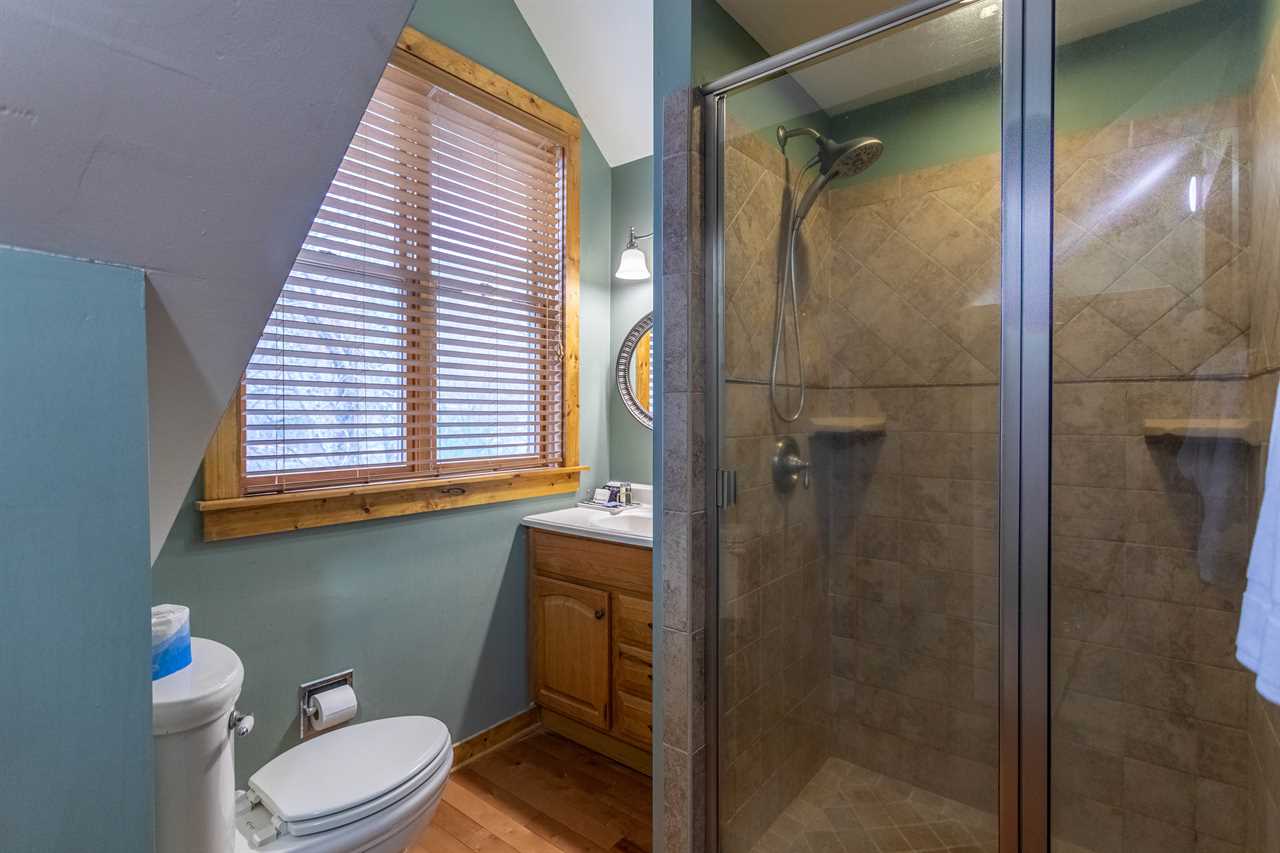 Banner Crest offers luxurious sleeping accommodations for everyone in your group. On the main level in the main house, you'll find a master bedroom with a King bed, TV, and sliding doors to the deck. Its private bathroom offers an oversized travertine tiled shower, a separate jetted bathtub, and marble double sinks with a makeup vanity in the middle. Downstairs you'll find three more bedrooms. Two suites each have a Queen bed with private tiled shower, and the third offers a twin-over-full bunk bed. There is a tiled tub/shower combination on the lower level for the common area and bunk room.
