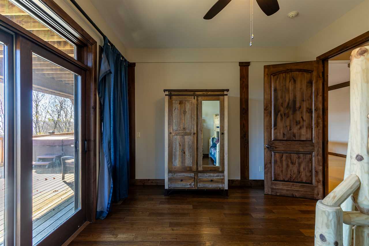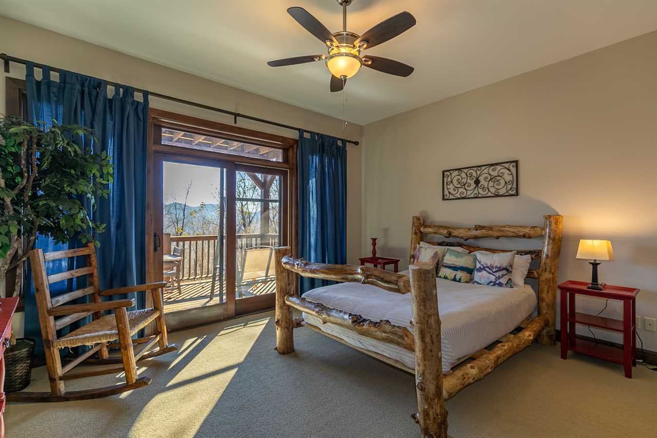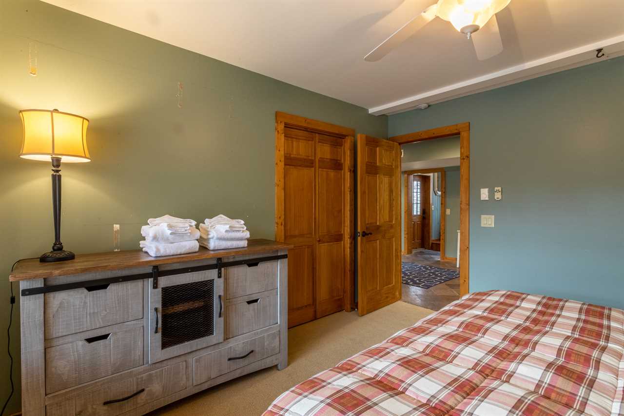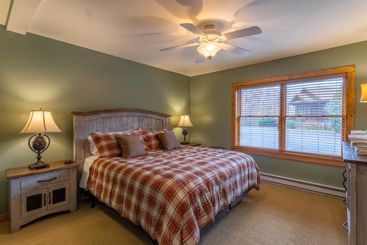 Banner Crest offers luxurious sleeping accommodations for everyone in your group. On the main level in the main house, you'll find a master bedroom with a King bed, TV, and sliding doors to the deck. Its private bathroom offers an oversized travertine tiled shower, a separate jetted bathtub, and marble double sinks with a makeup vanity in the middle. Downstairs you'll find three more bedrooms. Two suites each have a Queen bed with private tiled shower, and the third offers a twin-over-full bunk bed. There is a tiled tub/shower combination on the lower level for the common area and bunk room.