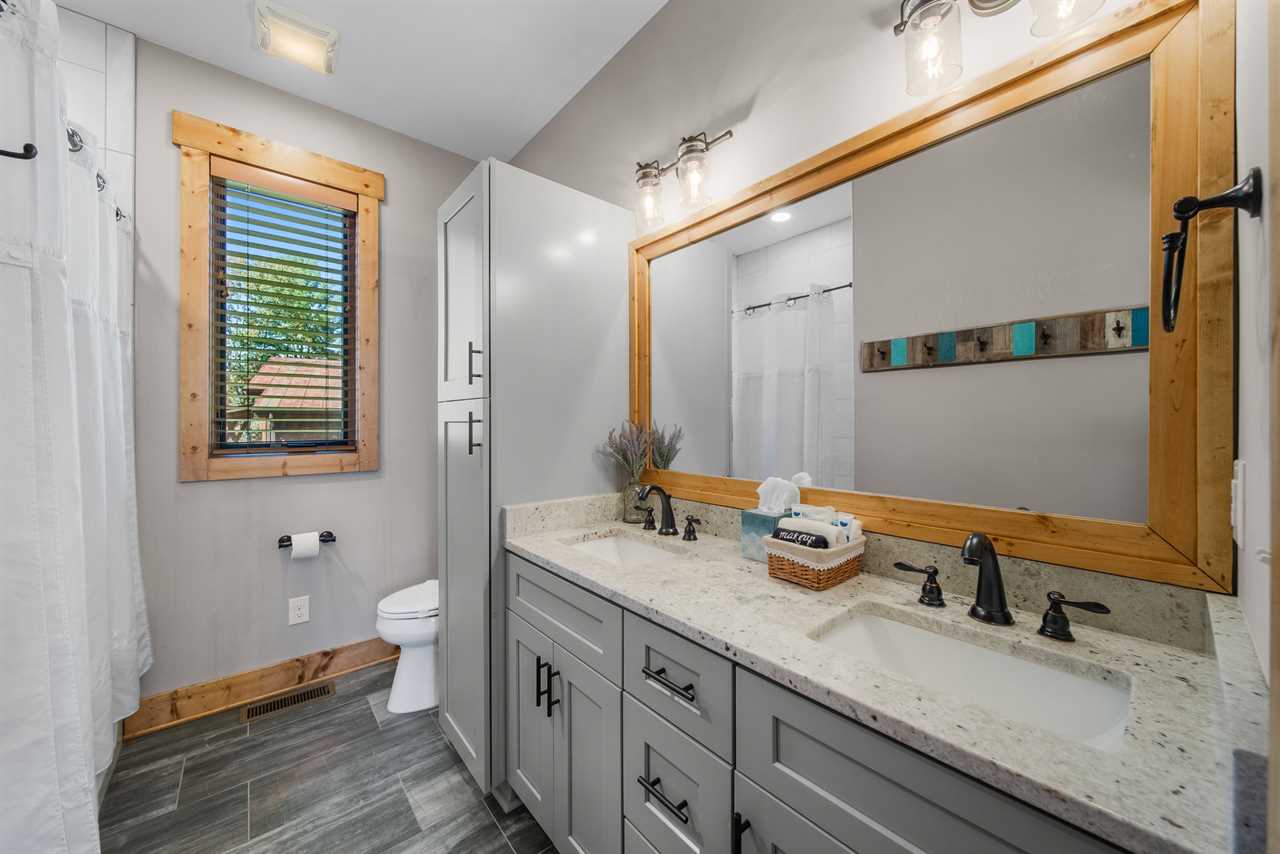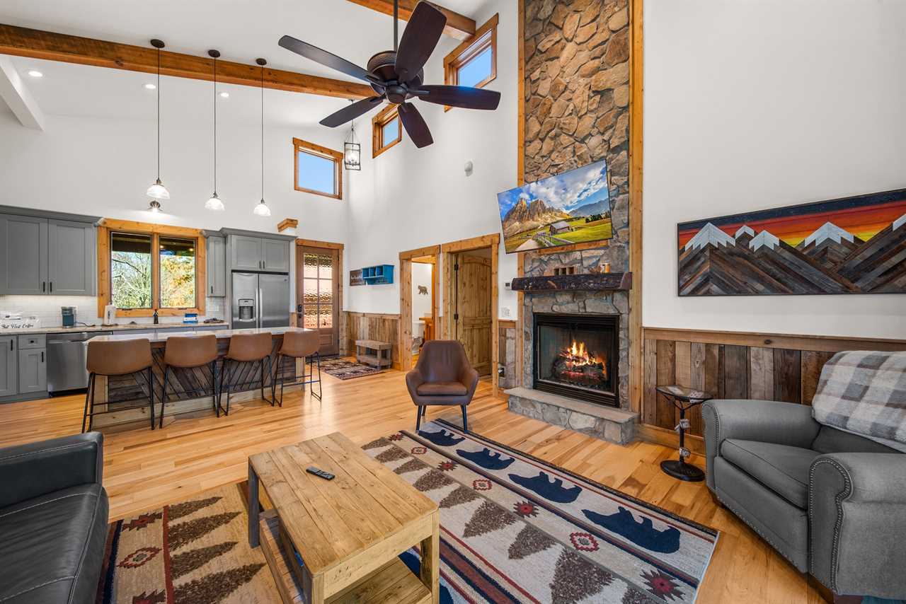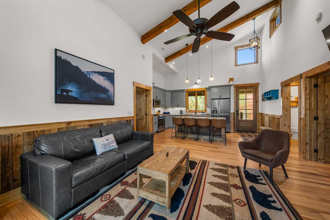 Inside, you'll find a full kitchen, complete with granite counters and a Keurig coffeemaker. The living room has a queen sleeper sofa, electric fireplace with heater, and smart TV. Each wing of the home has a bedroom with private full bath, and then a half bath in the common space for guests. One bedroom has a king bed and TV. The second bedroom has a queen bed. A washer and dryer are in the home, as well.