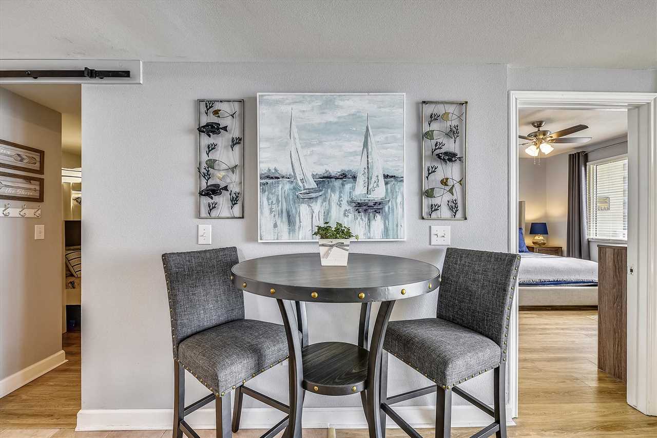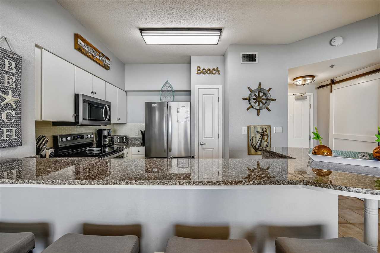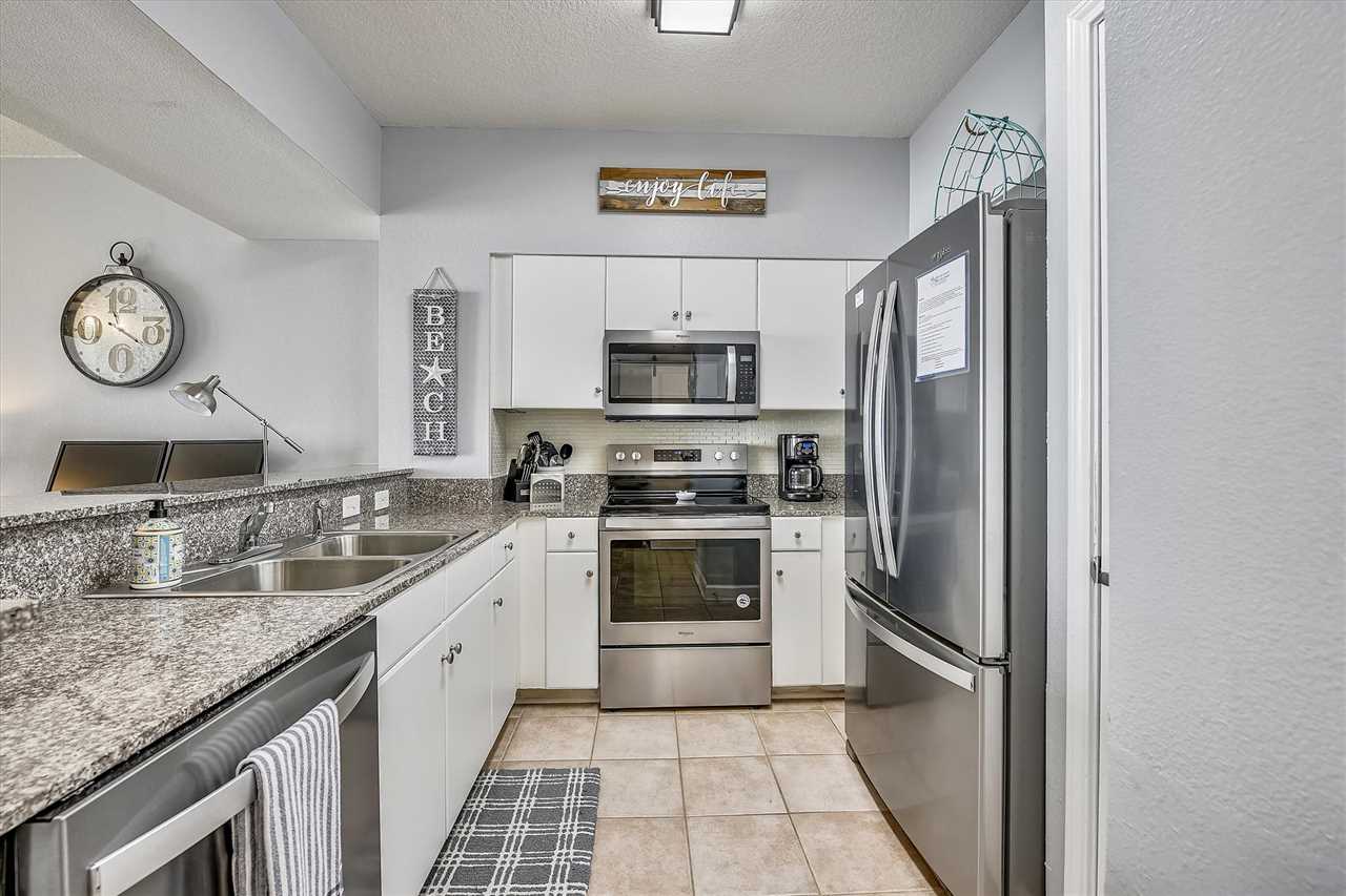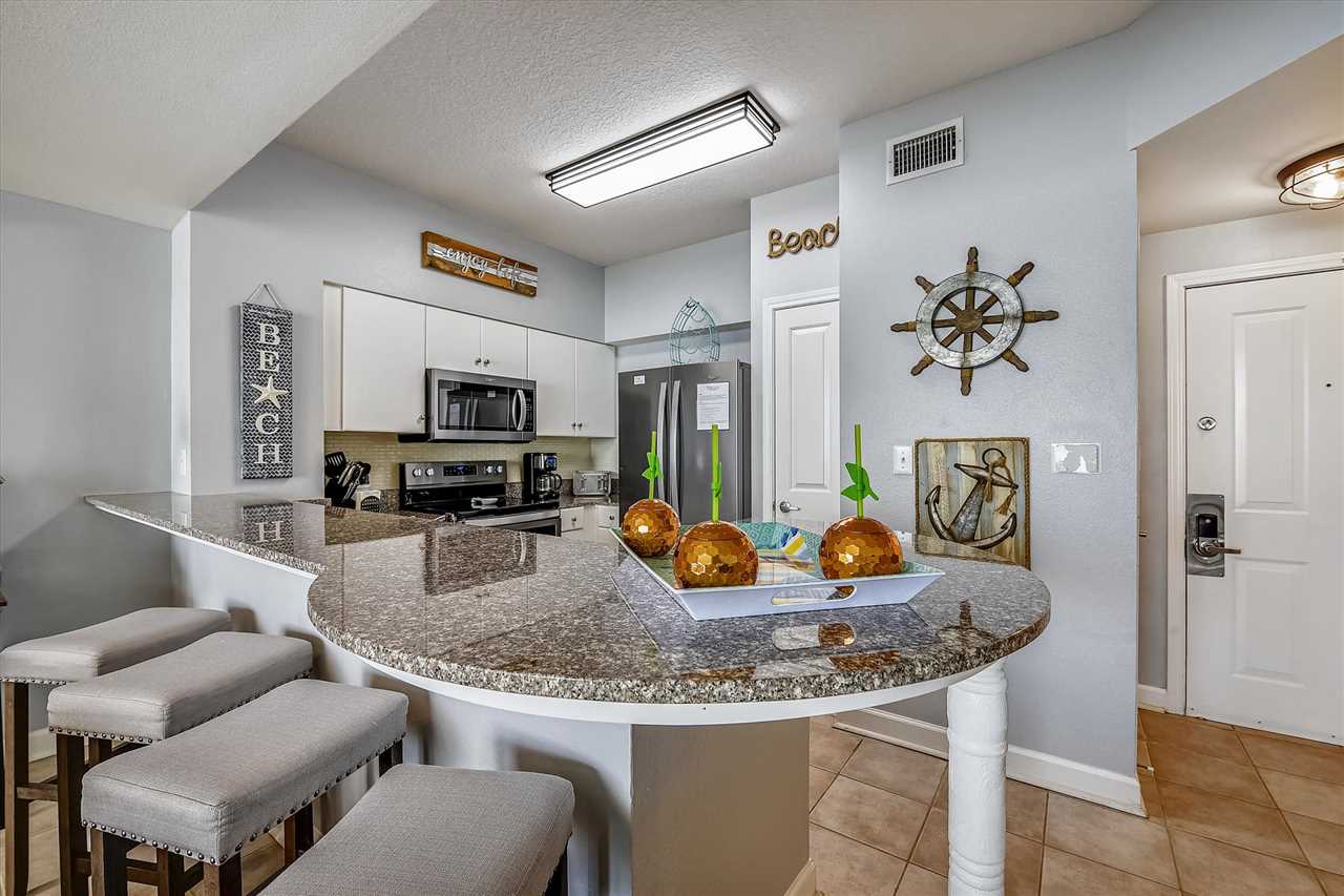 The kitchen is equipped with modern stainless appliances, including a fridge/freezer, oven/stove, microwave, and dishwasher. The cabinets are stocked with cups, plates, utensils, cookware, and most pots/pans one would use to prepare a tasty meal. The bar has seating for 4. There is also a high-top dining table for 2.