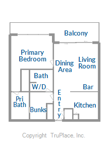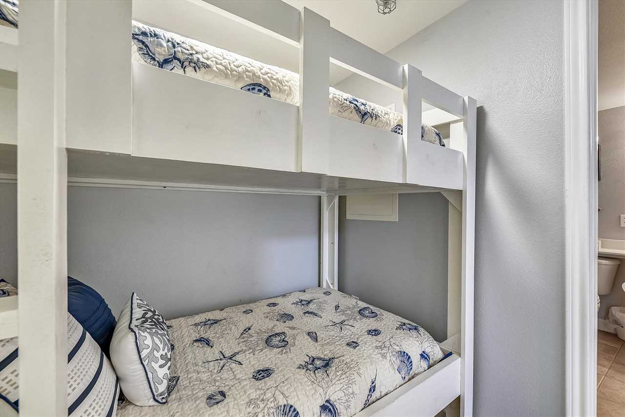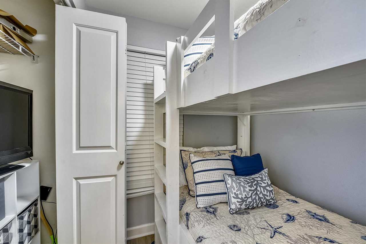 The bunk room has a barn door that creates privacy for the kids. The bunk room has a sturdy twin/twin bunk bed with a closet. There is a private bathroom with a full-sized washer/dryer.