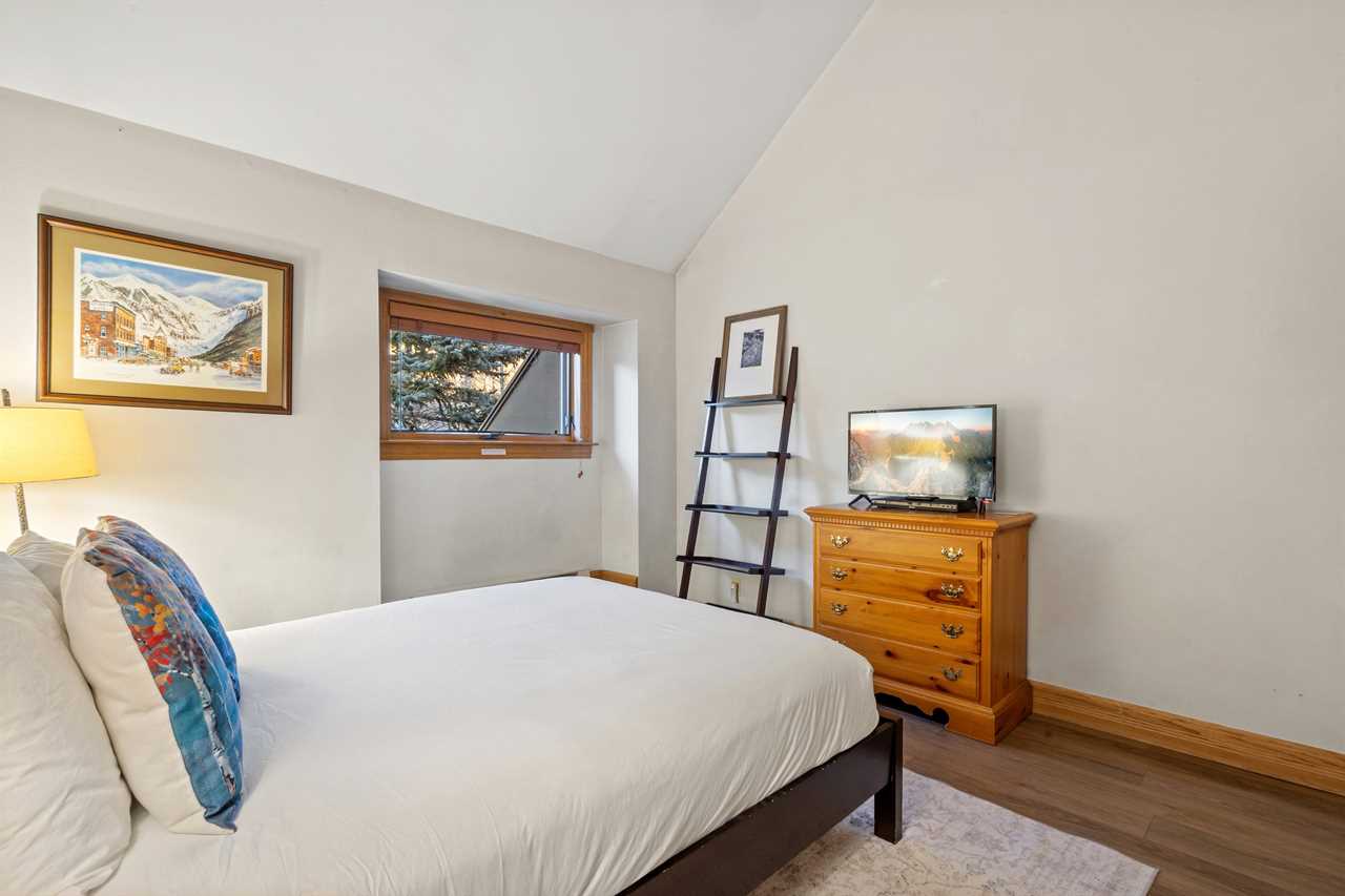 Cimarron Lodge 31 is a charming 2 bedroom, 2 bathroom 1,020 square foot condo at the base of Chair 7 in Telluride town. This spacious condo offers lots of light with large picture windows in the living room. The open first floor plan includes a large sitting area with a flat-screen TV, dining area and fully equipped kitchen. A queen bedroom and bathroom are also located on the first floor, while upstairs, the large king master bedroom has an en suite bathroom. If you're looking for mountain views, the master bedroom opens to a spacious private balcony overlooking the ski area and lift 7. An in-unit washer/dryer, covered parking space (clearance 6'8"), and complex hot tubs round out the reasons this is a great place to stay! (LIT does not manage hot tub closures, cleanings or maintenance. We cannot be held responsible for refunds for closures during your stay.)