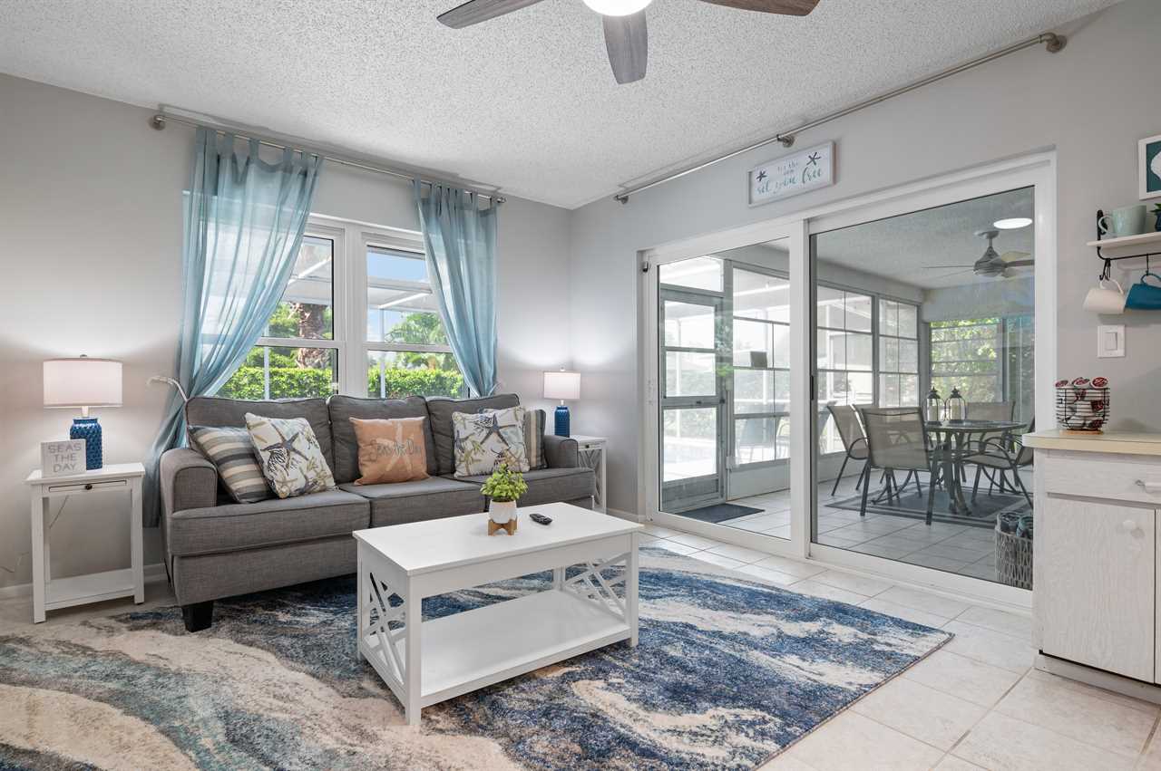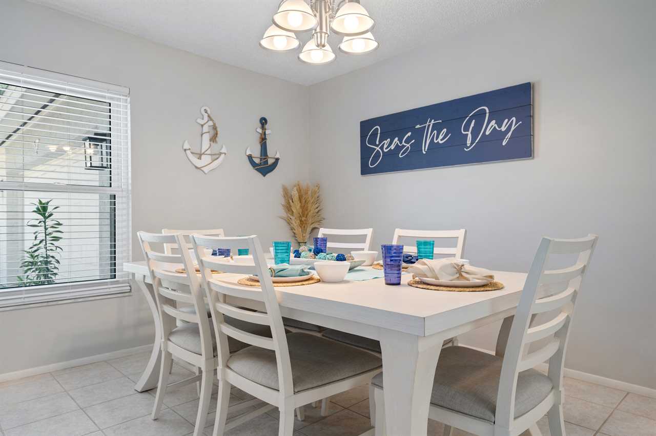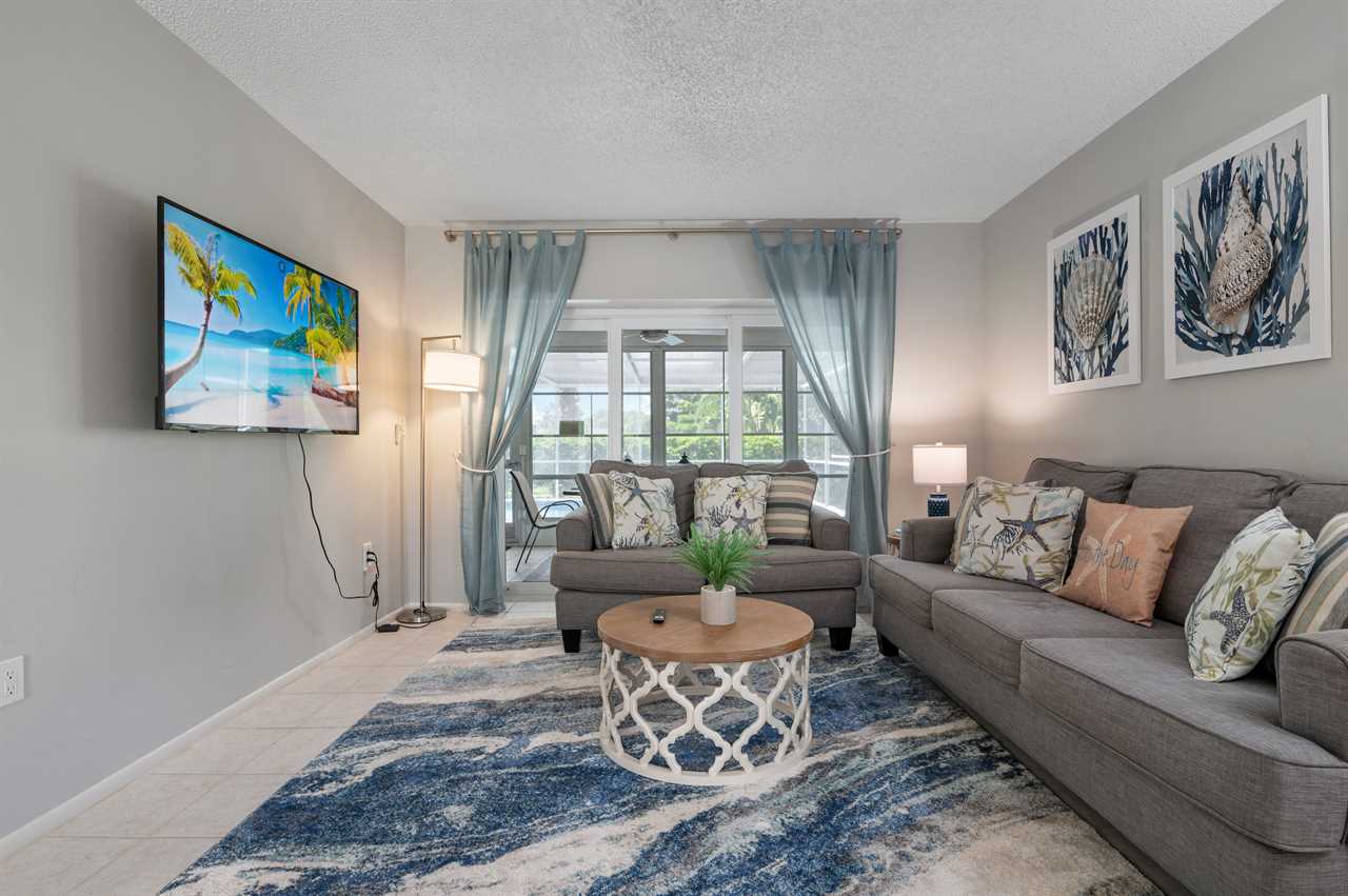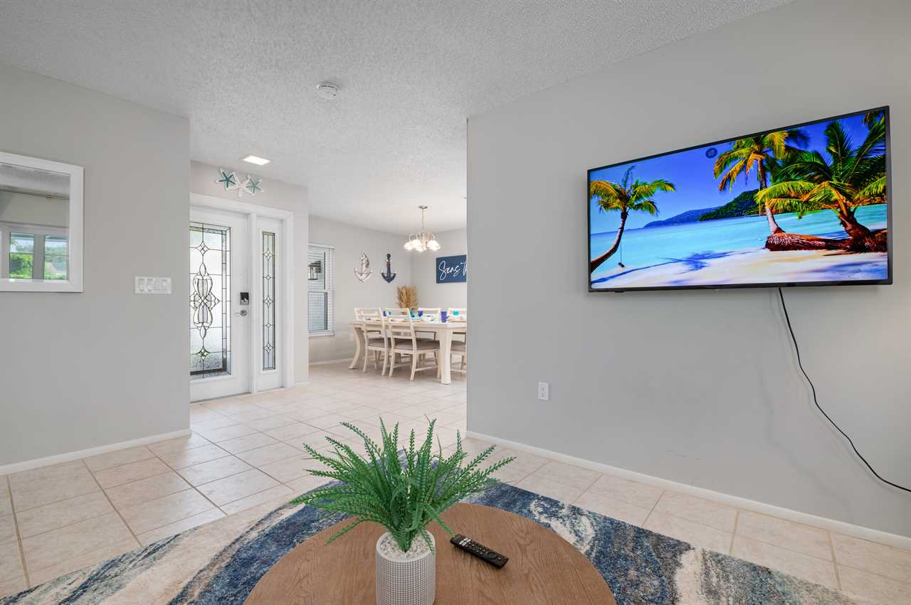 Seas The Day is located in Northwest Bradenton just off the main road of 75th St W. The property is located on a corner lot offering a large horseshoe driveway with plenty of space for parking. The inside was decorated with a coastal feel in mind and offers everything you need to make it your home base while in Florida! When walking in the front door you have a living room with large sliding glass doors overlooking the Florida room and pool. The living room offers a large flat screen smart tv. The additional living room is located through the kitchen and offers views of the pool deck and Florida room from it as well and an additional spot to hang out including another flat screen smart tv.