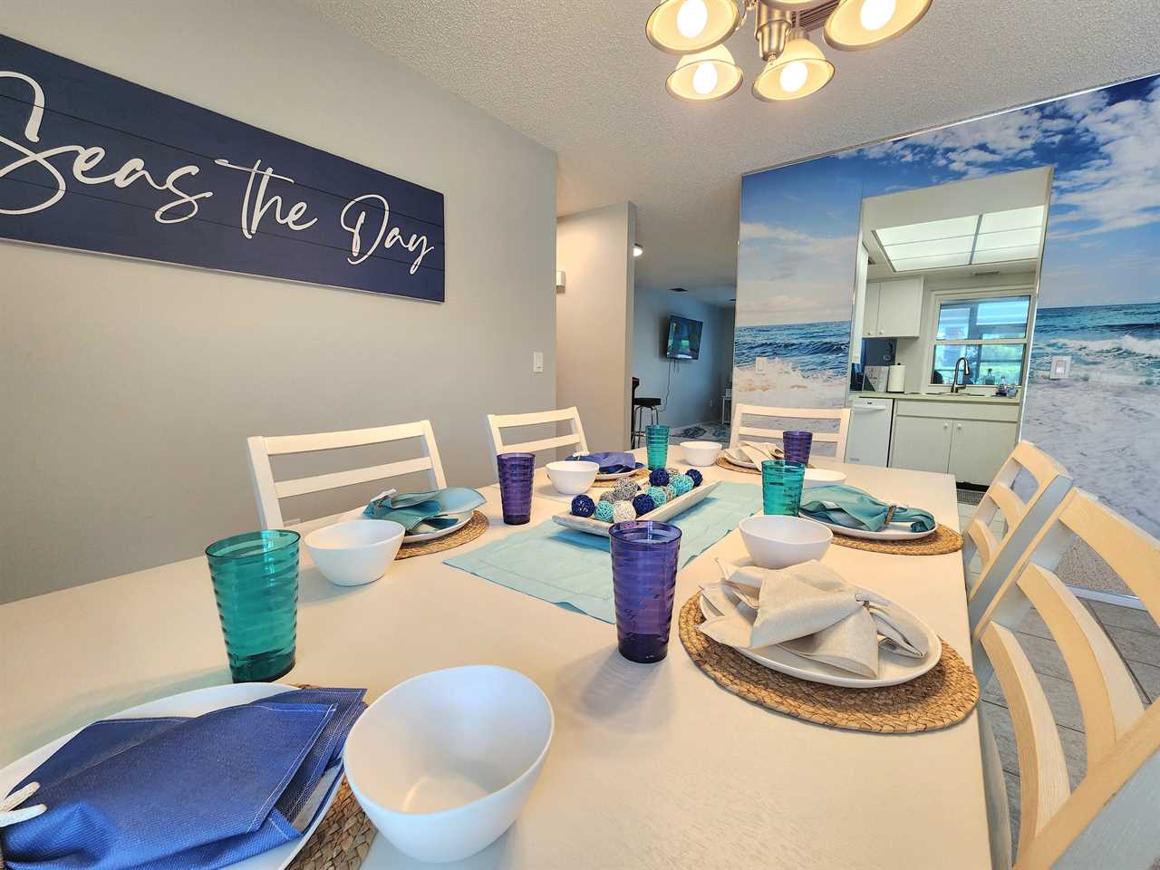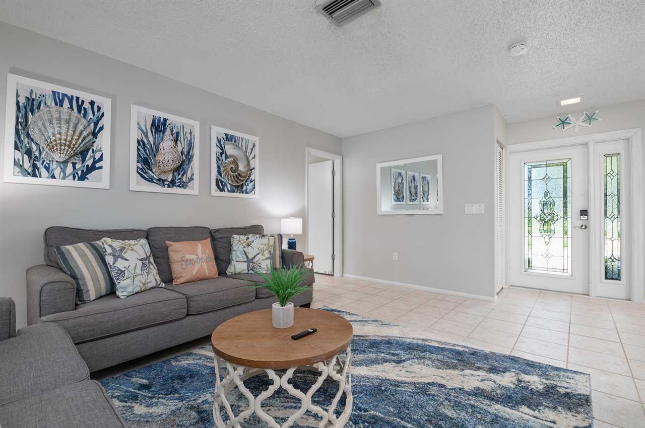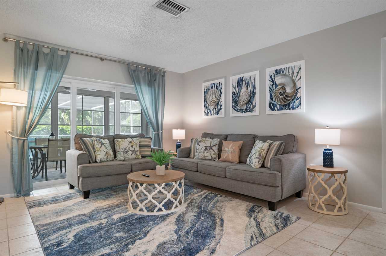Seas The Day is located in Northwest Bradenton just off the main road of 75th St W. The property is located on a corner lot offering a large horseshoe driveway with plenty of space for parking. The inside was decorated with a coastal feel in mind and offers everything you need to make it your home base while in Florida! When walking in the front door you have a living room with large sliding glass doors overlooking the Florida room and pool. The living room offers a large flat screen smart tv. The additional living room is located through the kitchen and offers views of the pool deck and Florida room from it as well and an additional spot to hang out including another flat screen smart tv.