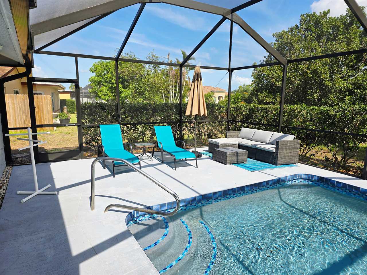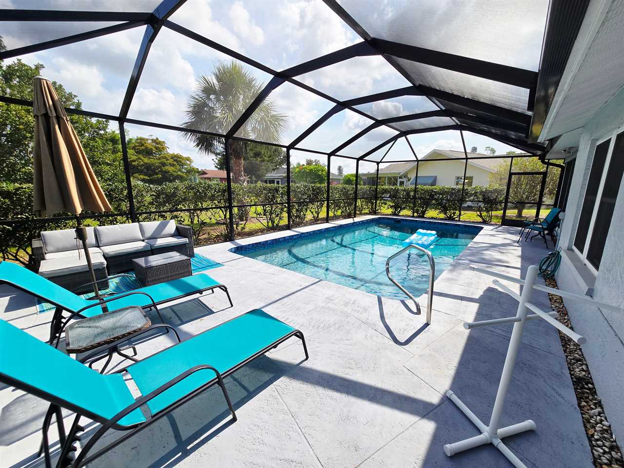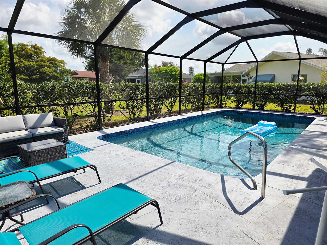 The back has a screened-in pool area with a bar area for seating as well as a few loungers for enjoying the Florida Sun! Enjoy cooking on the grill? We also have one available for use located in the back.