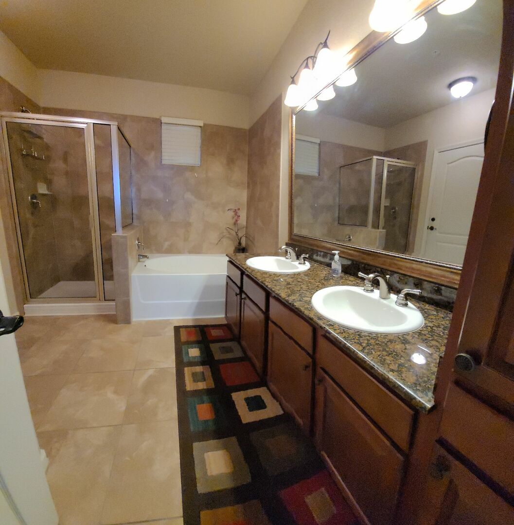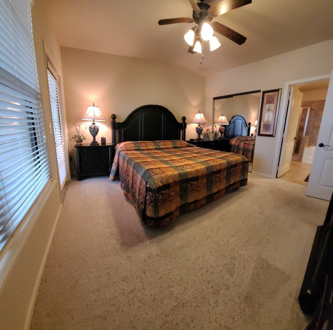 The master suite has a King-size bed, a flat screen TV and direct access out to the patio. It also has a spacious and luxurious en suite bathroom with a bath, a separate shower, twin sinks and granite tops.