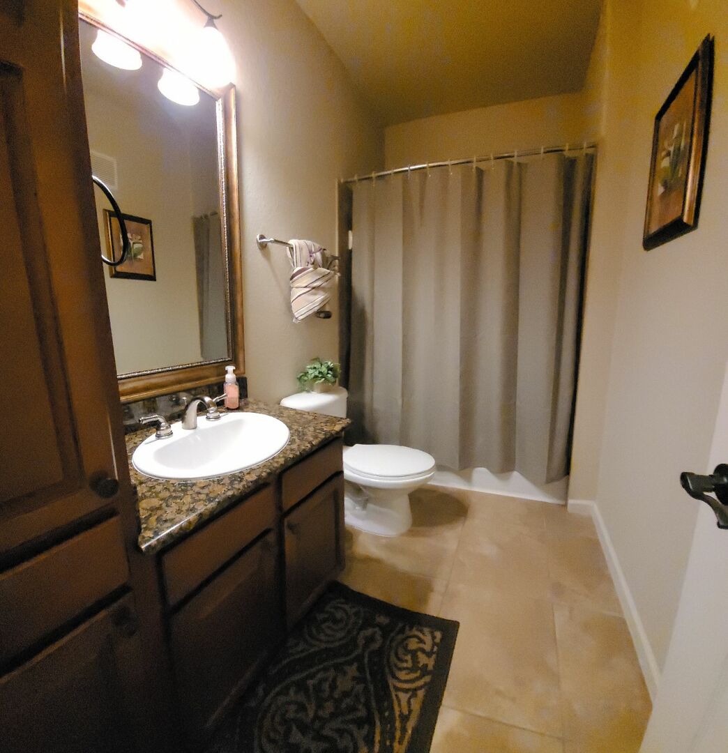 The second bedroom is at the front of the property and has 2 Twin size beds, flat screen tv, and an en suite bathroom with a bath/shower.