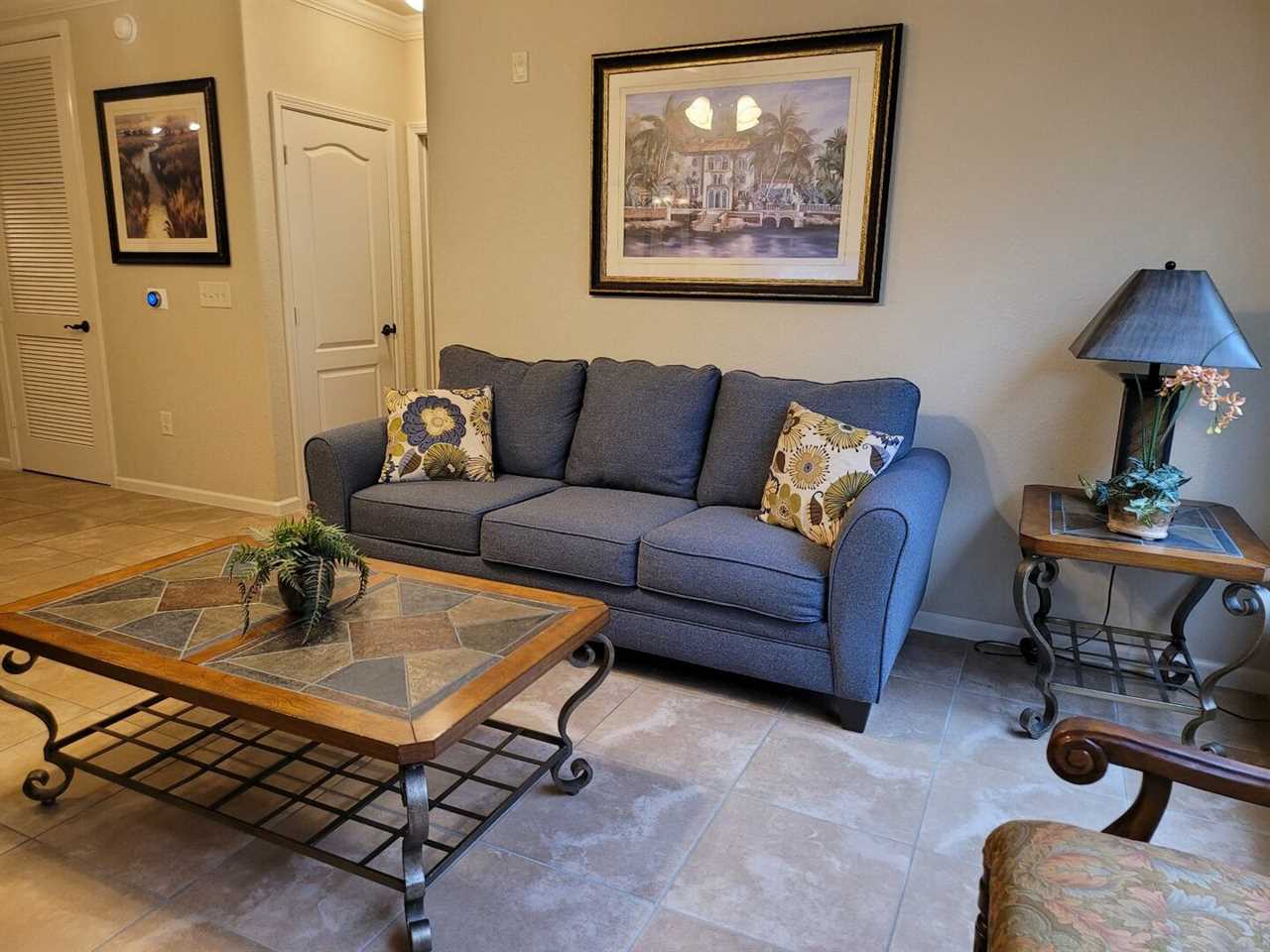 This beautiful 3-bedroom, 3-bathroom condo is located on the second floor with easy access via the elevators or stairs. It has a fully equipped kitchen, dining area and a private covered balcony that faces East and overlooks a pond and fountain.