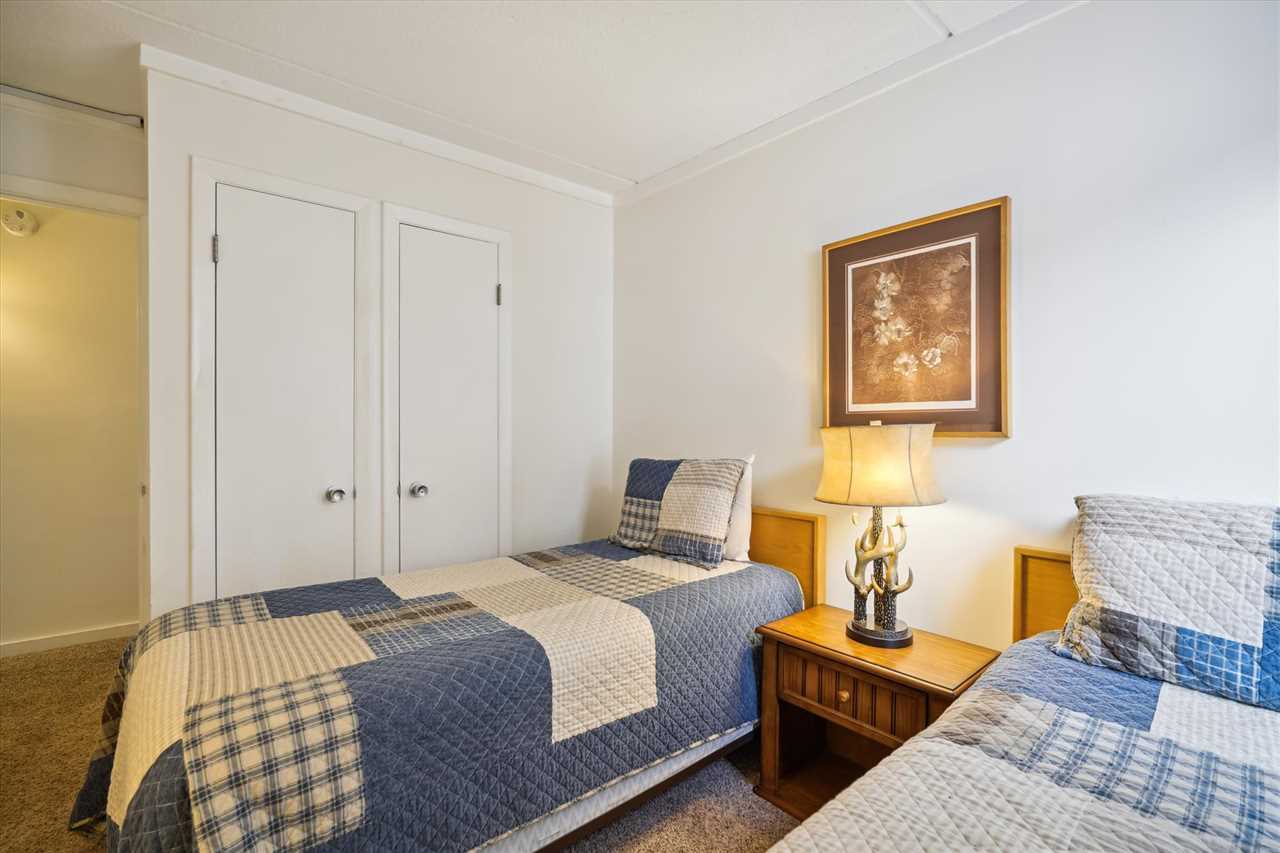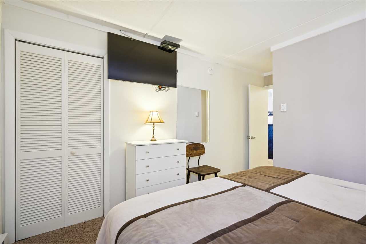 The condo features a bedroom with a King bed and a 32" flat-screen TV, complete with an attached shower bathroom. The second bedroom includes Twin beds and a 32" flat-screen TV, while the third bedroom offers a Queen bed and another 32" flat-screen TV. An additional full bathroom is also available for added convenience.